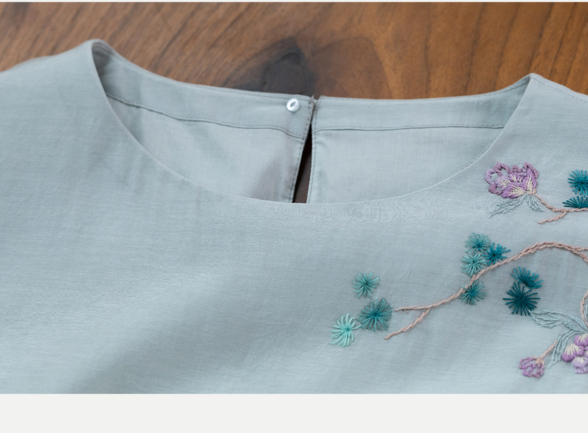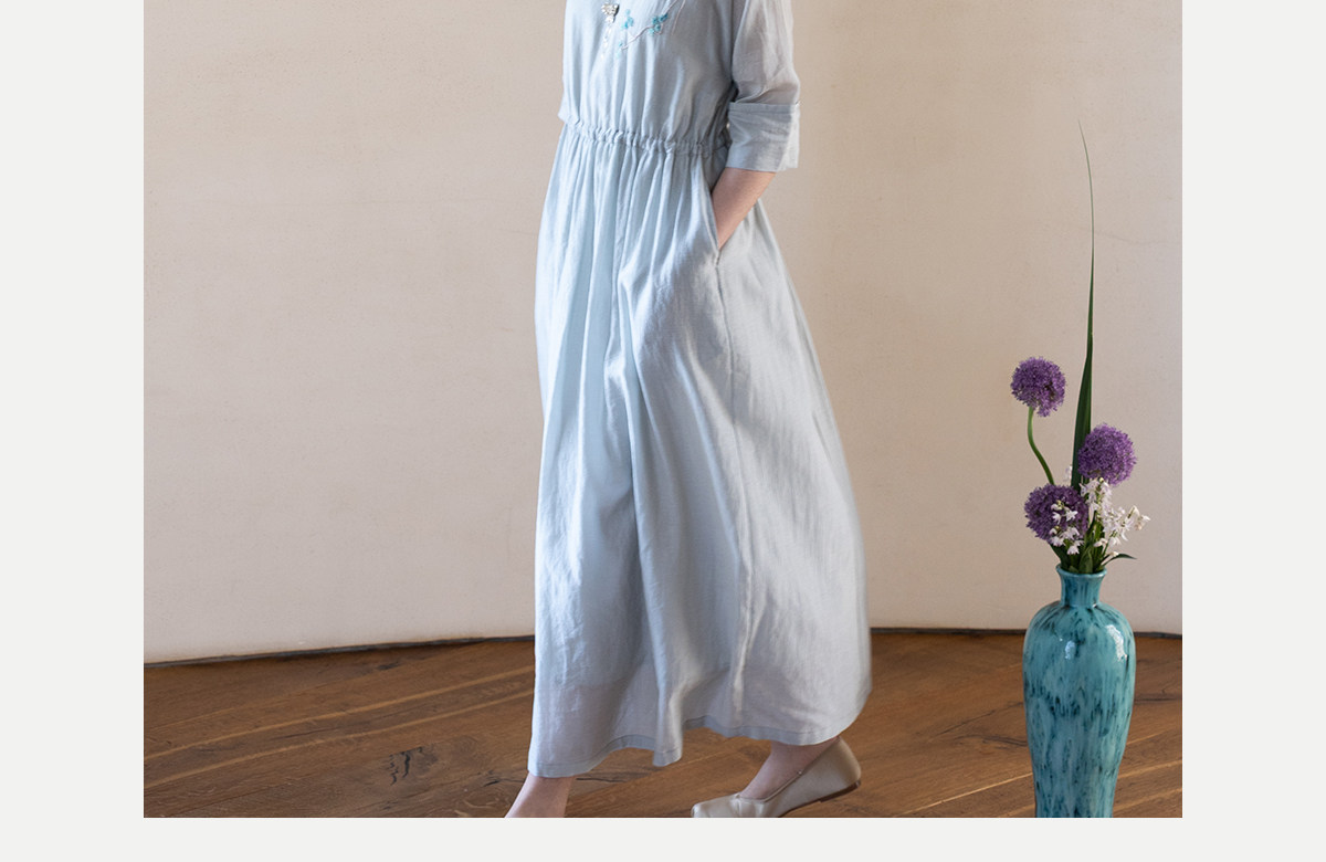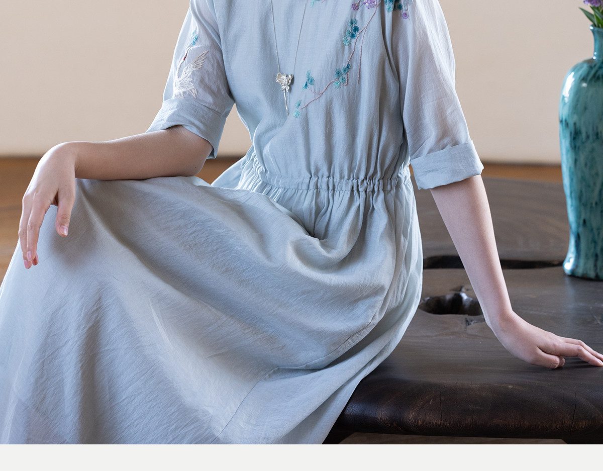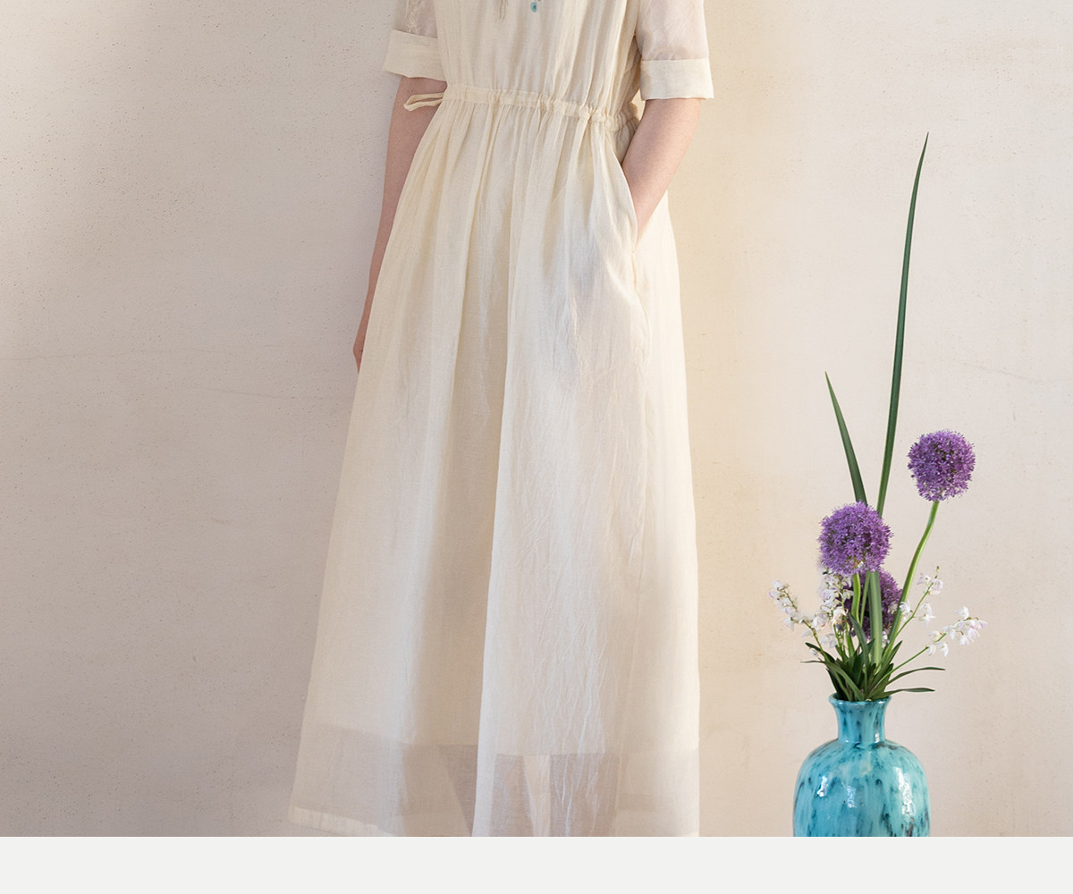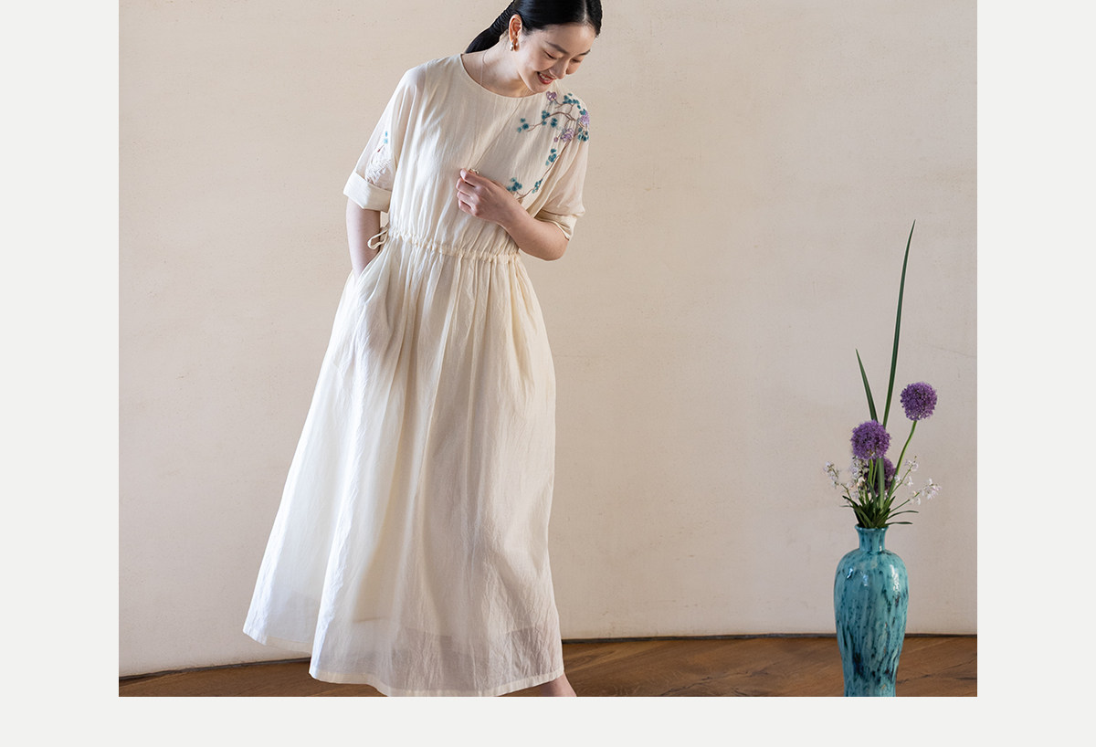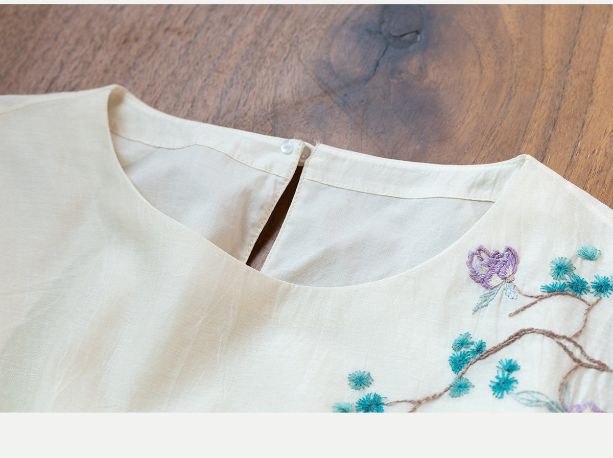 牧衣游原创 丝棉手工刺绣连衣裙女轻薄炒色宽松圆领文艺长裙 流夏