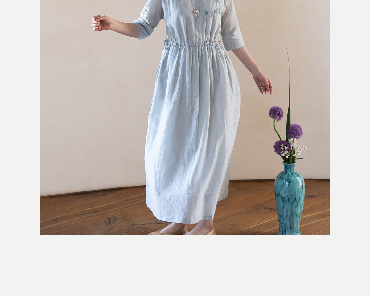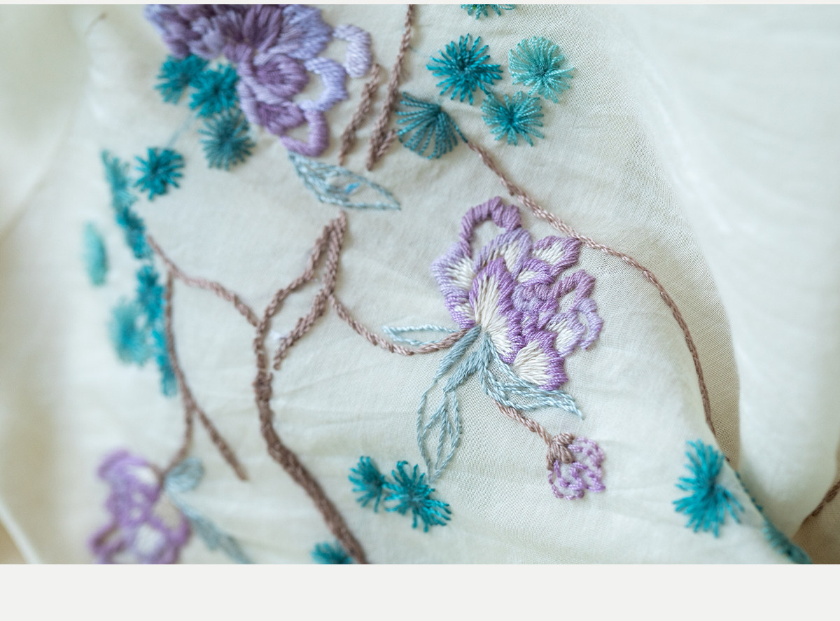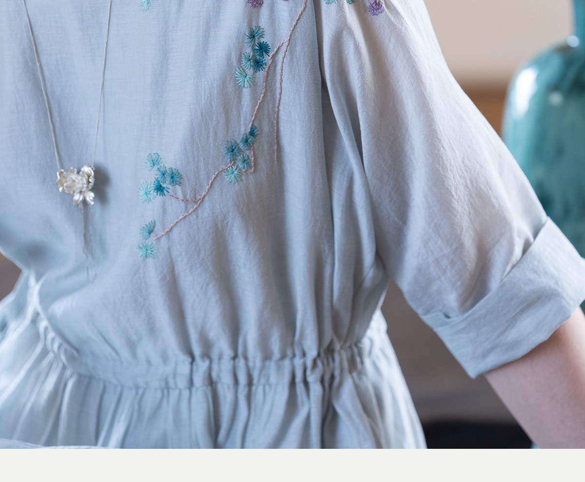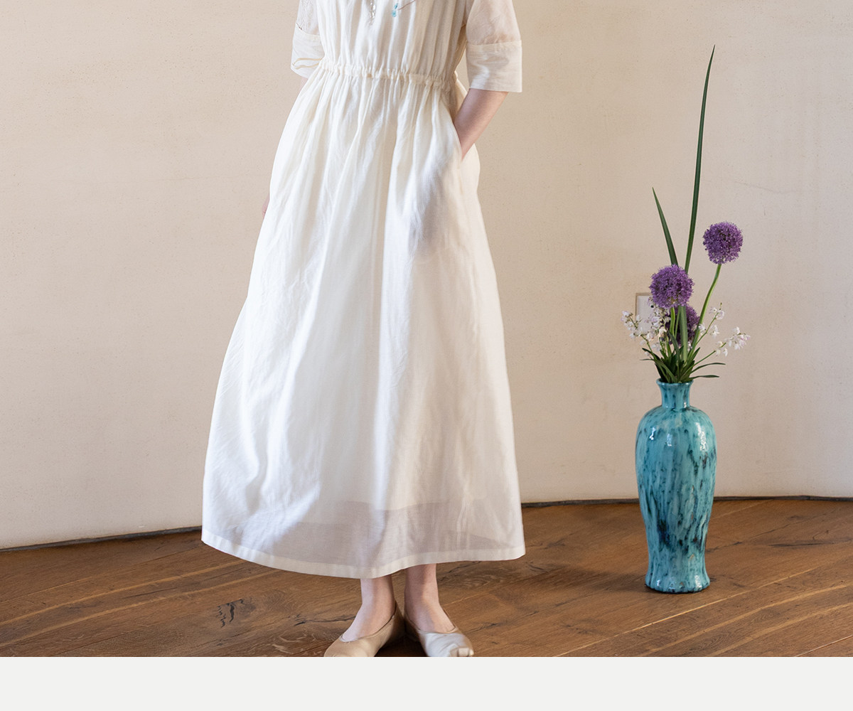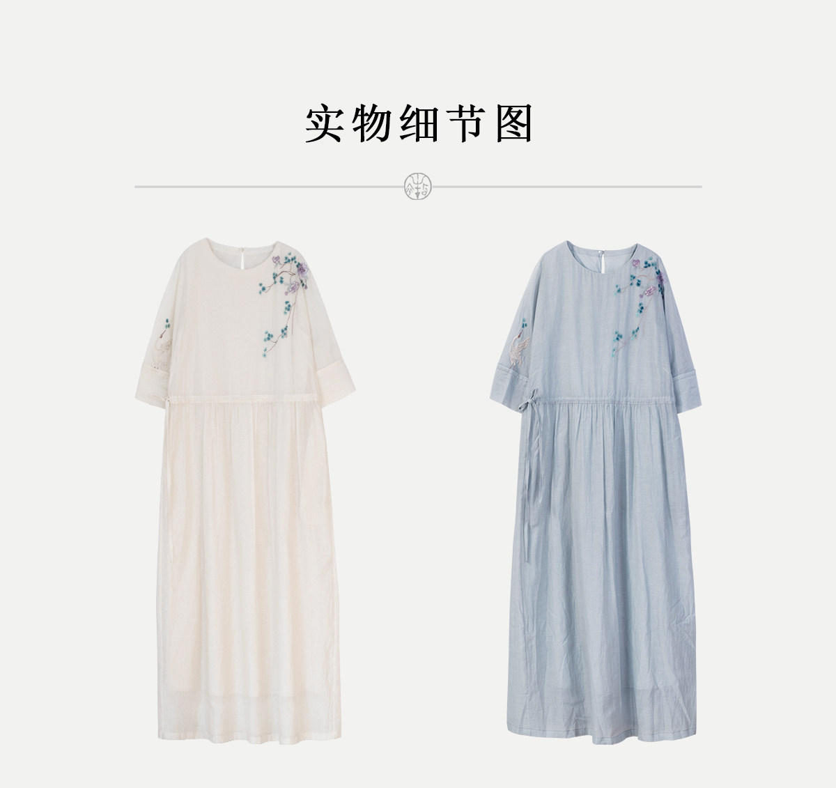牧衣游原创 丝棉手工刺绣连衣裙女轻薄炒色宽松圆领文艺长裙 流夏