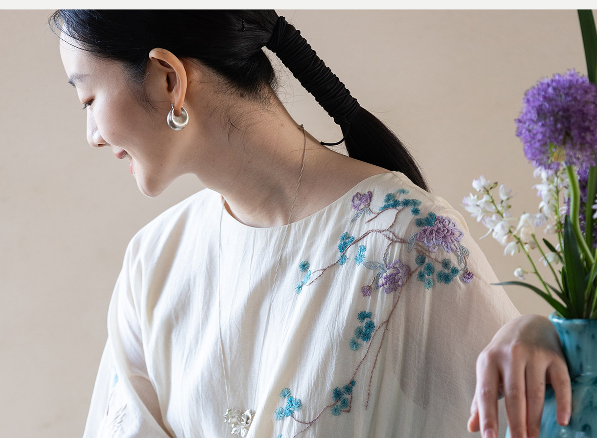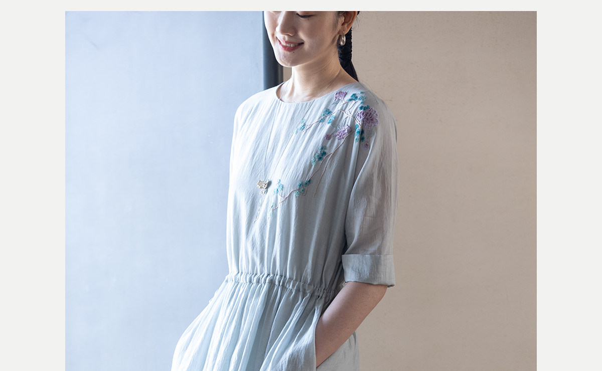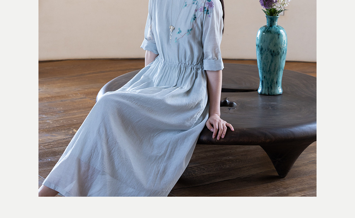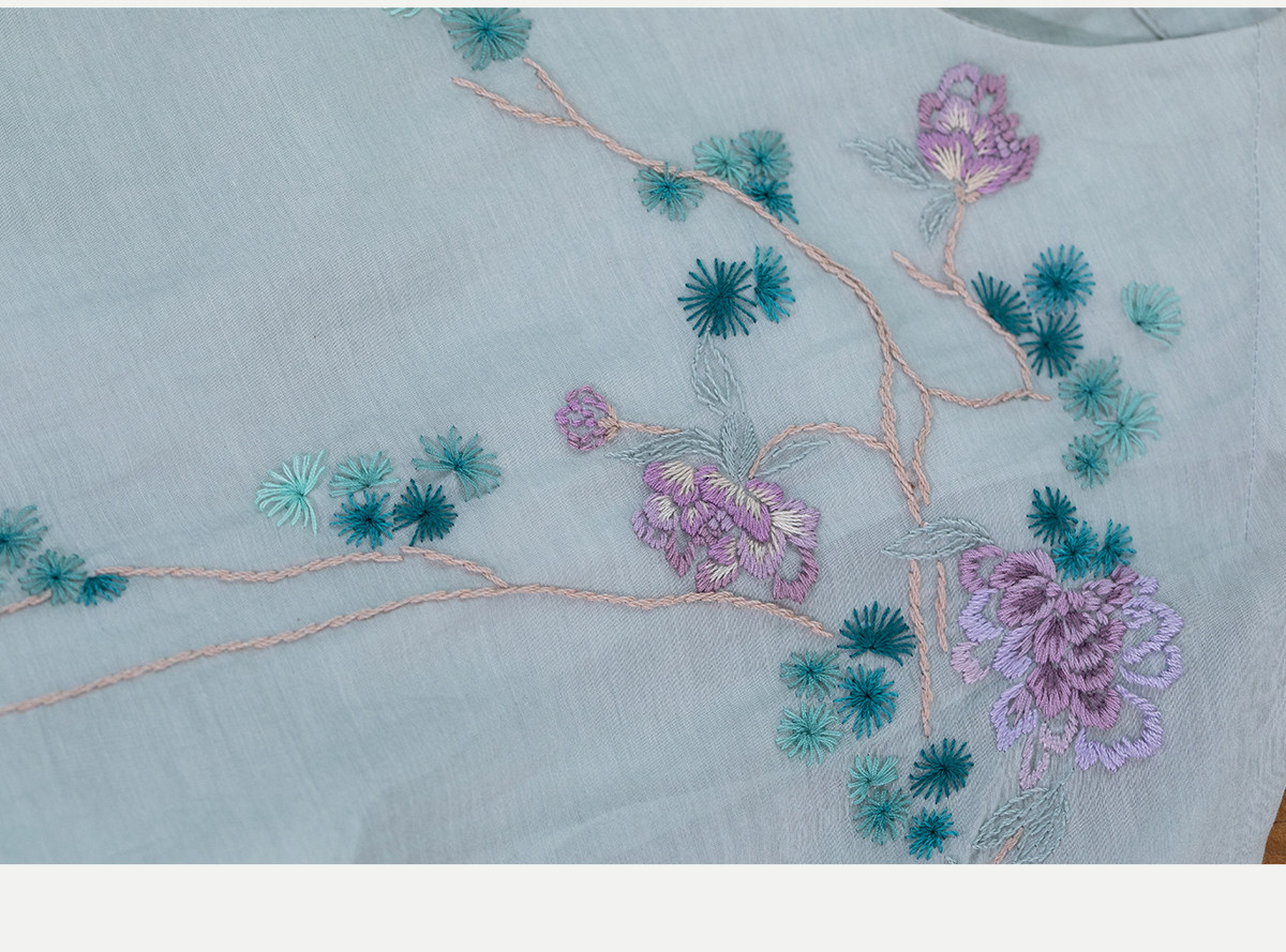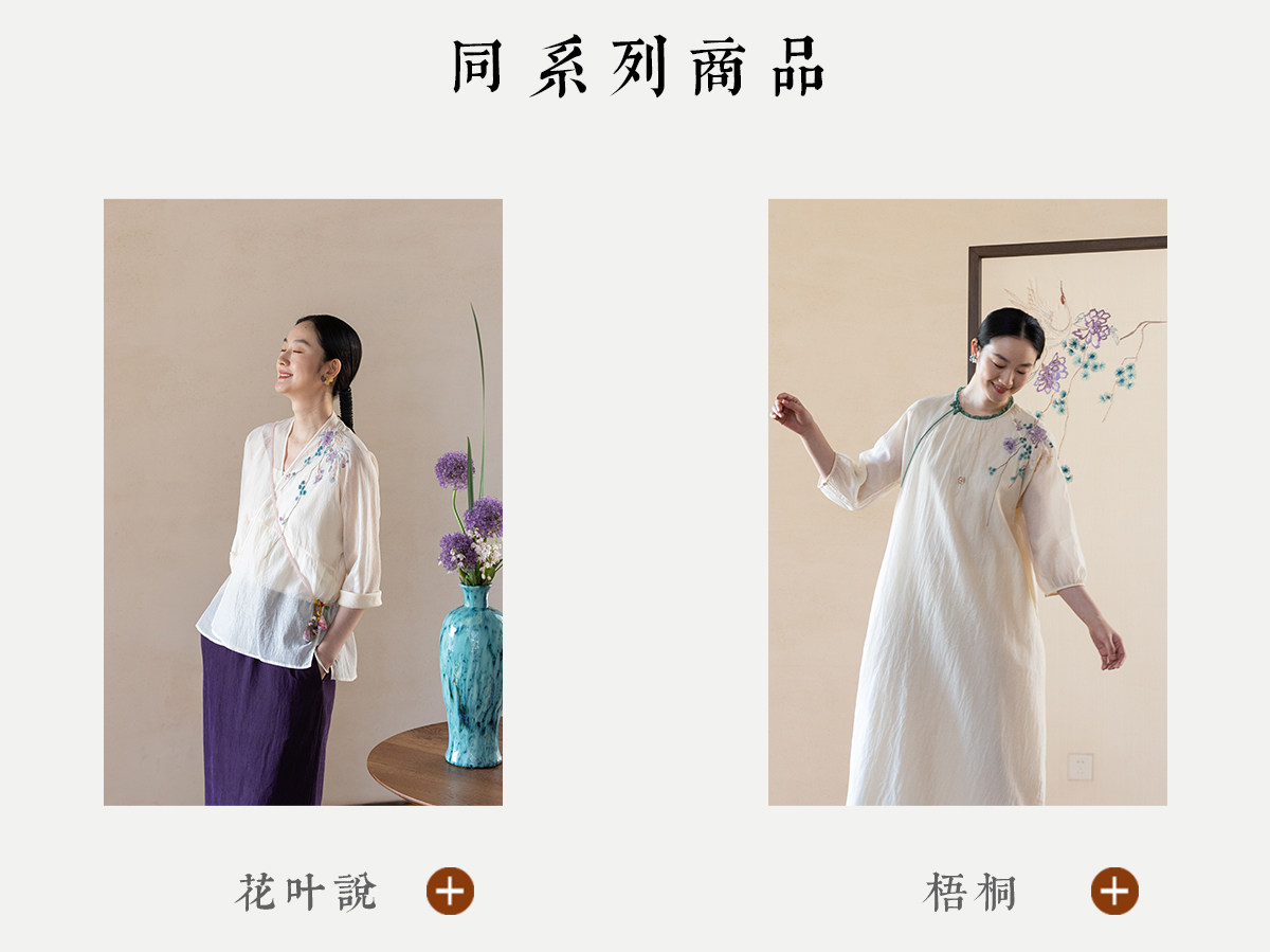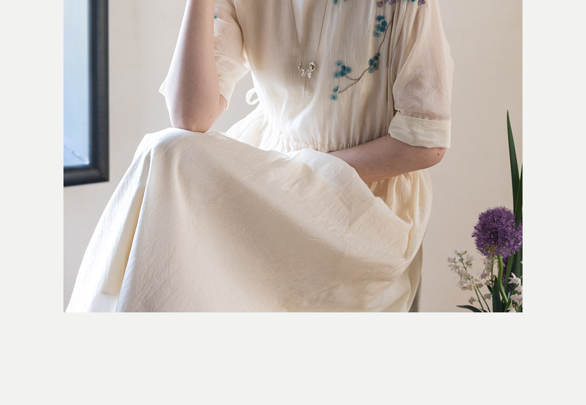 牧衣游原创 丝棉手工刺绣连衣裙女轻薄炒色宽松圆领文艺长裙 流夏