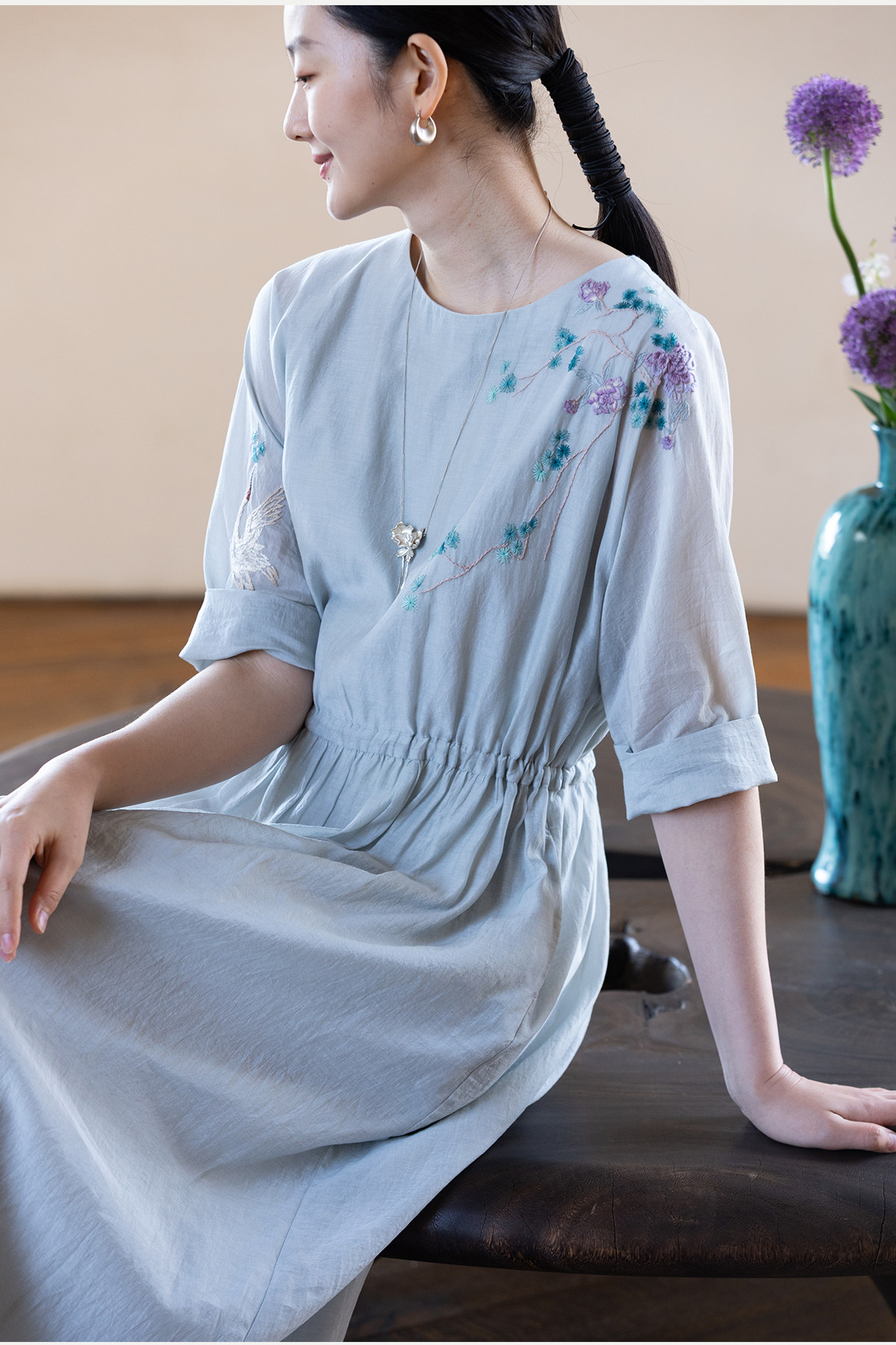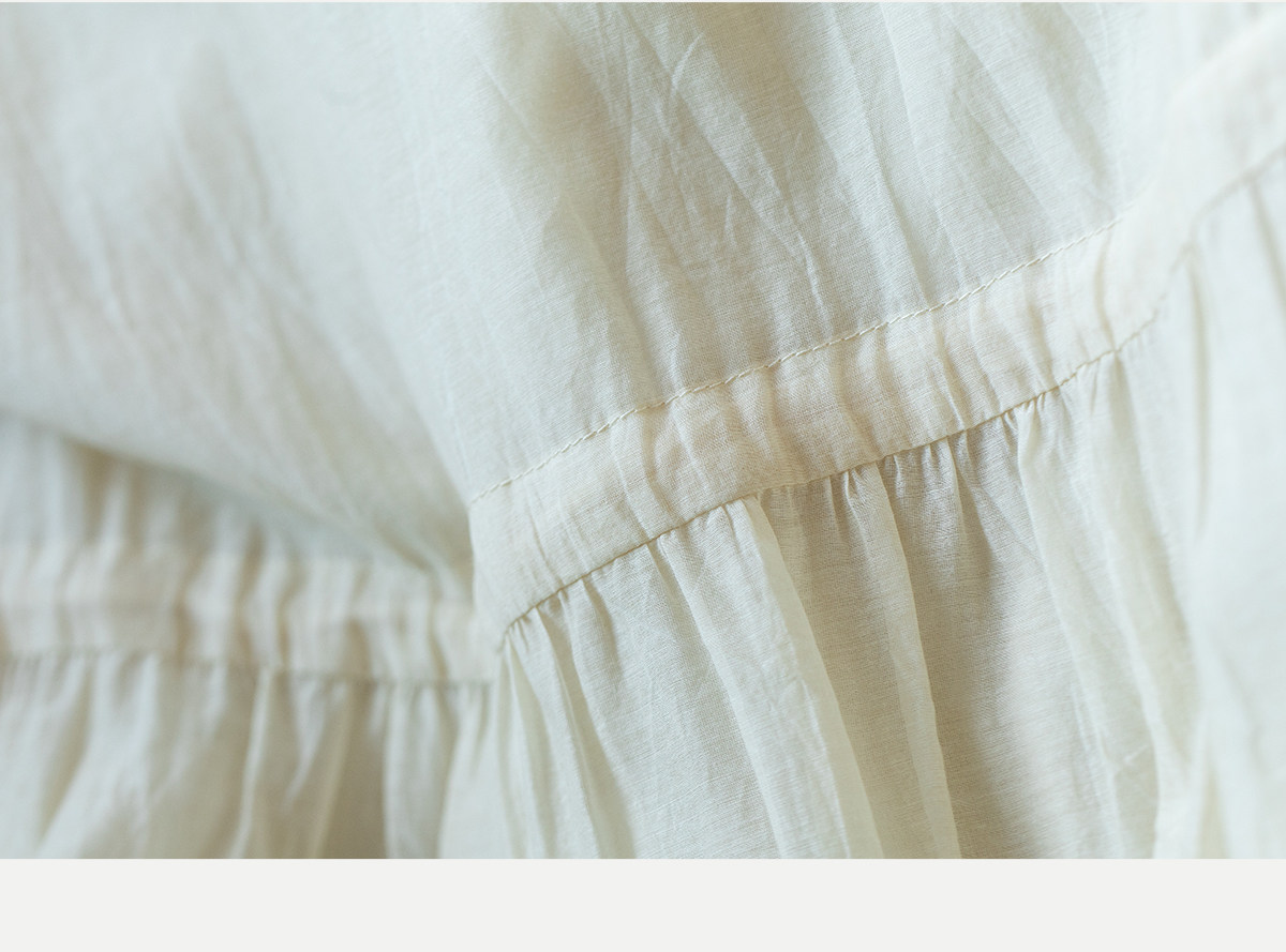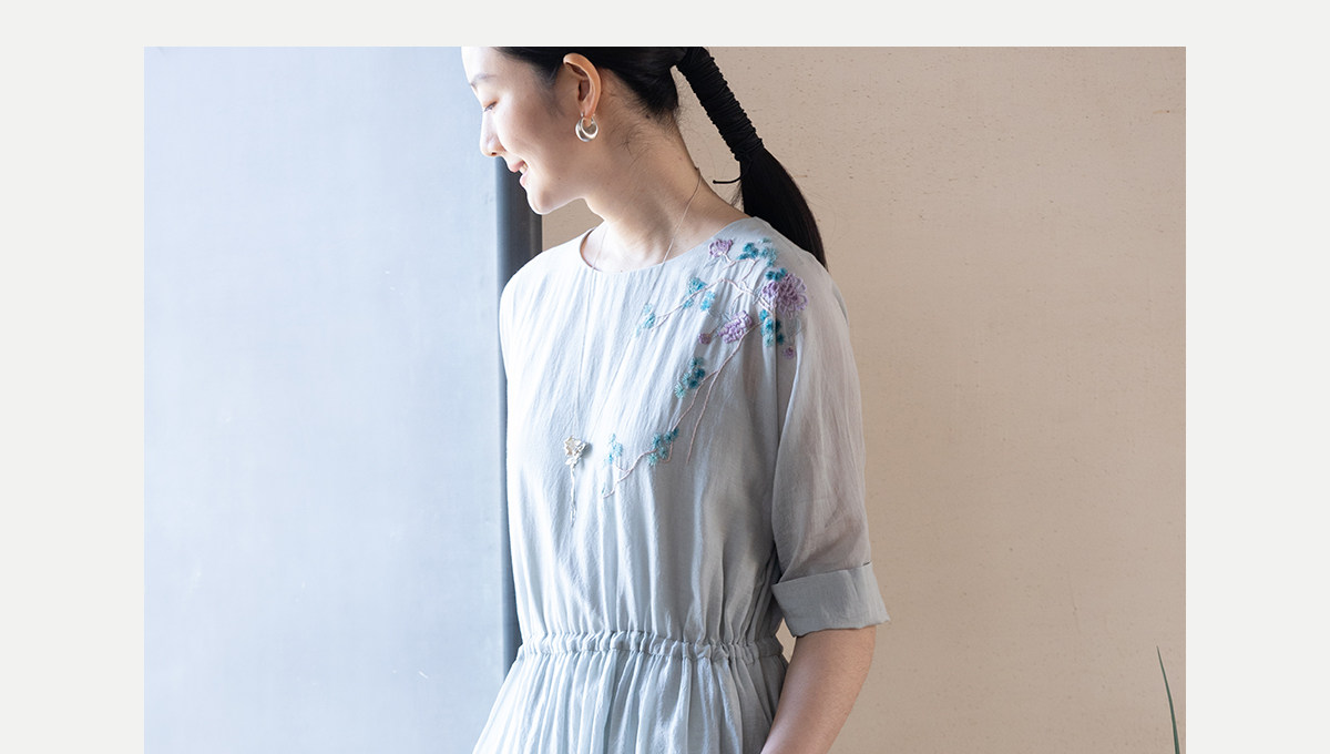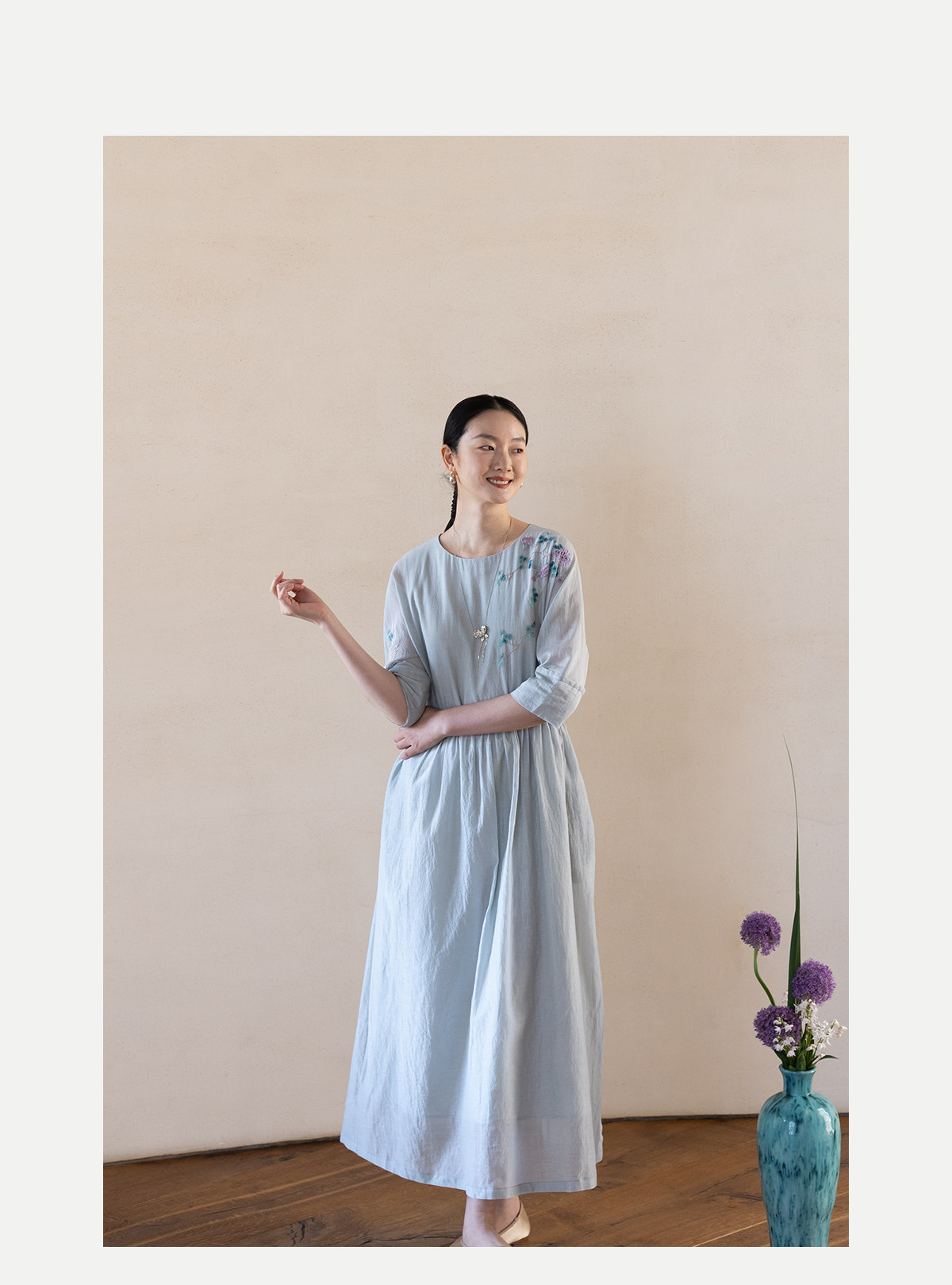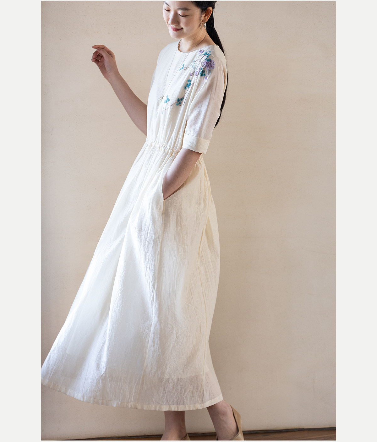 牧衣游原创 丝棉手工刺绣连衣裙女轻薄炒色宽松圆领文艺长裙 流夏