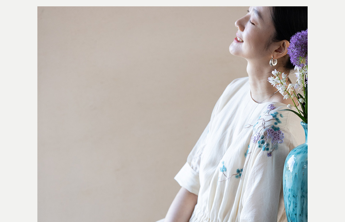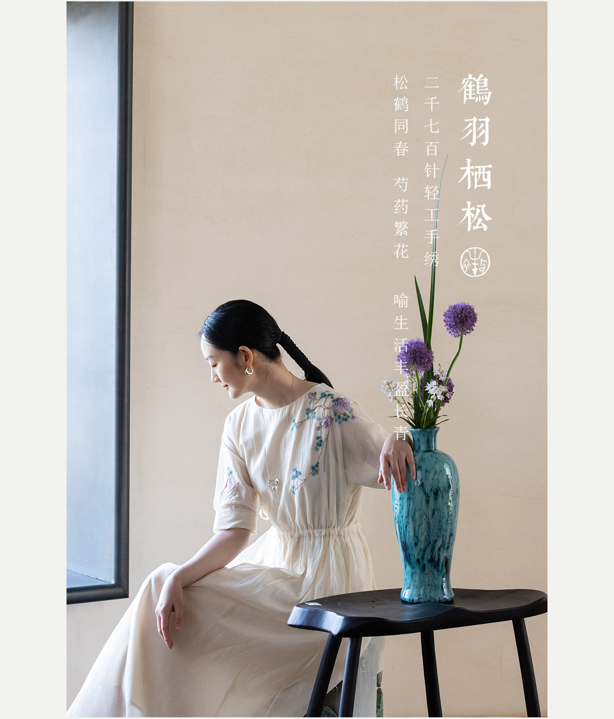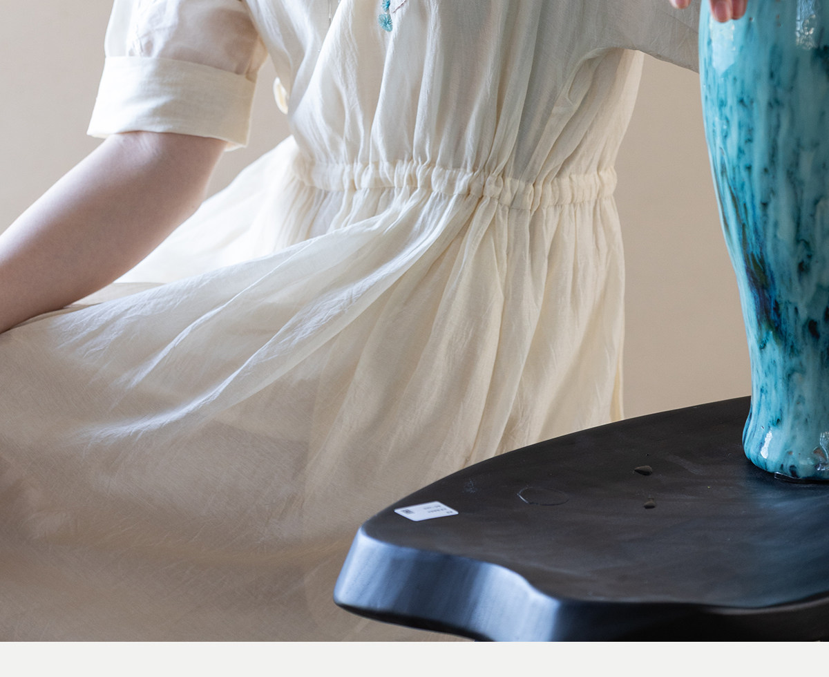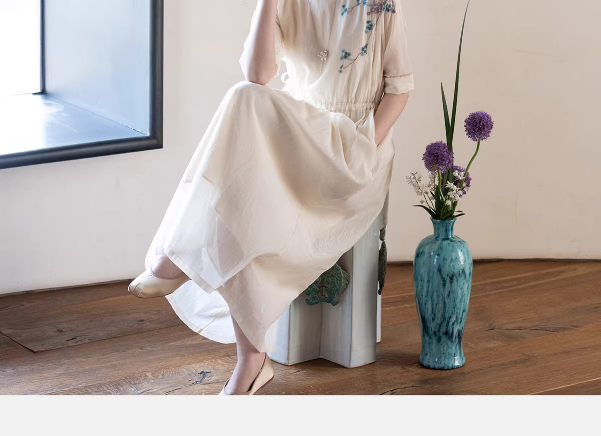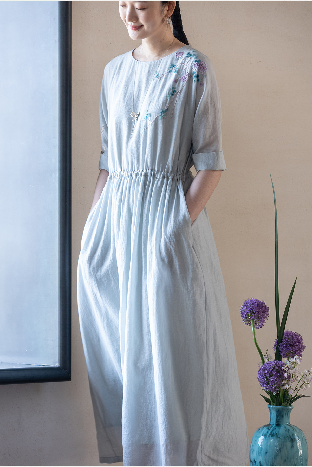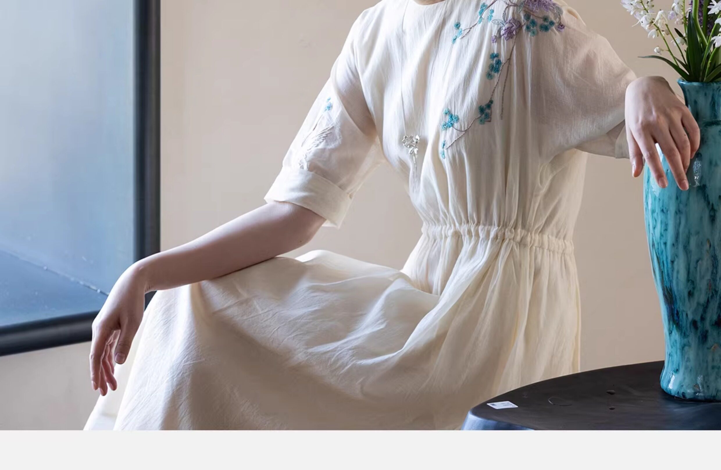 牧衣游原创 丝棉手工刺绣连衣裙女轻薄炒色宽松圆领文艺长裙 流夏