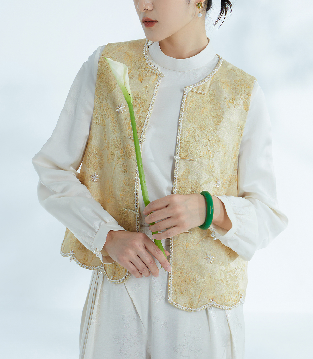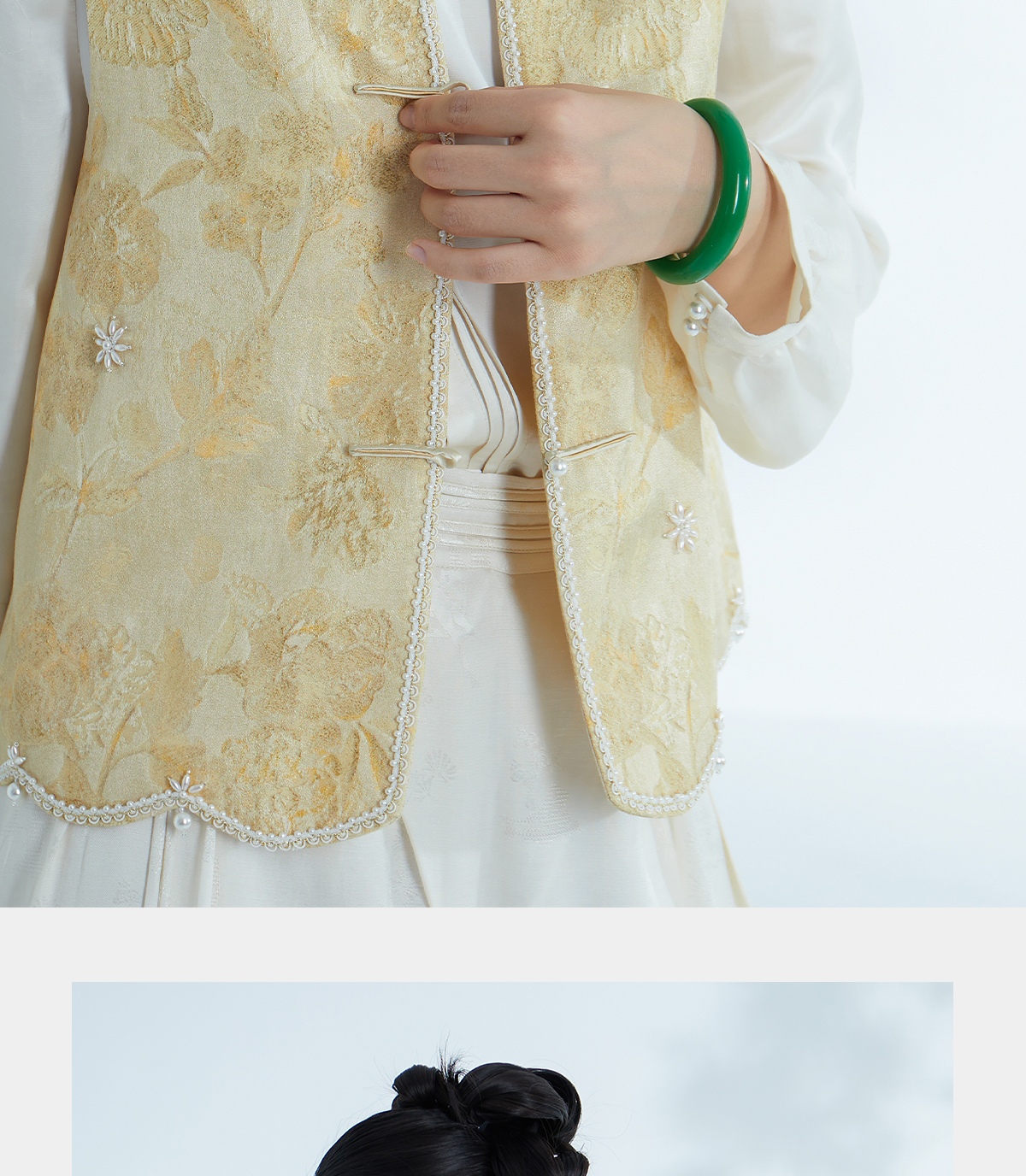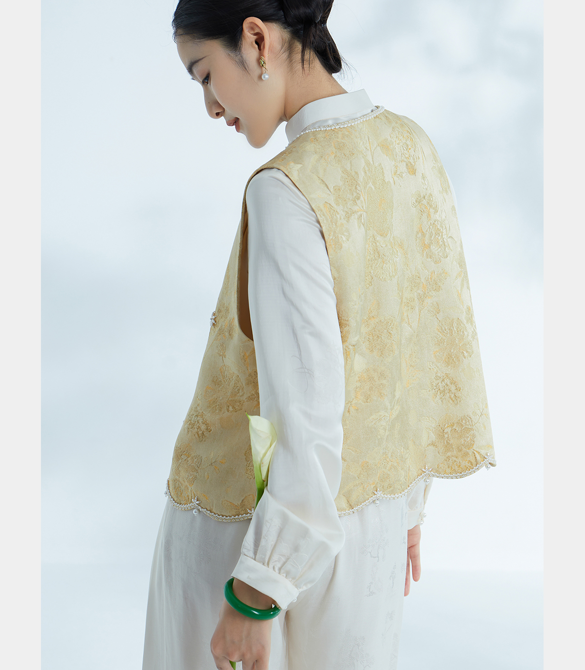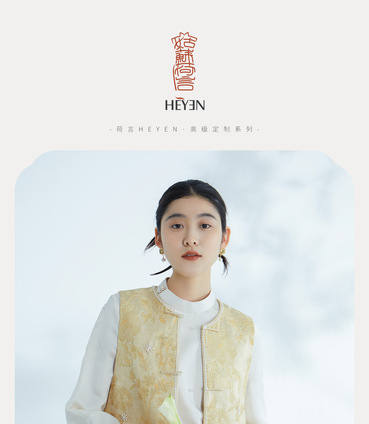 荷言HEYEN 晨澜 真丝羊毛蔷薇提花新中式马甲手工雪花钉珠波浪摆高定系列