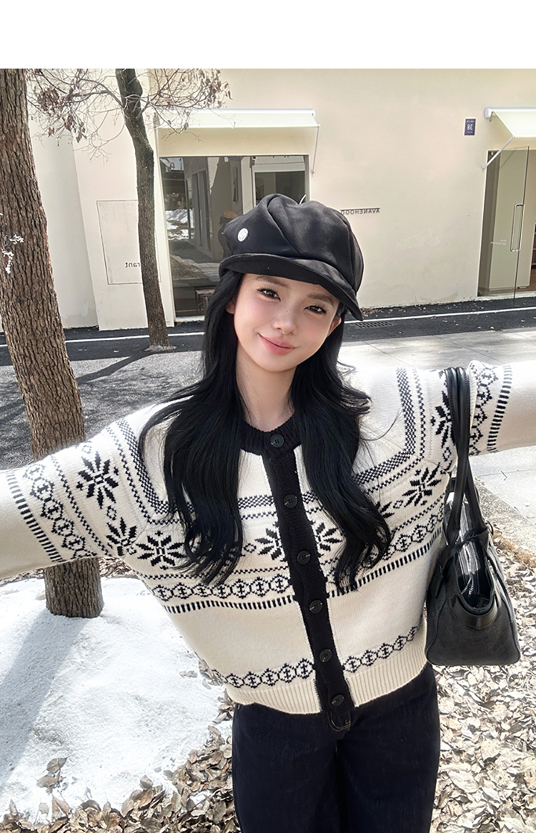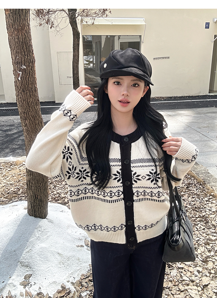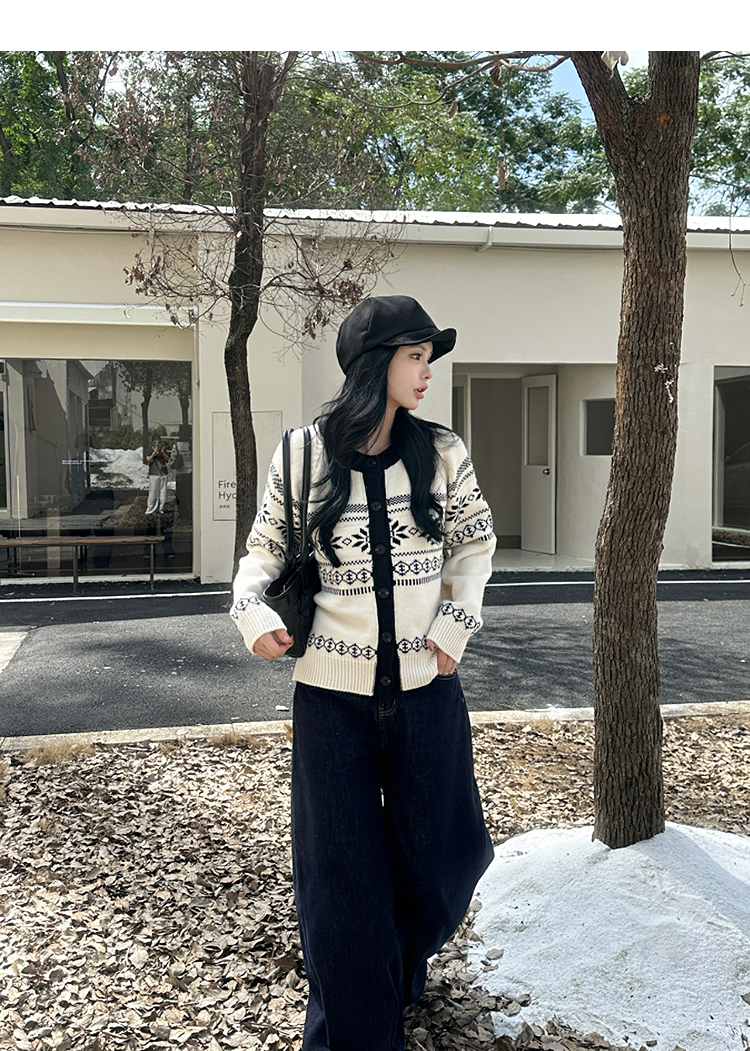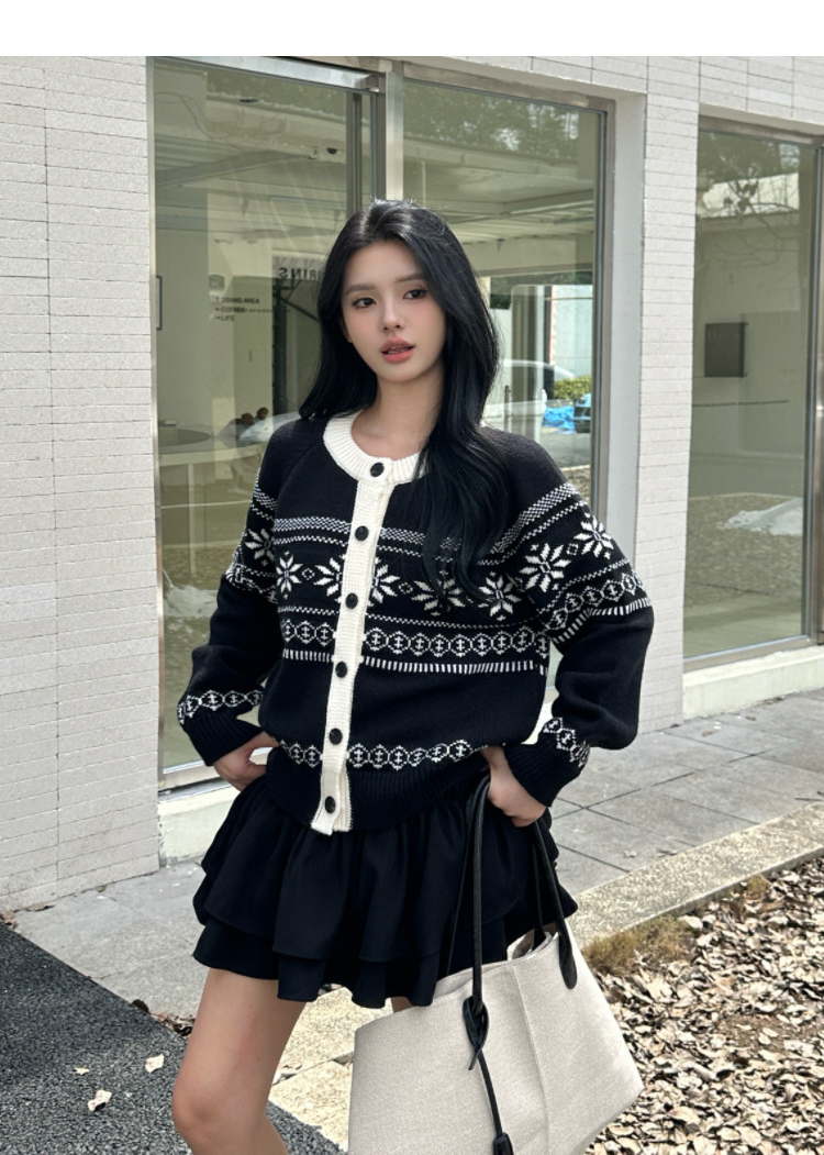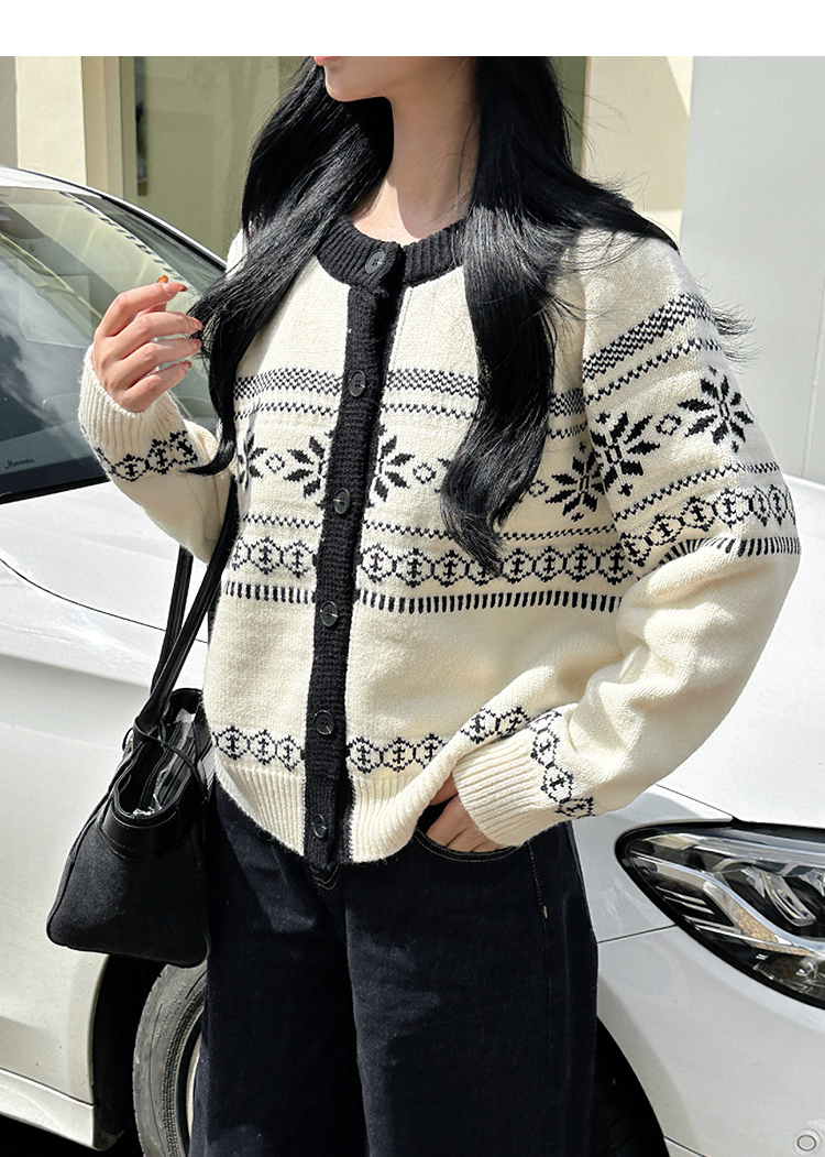 西遇毛衣开衫外套女冬季新款圆领黑白撞色费尔岛针织外套SS051733