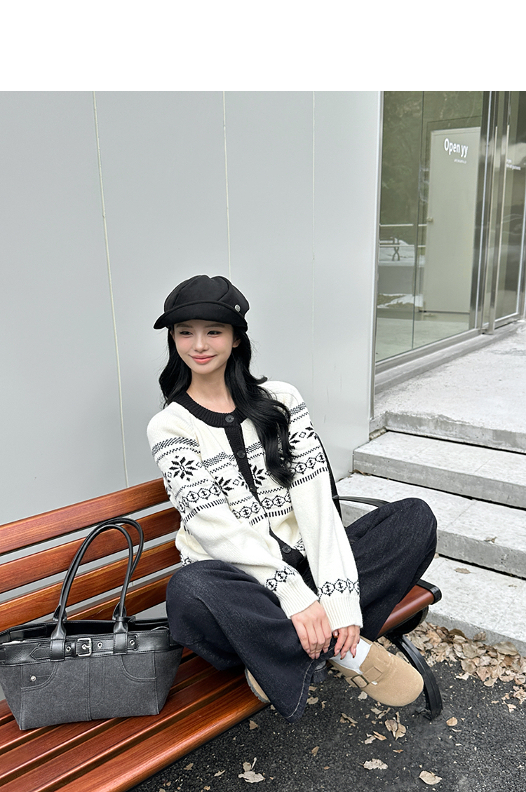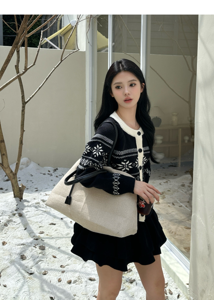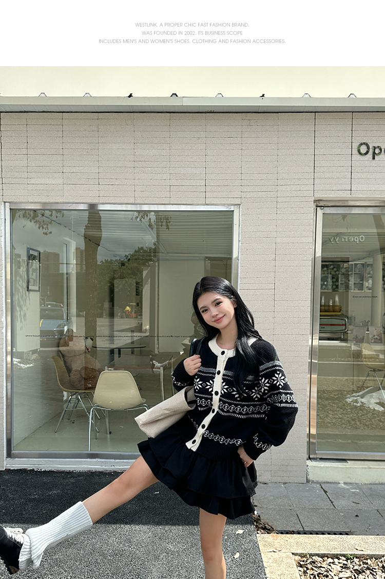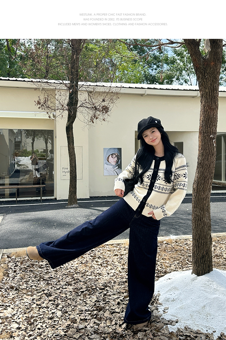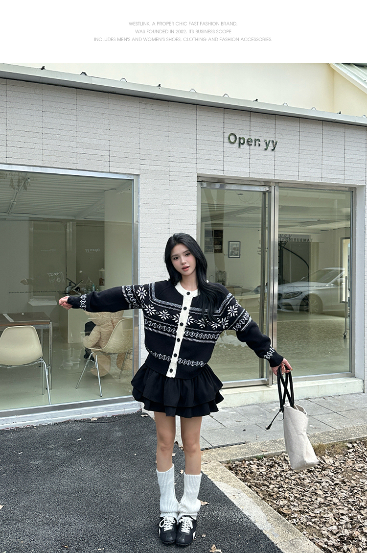 西遇毛衣开衫外套女冬季新款圆领黑白撞色费尔岛针织外套SS051733