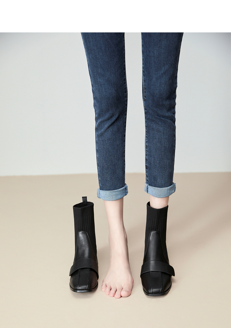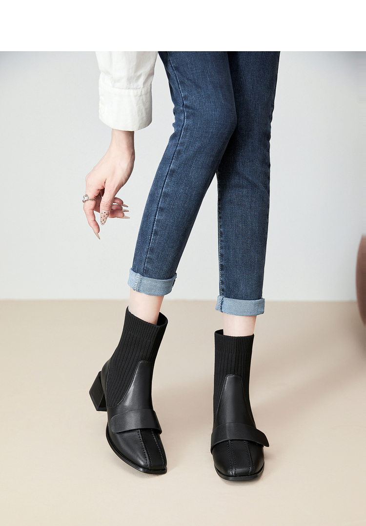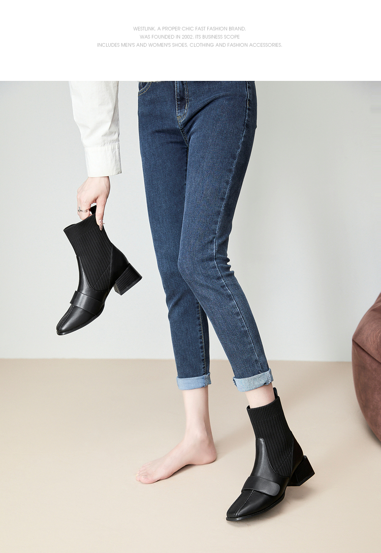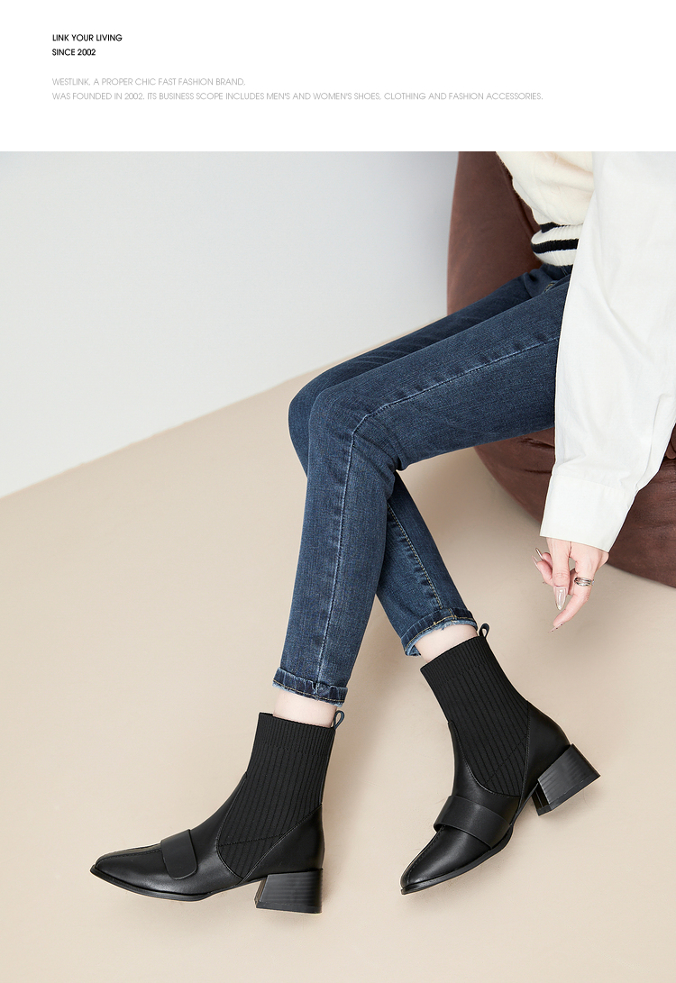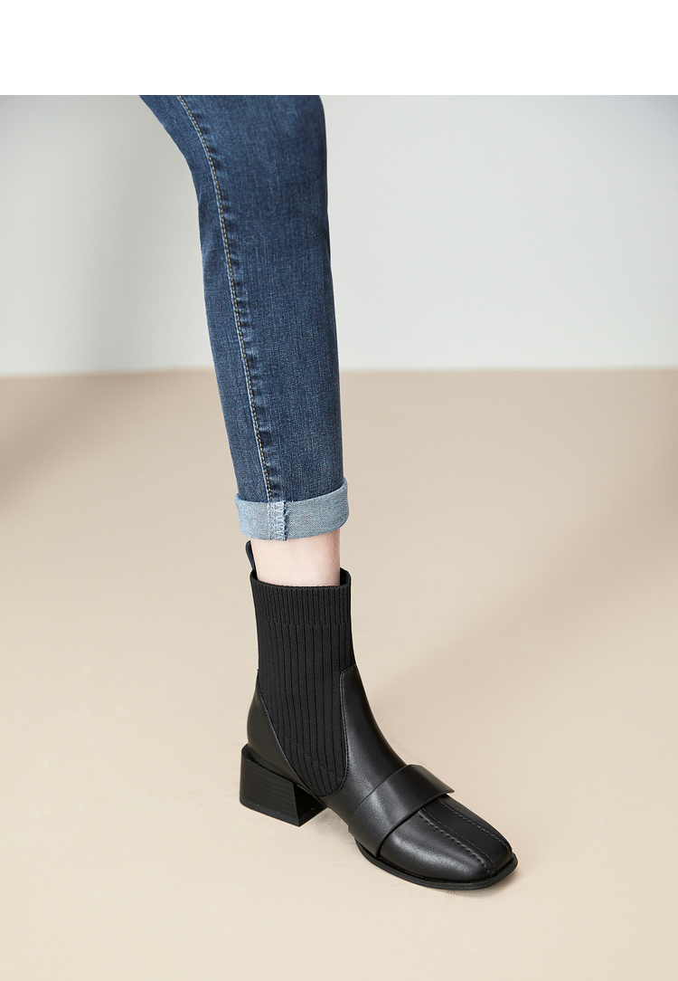 西遇法式瘦瘦靴女新款秋冬复古针织弹力袜靴方头粗跟黑色短靴V0047786