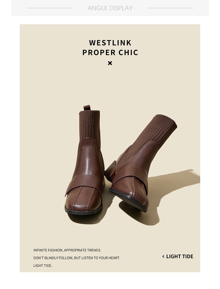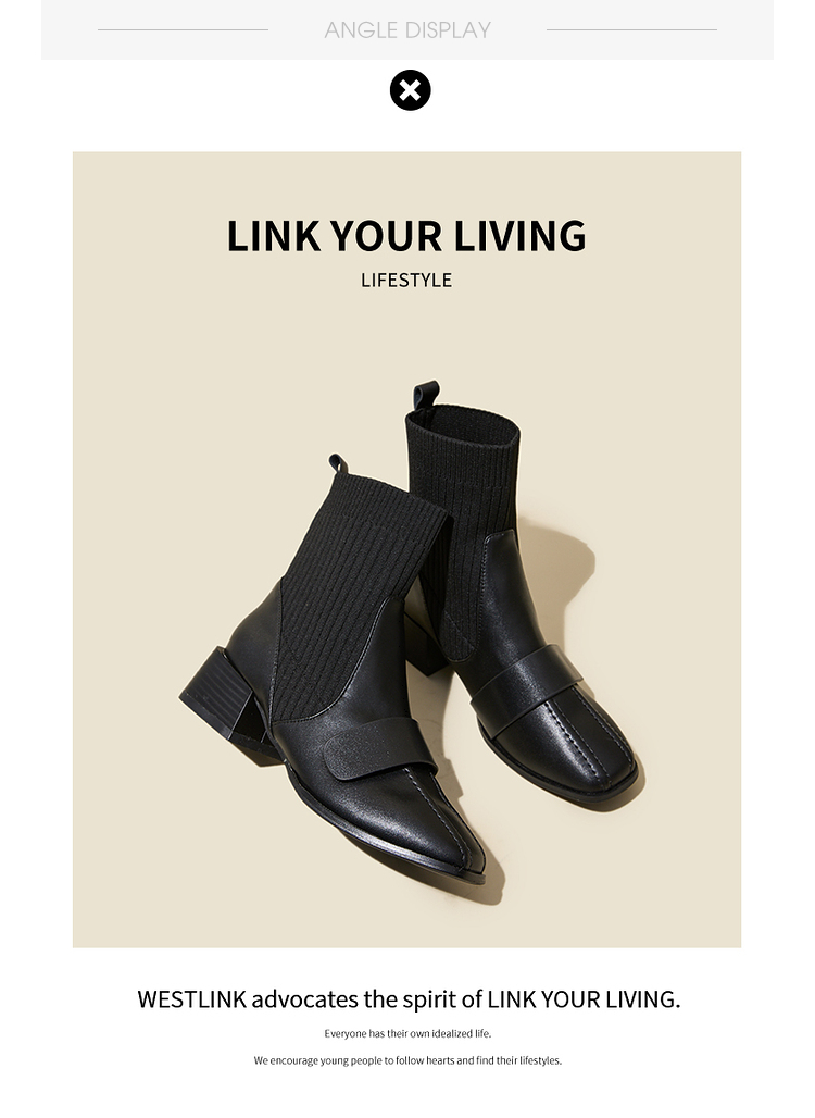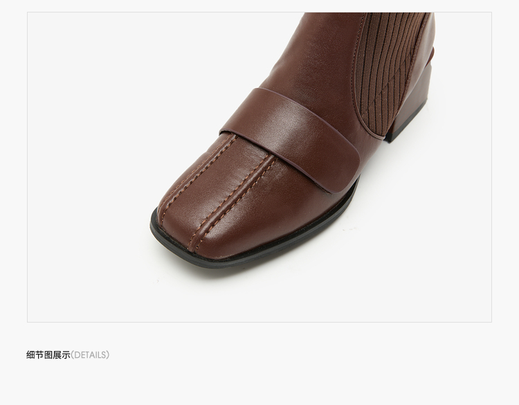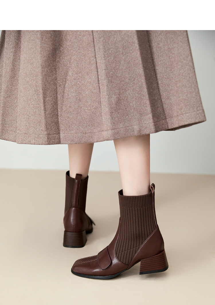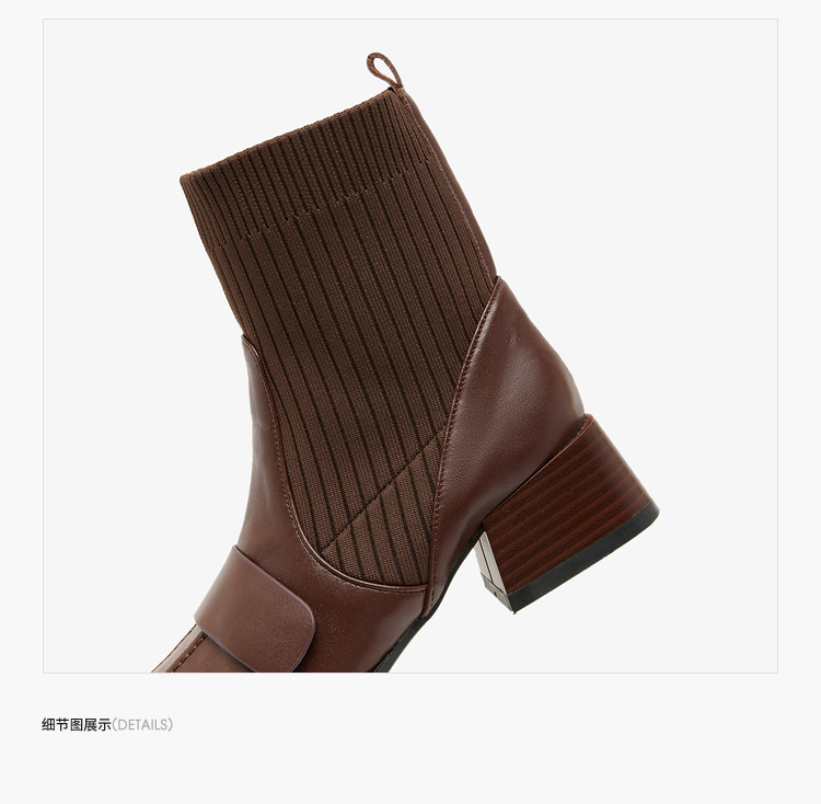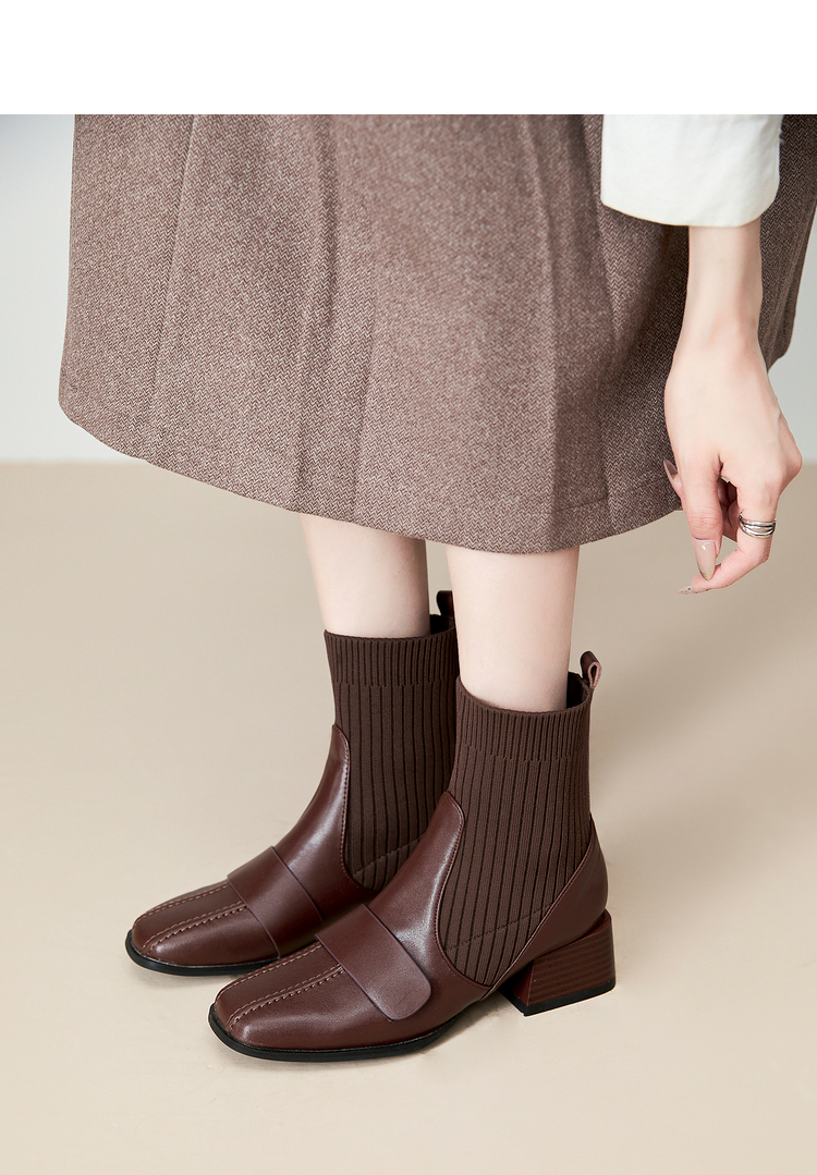 西遇法式瘦瘦靴女新款秋冬复古针织弹力袜靴方头粗跟黑色短靴V0047786