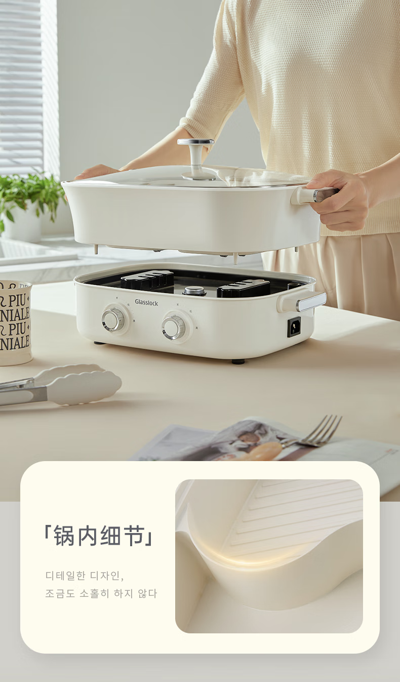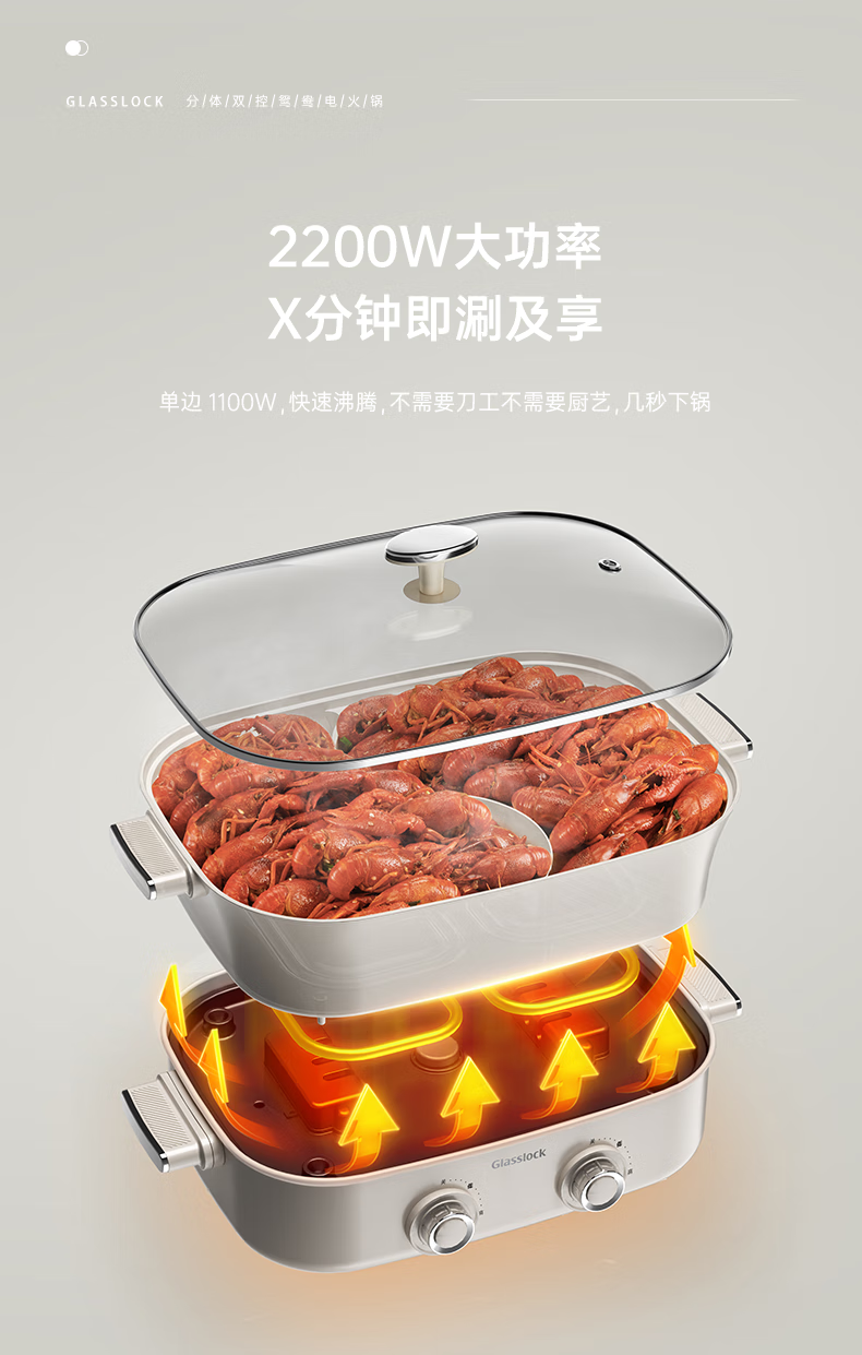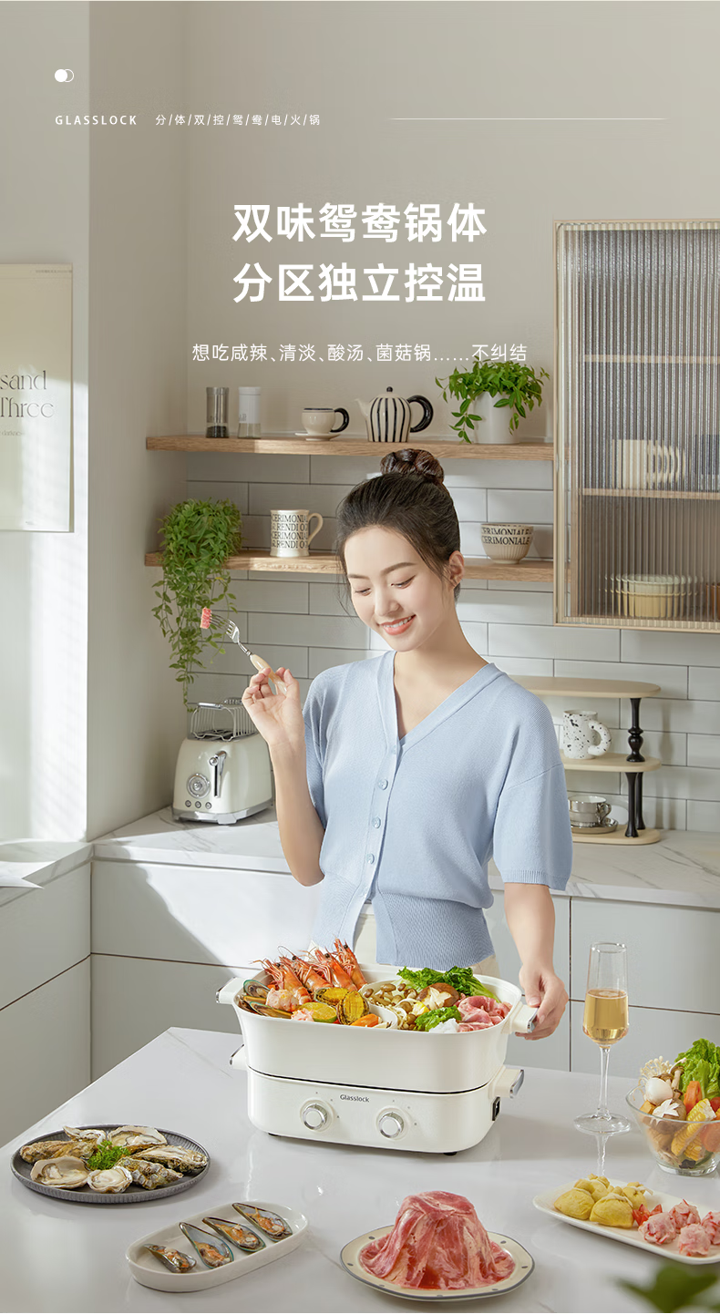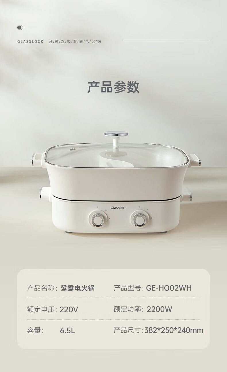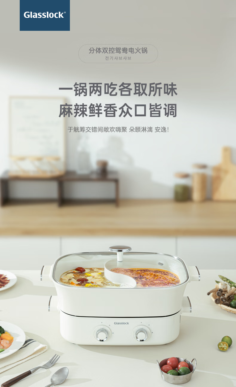 【小家电】GLASSLOCK韩国品牌速沸电火锅6.5L鸳鸯锅大功率多用途锅电煮锅多功能锅分体式家用电热锅涮肉锅火锅锅具HF