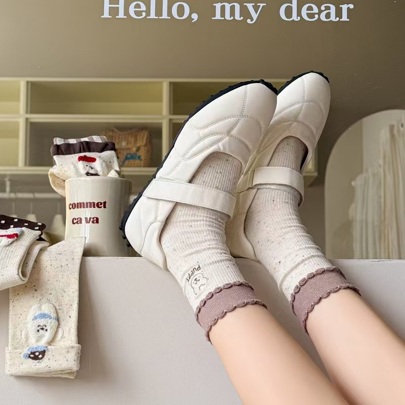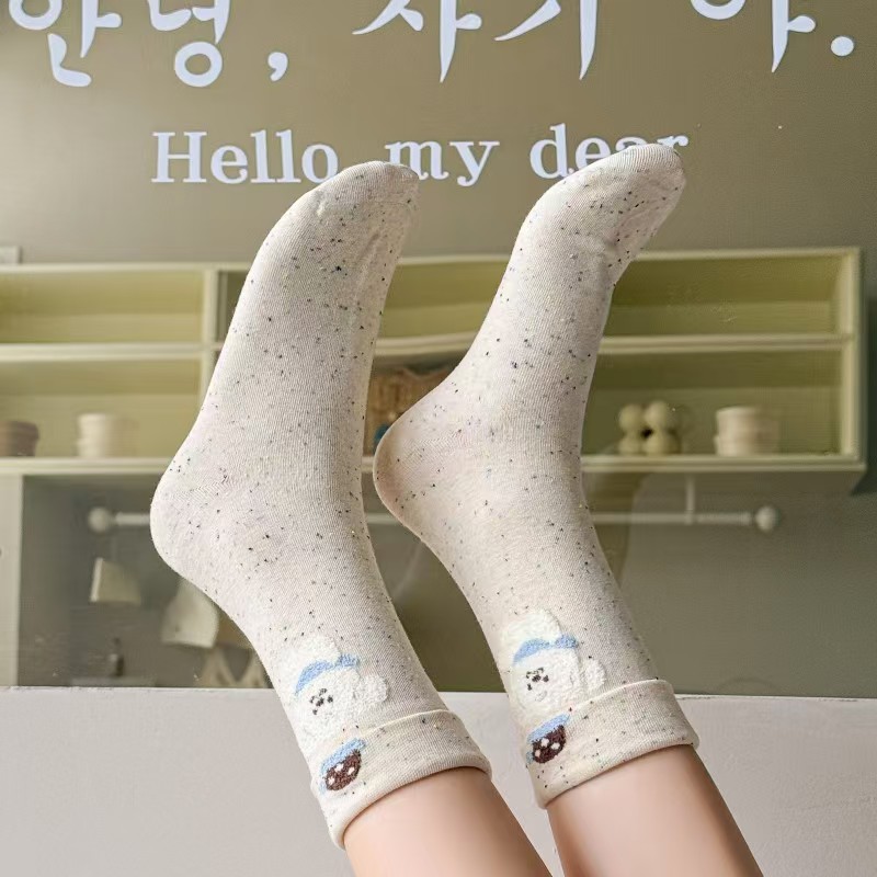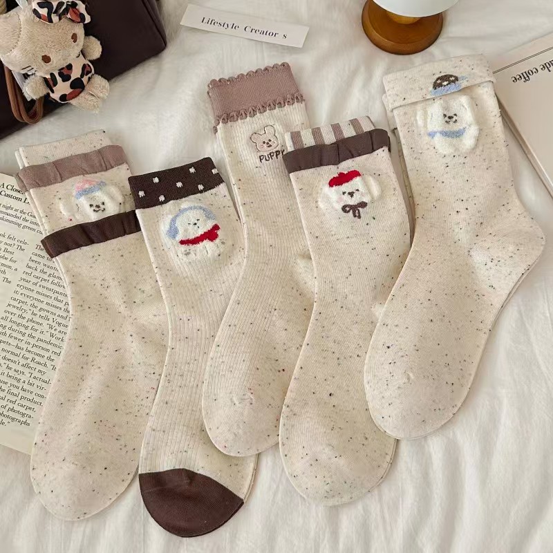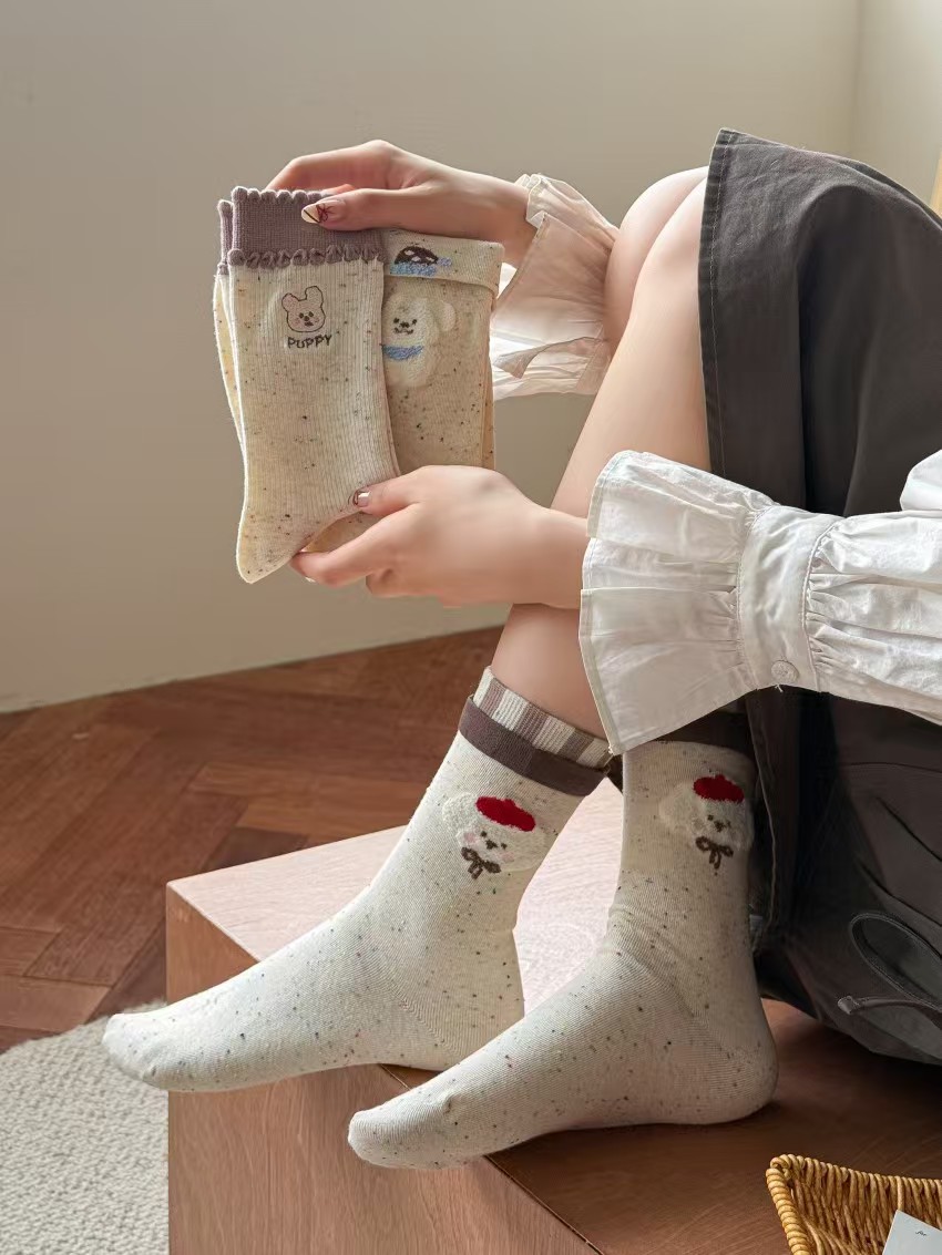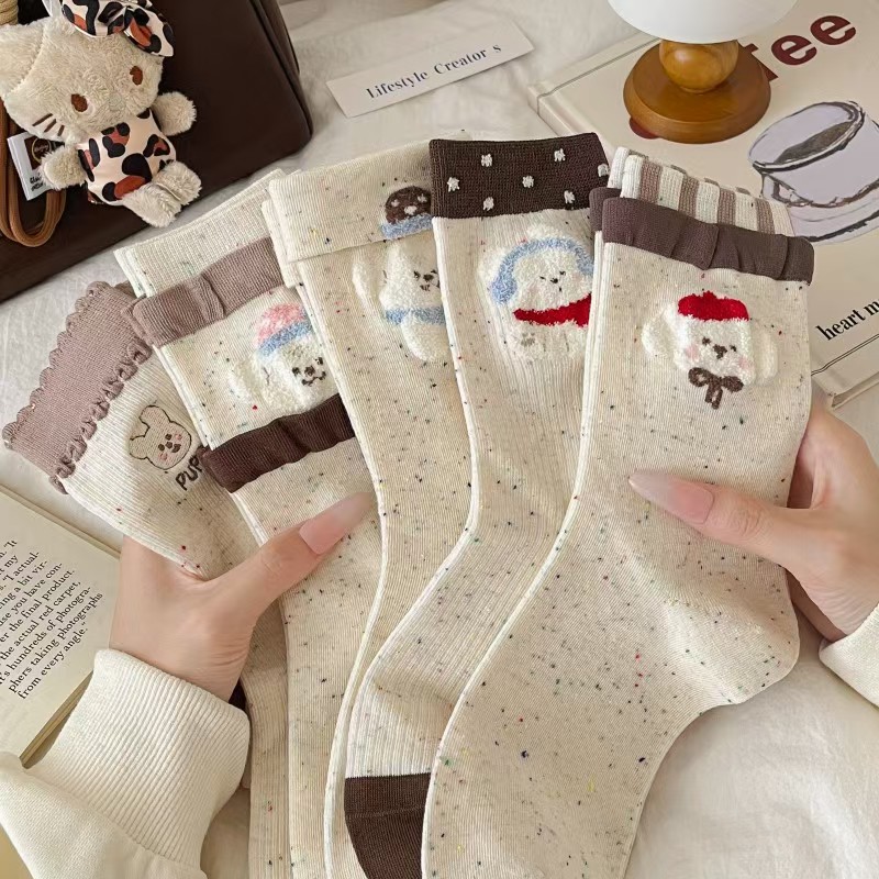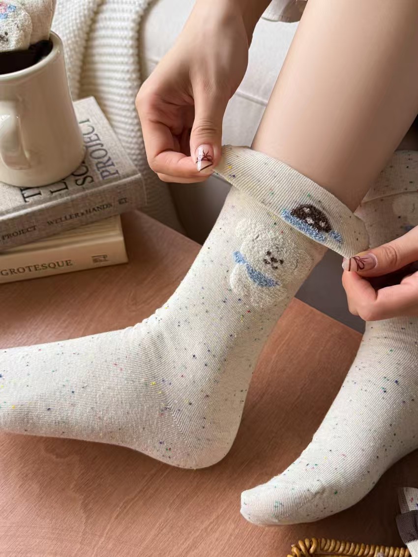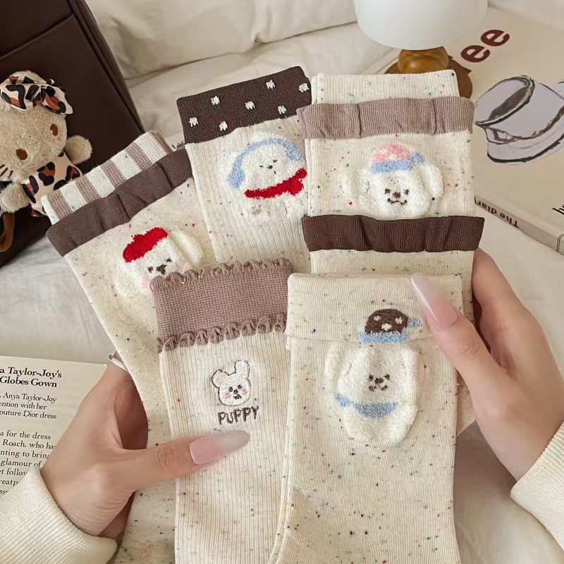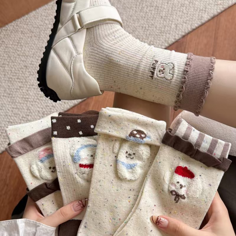 袜子女中筒袜秋冬卡通植绒小动物木耳边女袜ins潮可爱点子纱堆堆