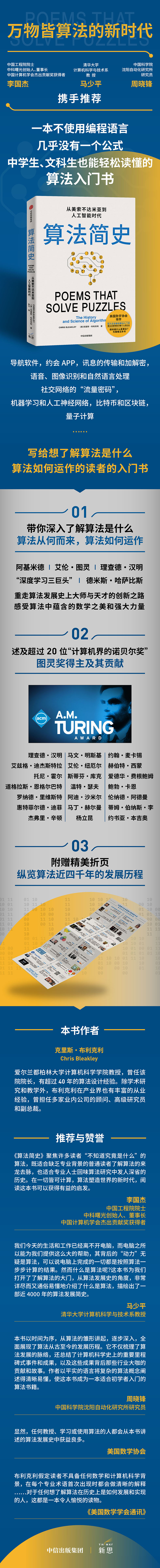 21世纪的今天,我们生活的方方面面无时无刻不在被算法影响和塑造。它们帮我们选择佳的行车路线,向我们荐我们可能购买的商品,为我们识别语音和图像,甚至给单身人士匹配婚恋对象。越发强大的算法也在不断突破极限,无论是打败围棋世界冠军柯洁,借助大语言模型与人类会话,还是在200秒内完成超级计算机1万年才能完成的计算。然而,算法并非新近才开始影响人类社会,人类受益于算法已经有数千年的历史。在《算法简史:从美索不达米亚到人工智能时代》中,以算法发展过程中的关键人物和典算法为主线,作者克里斯·布利克利绘出了一幅近4 000年的算法发展简史:从镌刻在古巴比伦泥板上求2的平方根的算法,到刘徽和祖冲之父子对圆周率的精确计算;从查尔斯·巴贝奇和艾达·洛芙莱斯试图建造的机械数字通用计算机,到艾伦·图灵对算法的正式定义和他构想的图灵机;从一台可编程的通用电子计算机ENIAC,到一个人工智能程序“逻辑理论家”;从互联网的诞生,讯息的传输和加解密,再到亚马逊的荐系统、谷歌搜索和社交媒体的动态排序,以及今天无处不在的人工神经网络……书中丰富的算法实例让读者充分感受到算法中蕴含的数学之美以及算法推动人类社会进步的强大力量。
