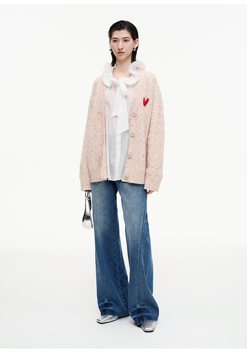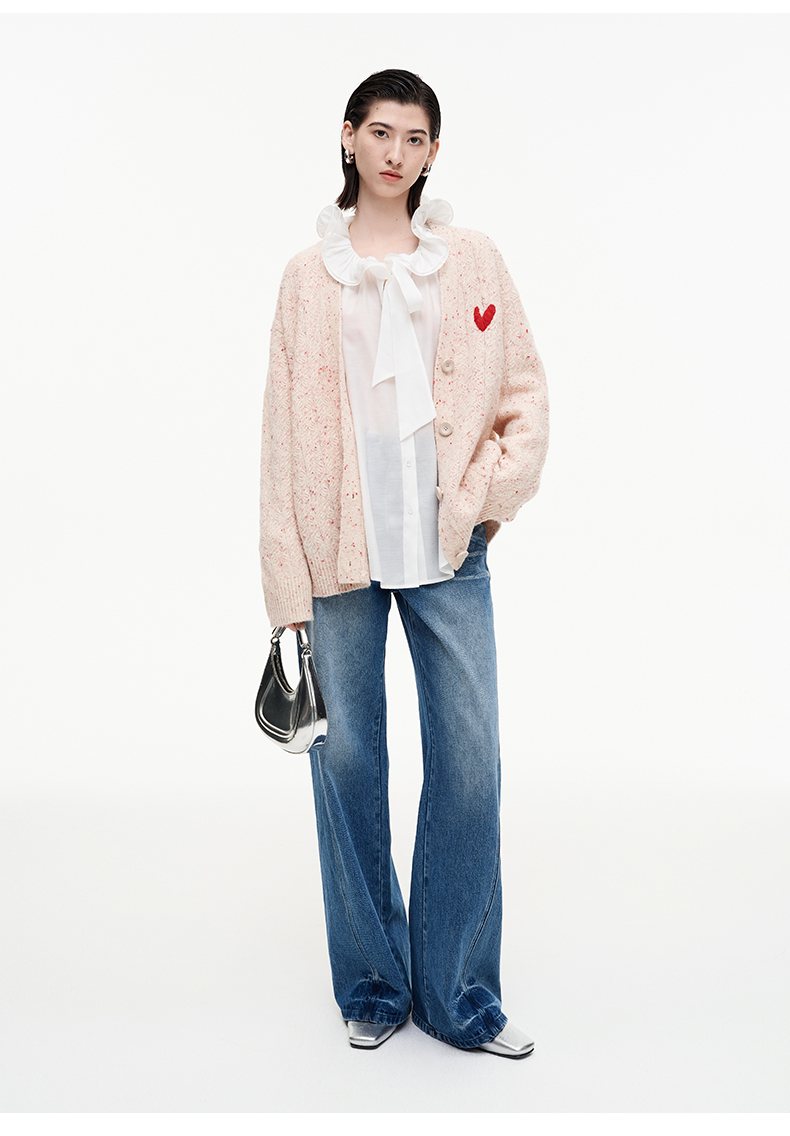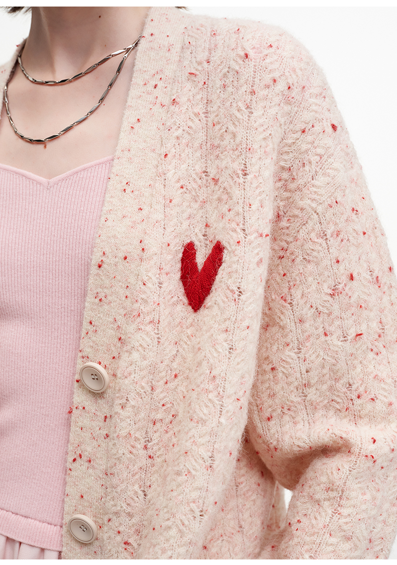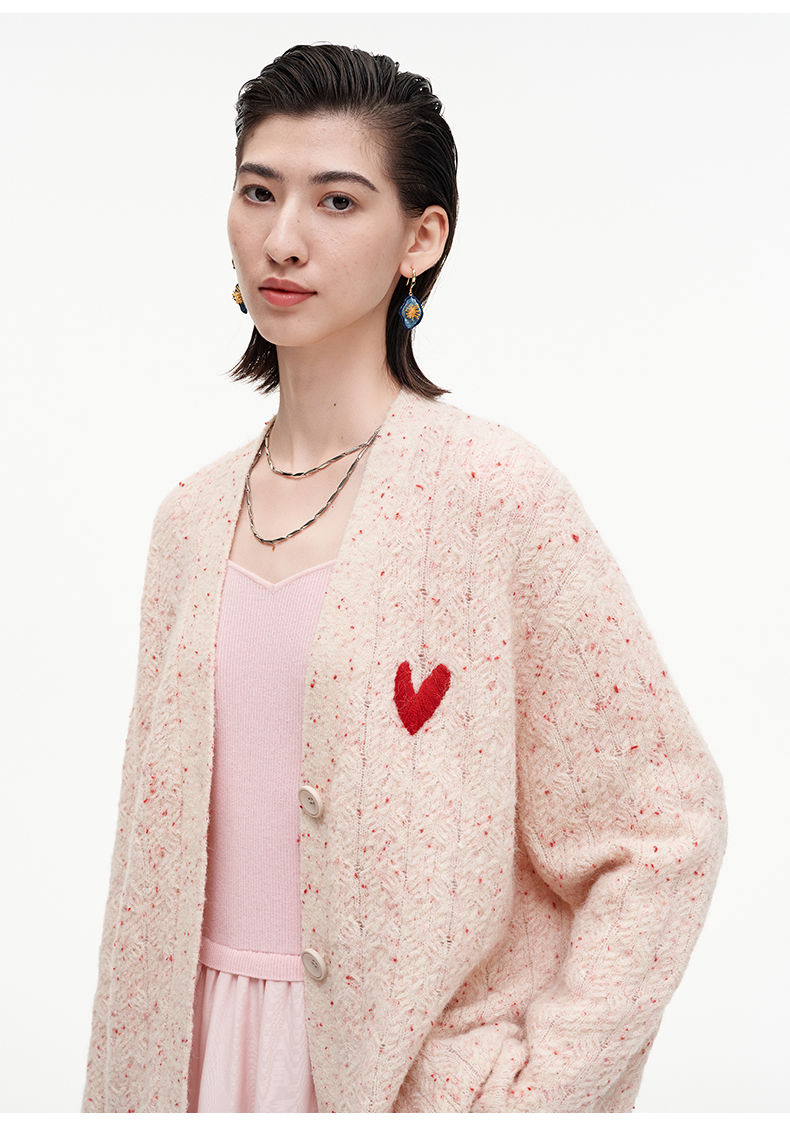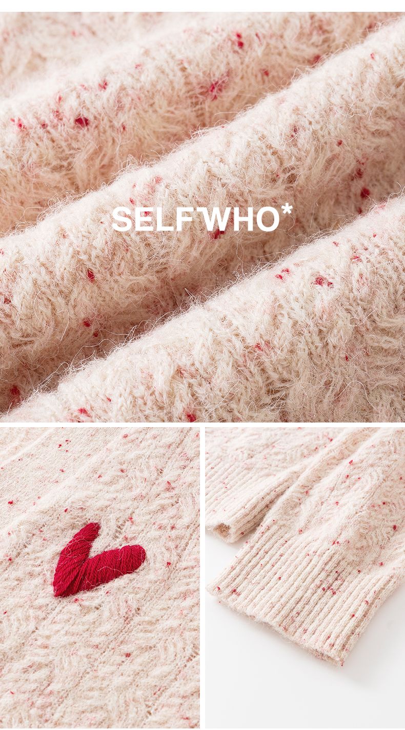 SELFWHO七夕系列羊毛混纺爱心V领针织开衫女2025秋季新款麻花外套