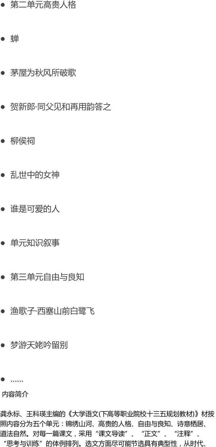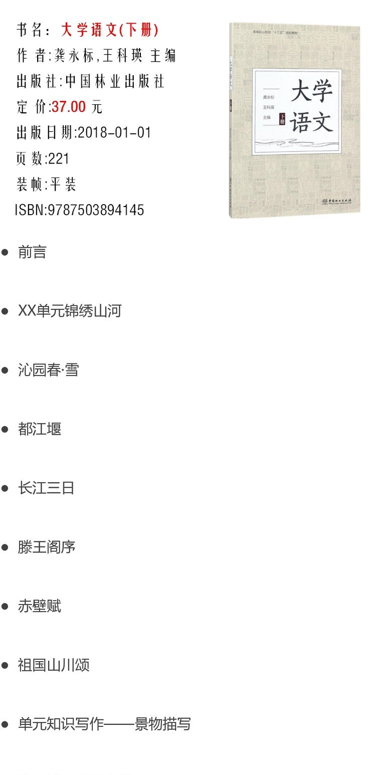 大学语文 下册 9414 龚永标 王科瑛 高等职业院校十三五规划教材 中国林业出版社