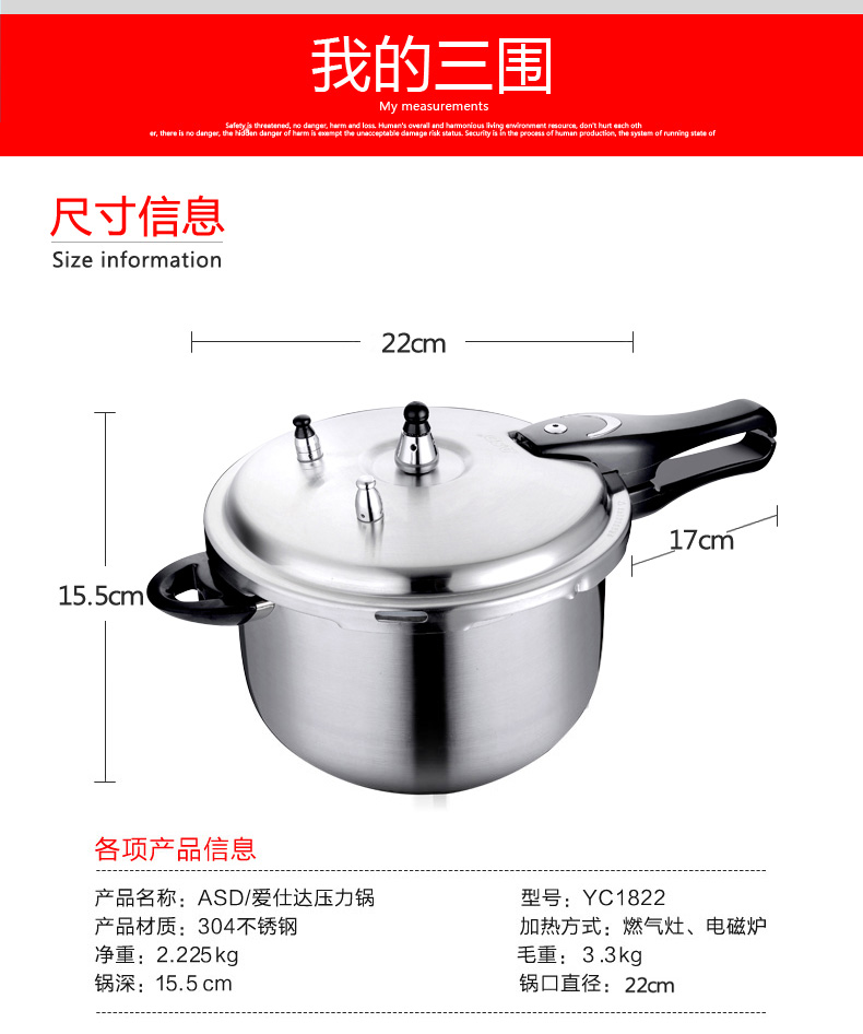 爱仕达YC1822 不锈钢压力锅 蒸锅 电磁炉燃气灶 通用 压力锅