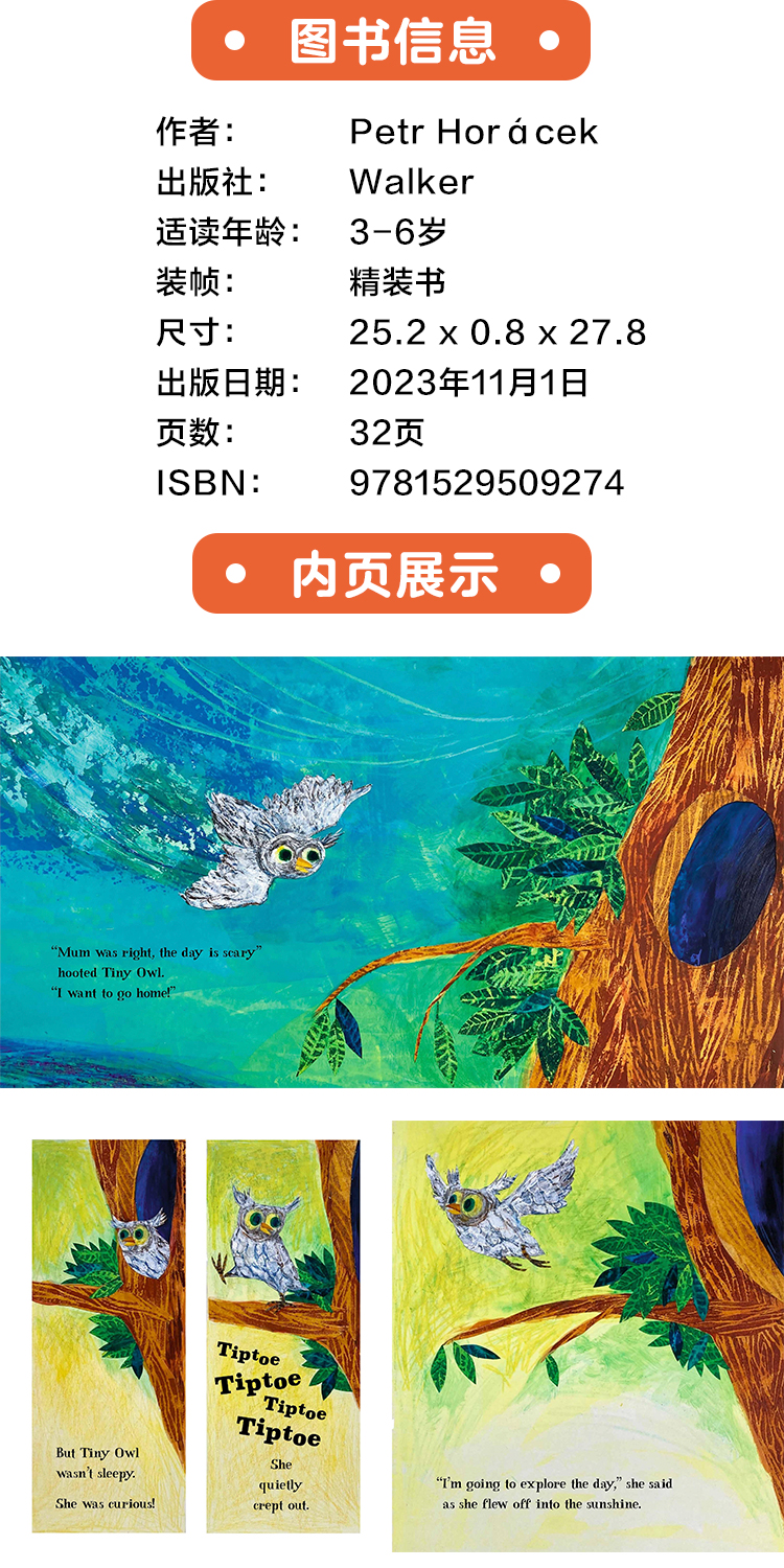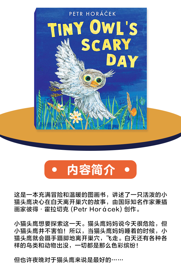 这是一本充满冒险和温暖的图画书,讲述了一只活泼的小猫头鹰决心在白天离开巢穴的故事,由国际知名作家兼插画家彼得·霍拉切克 (Petr Horácek) 创作。 小猫头鹰想要探索这一天。猫头鹰妈妈说今天很危险,但小猫头鹰并不害怕!所以,当猫头鹰妈妈睡着的时候,小猫头鹰就会蹑手蹑脚地离开巢穴,飞走。白天还有各种各样的鸟类和动物出没,一切都是那么色彩缤纷! 但也许夜晚对于猫头鹰来说是最好的……