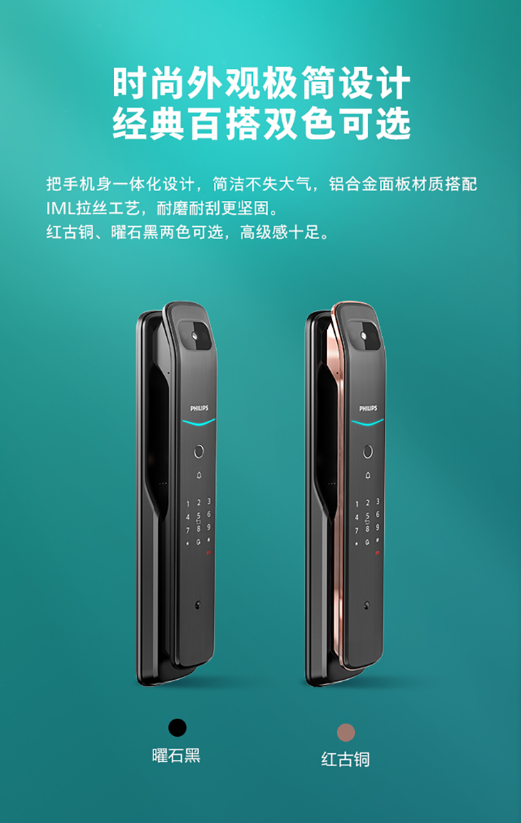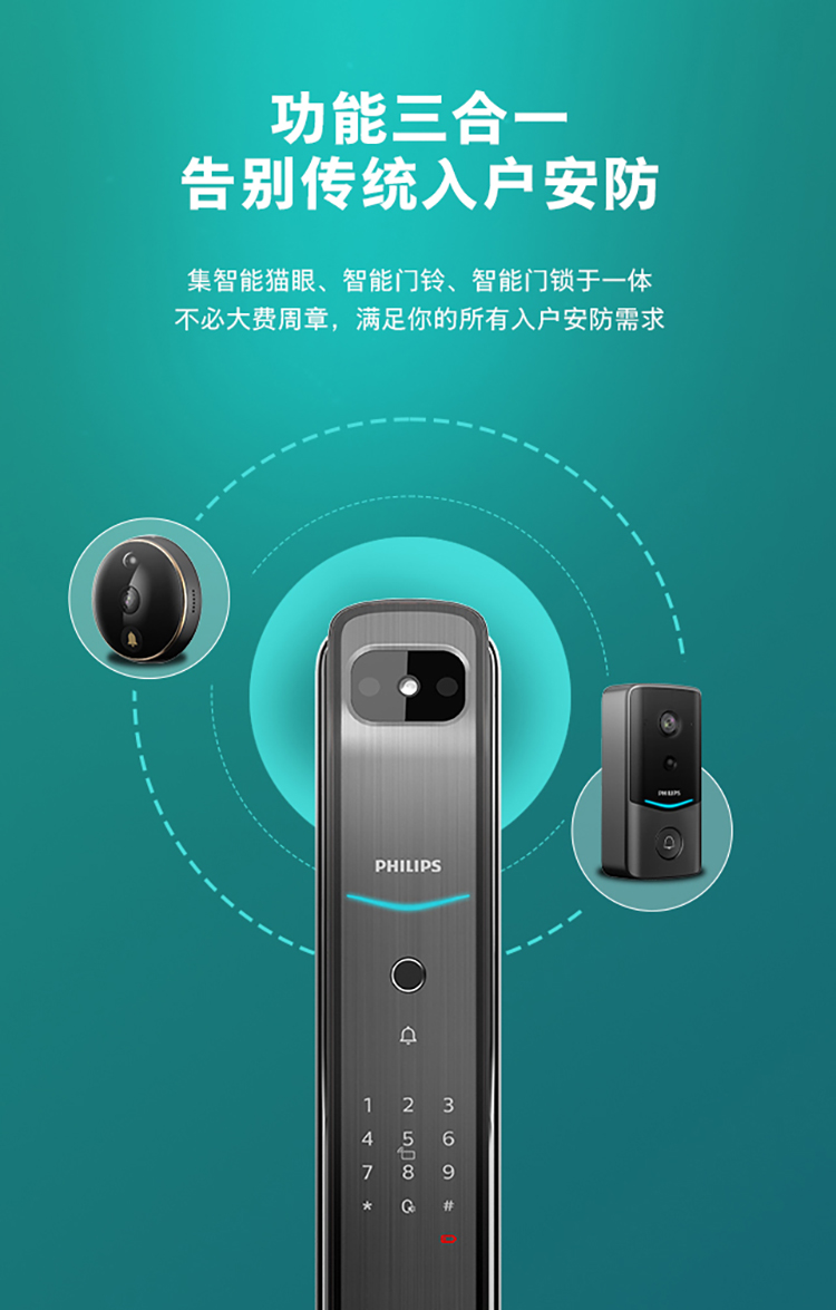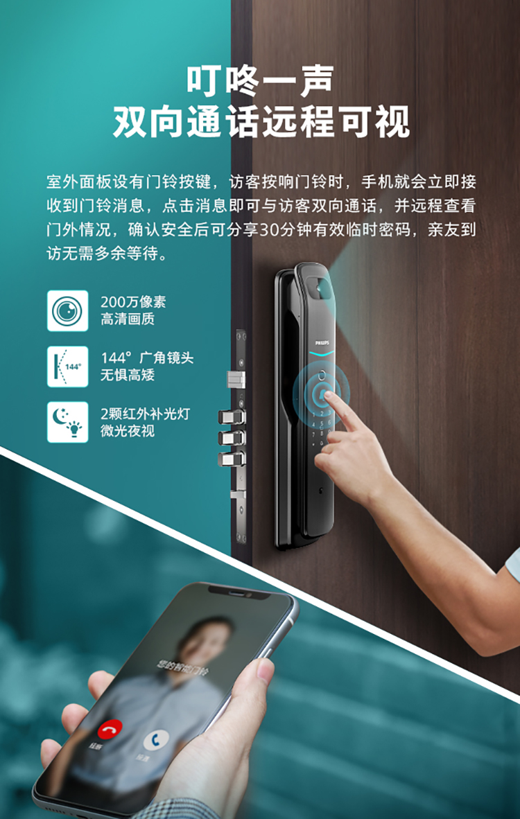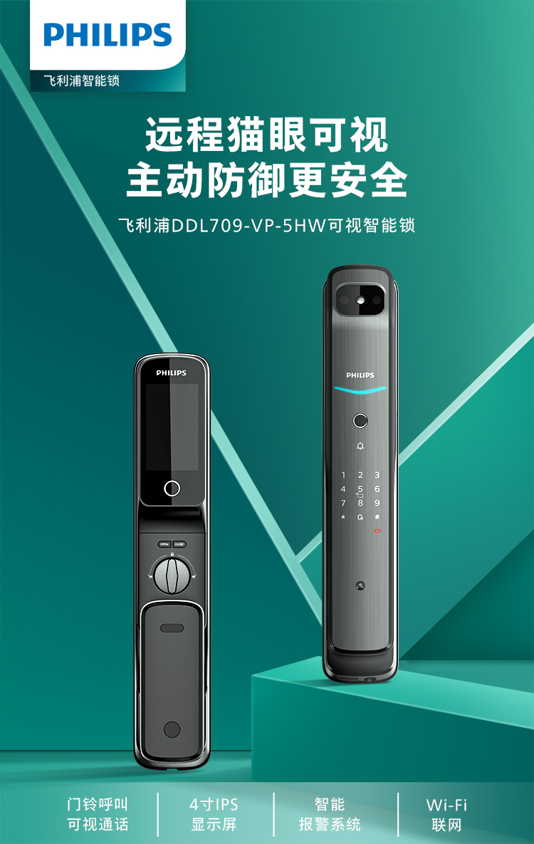 飞利浦(PHILIPS) 电子锁 全自动带屏推拉式智能可视猫眼视频锁指纹密码锁智能门锁 DDL-709VP-5HW
