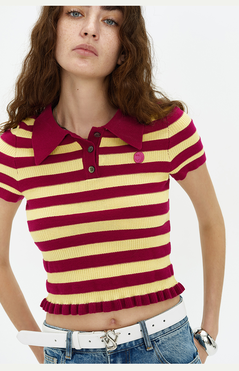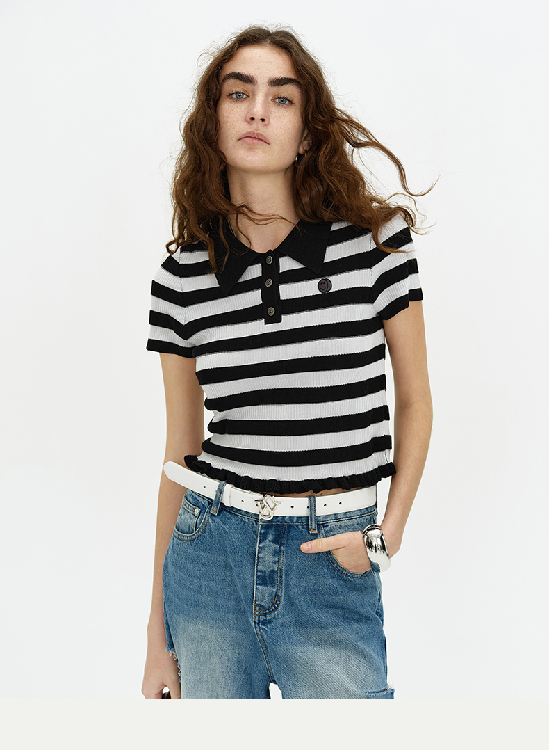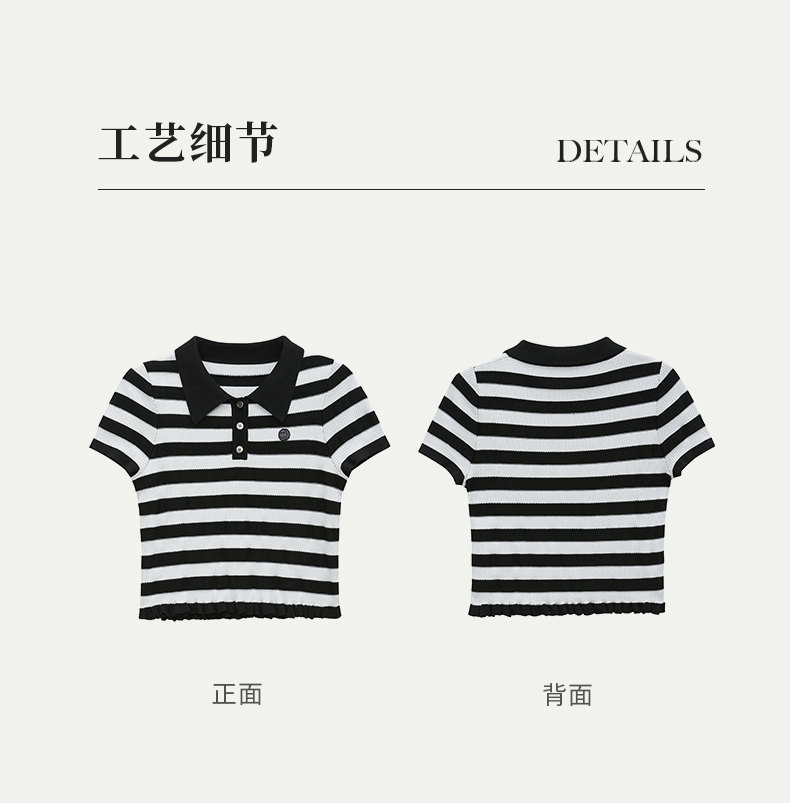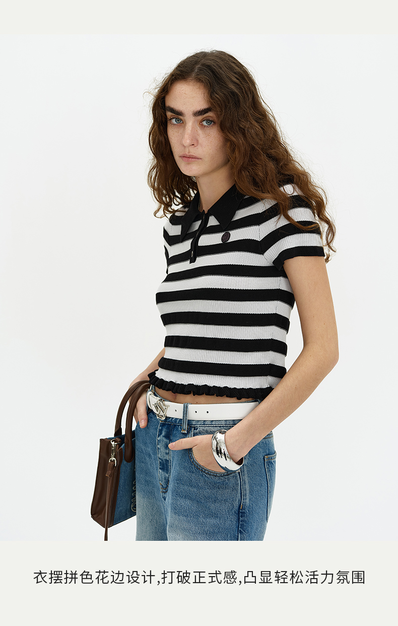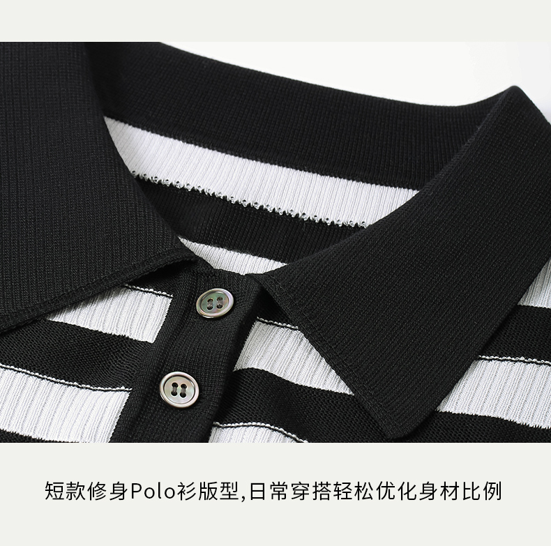 SELFWHO 莱赛尔桑蚕丝条纹Polo衫女2024新款夏季小个子短袖针织衫