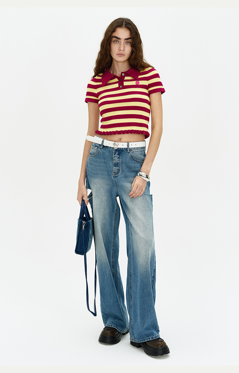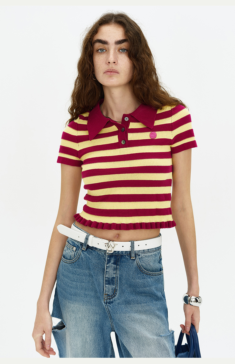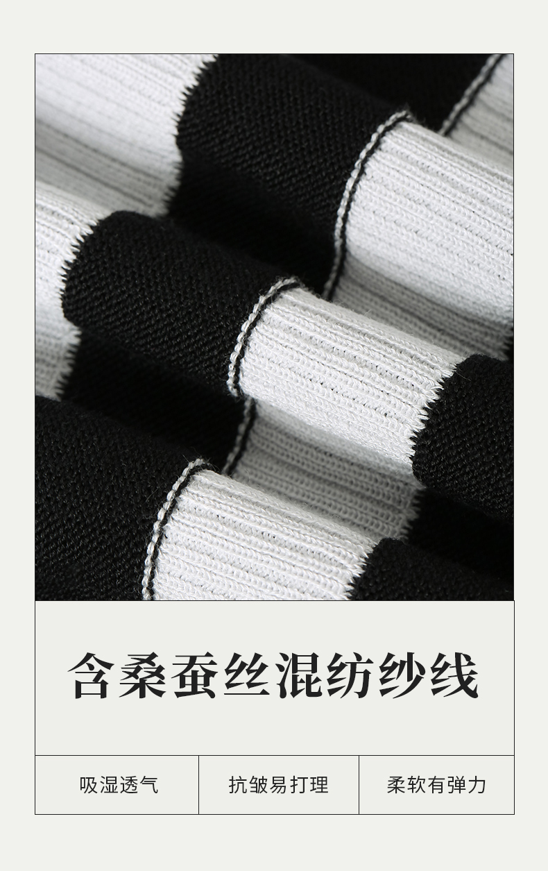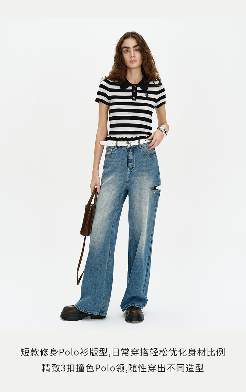 SELFWHO 莱赛尔桑蚕丝条纹Polo衫女2024新款夏季小个子短袖针织衫