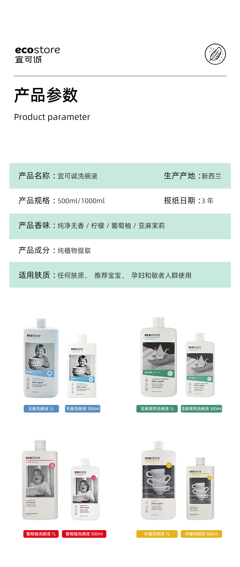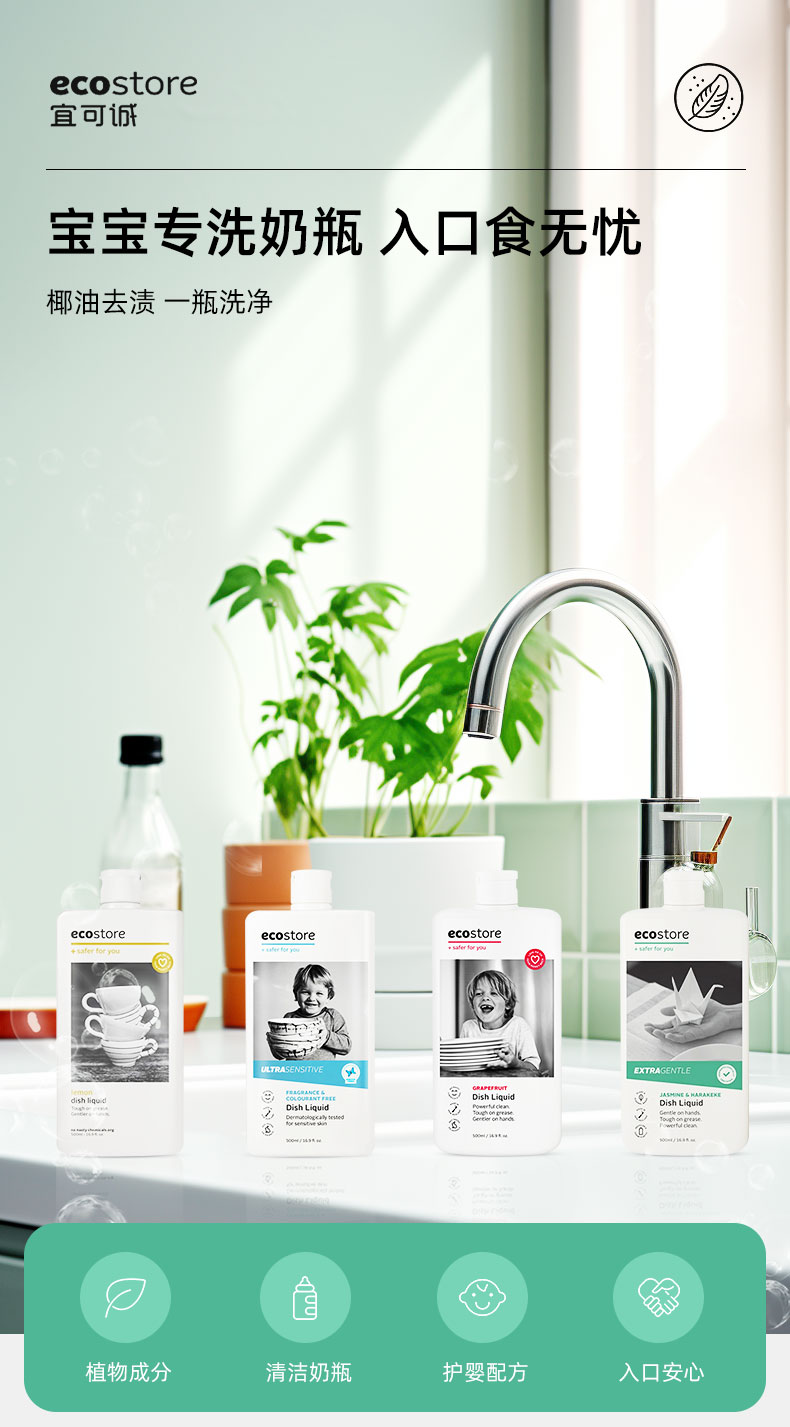 【保税仓】宜可诚ecostore葡萄柚、柠檬、茉莉和新西兰亚麻超敏感洗碗液500毫升
