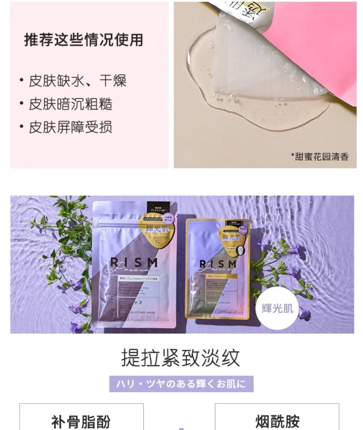 【保税仓】RISM日常护理紫色提拉紧致、蓝色水油平衡、黄色清凉透肌、粉色滋润保湿面膜21.4ml*7片