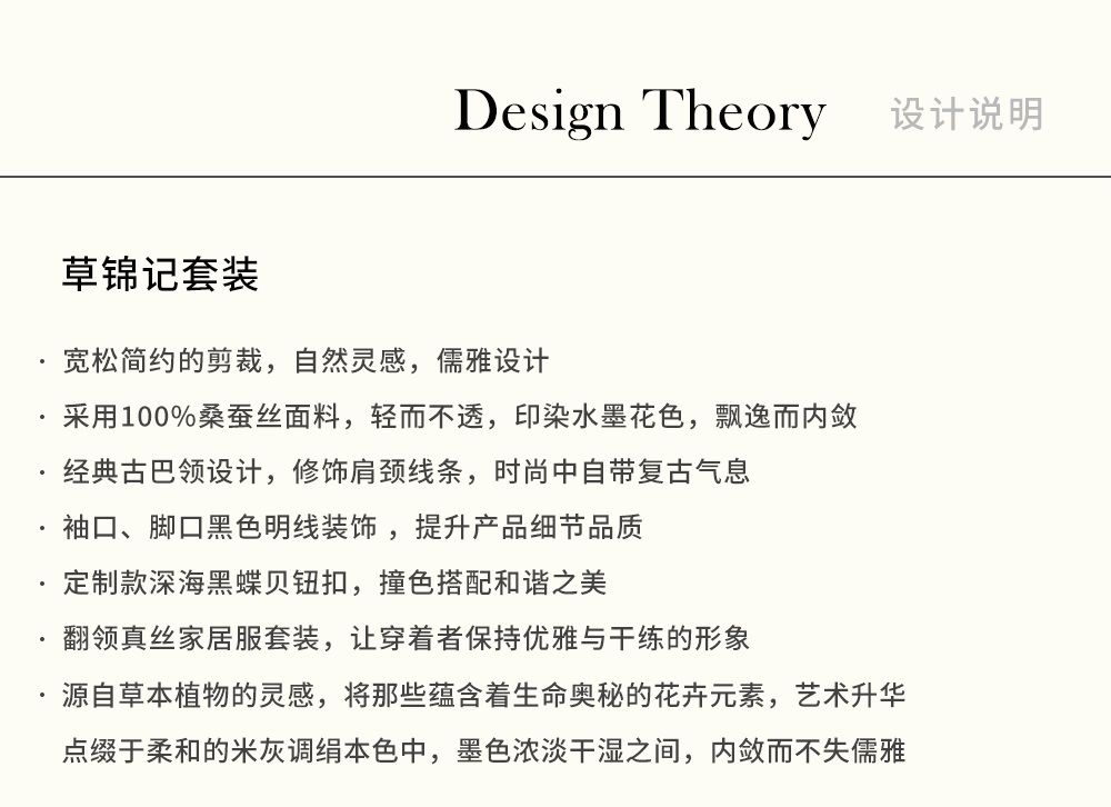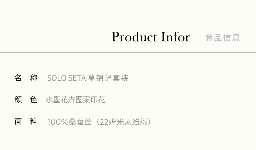 - soloseta专注于真丝织物,灵感源自意大利语,中文含义为“只做真丝”的意思。让睡衣变时尚,居家和外出瞬间切换,使其更具有出街,度假,参加宴会等功能。