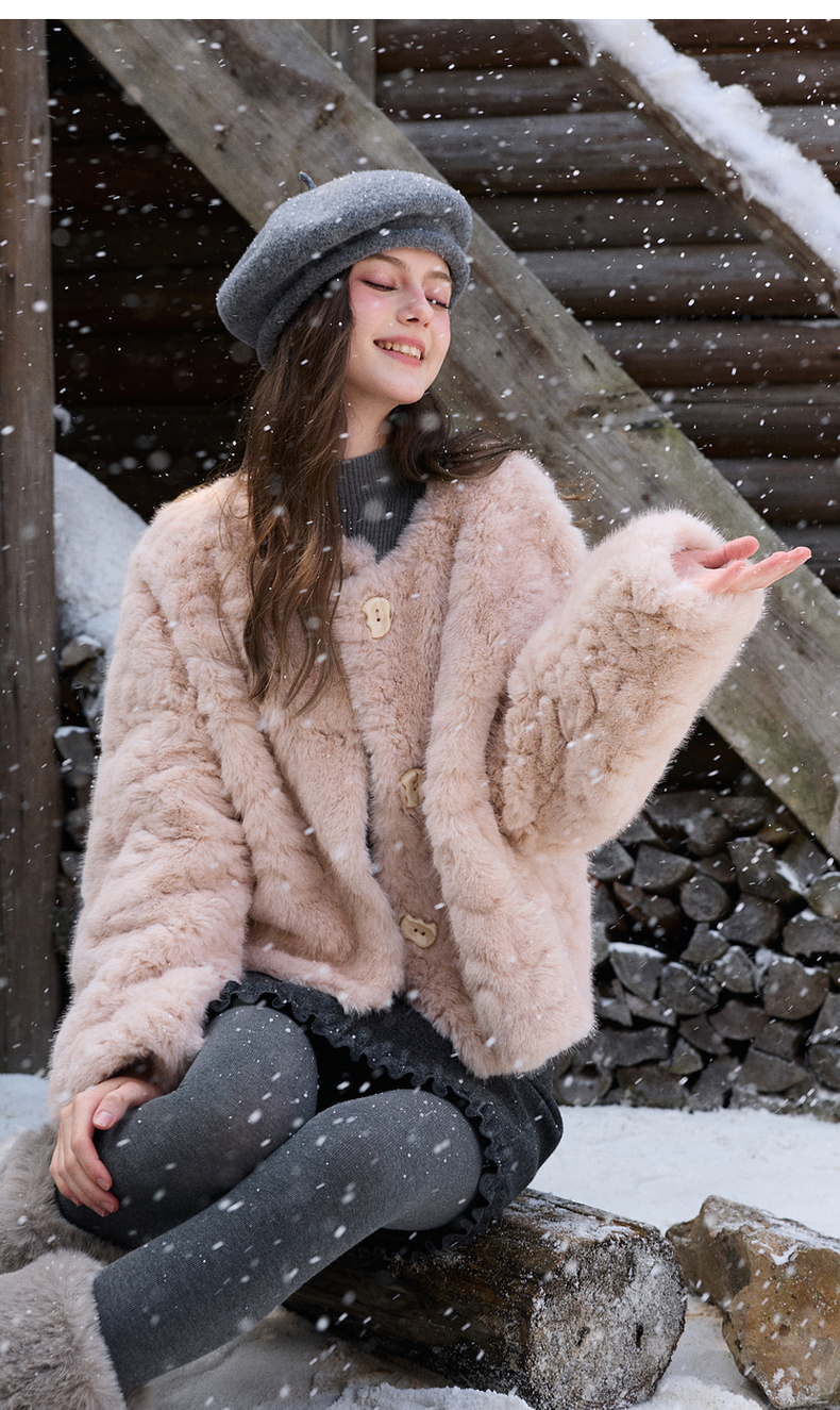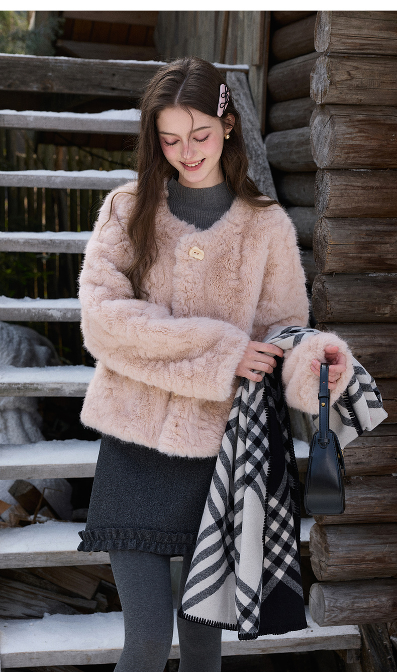 三彩2025冬季新款环保皮草毛毛外套宽松优雅气质短款圆领长袖M