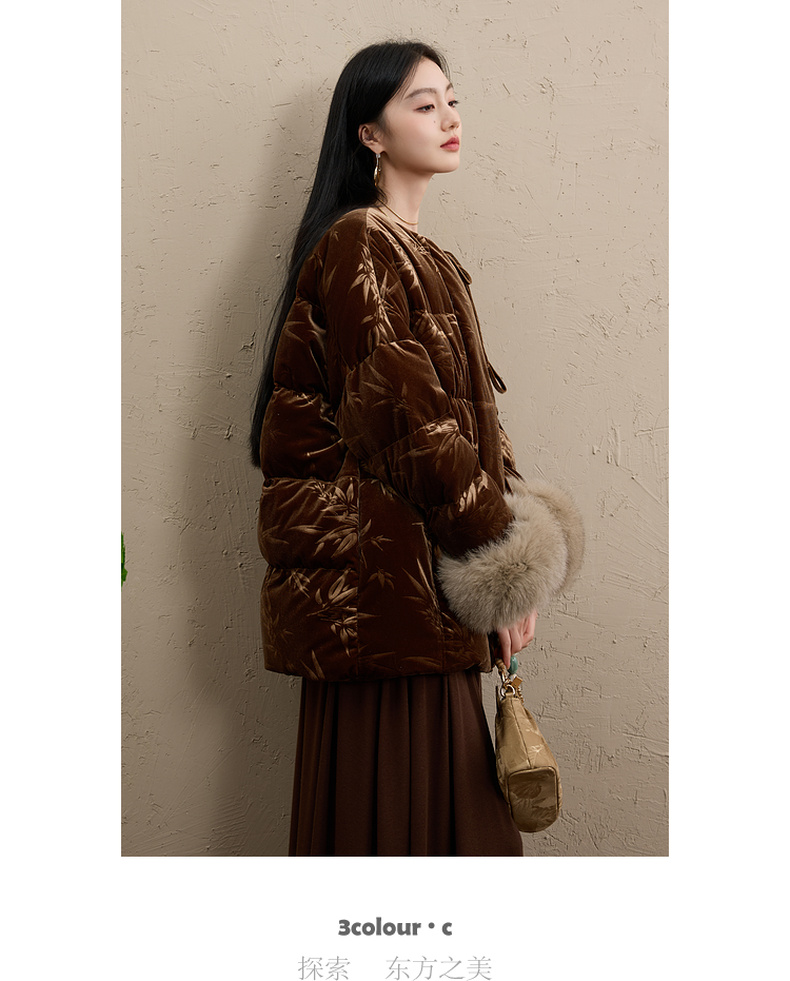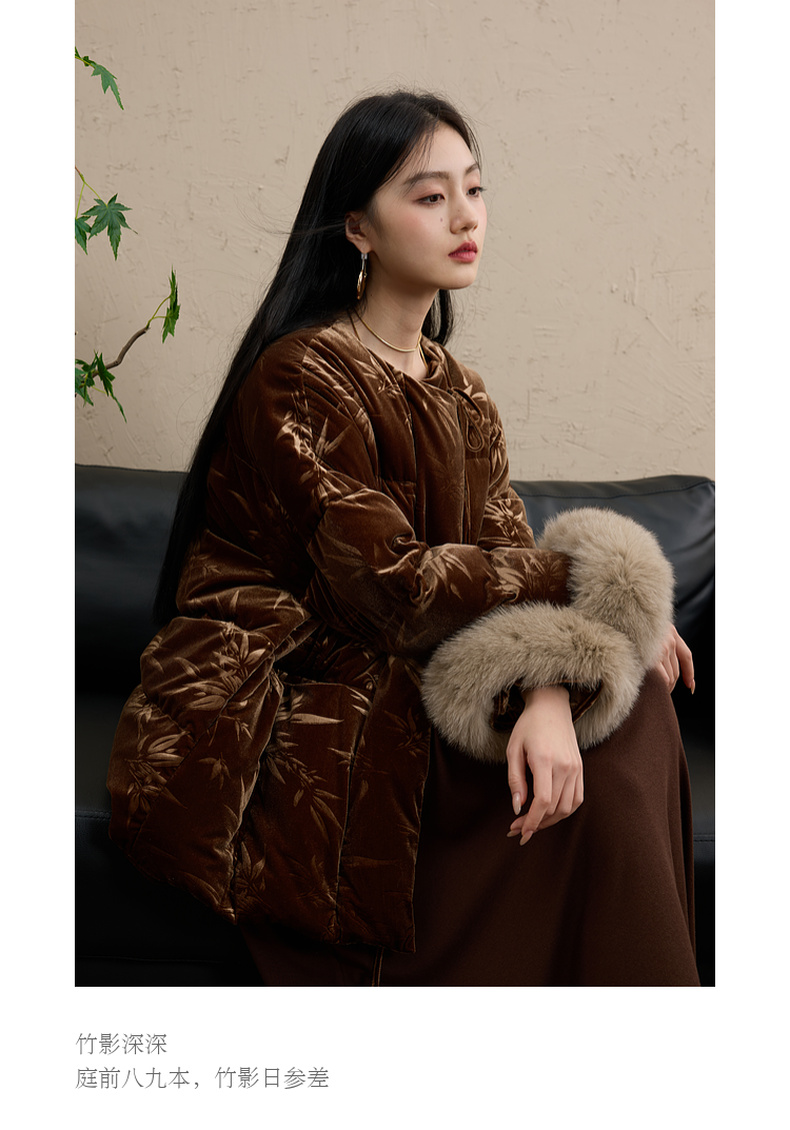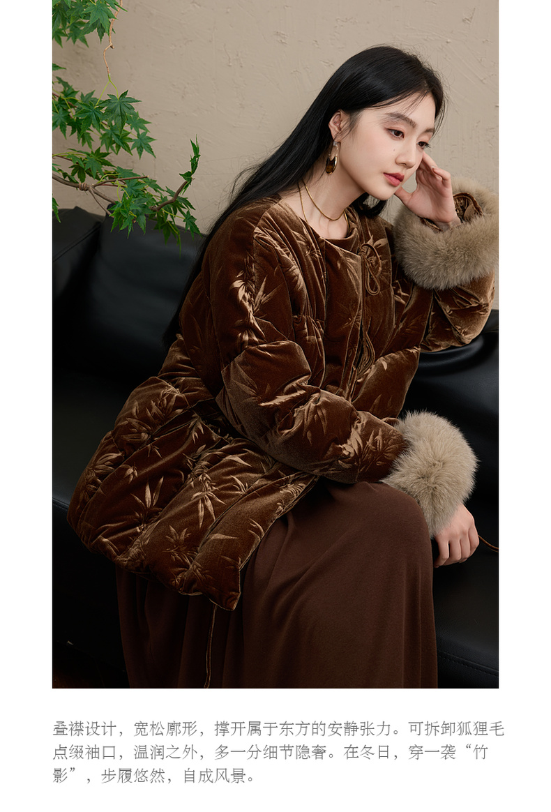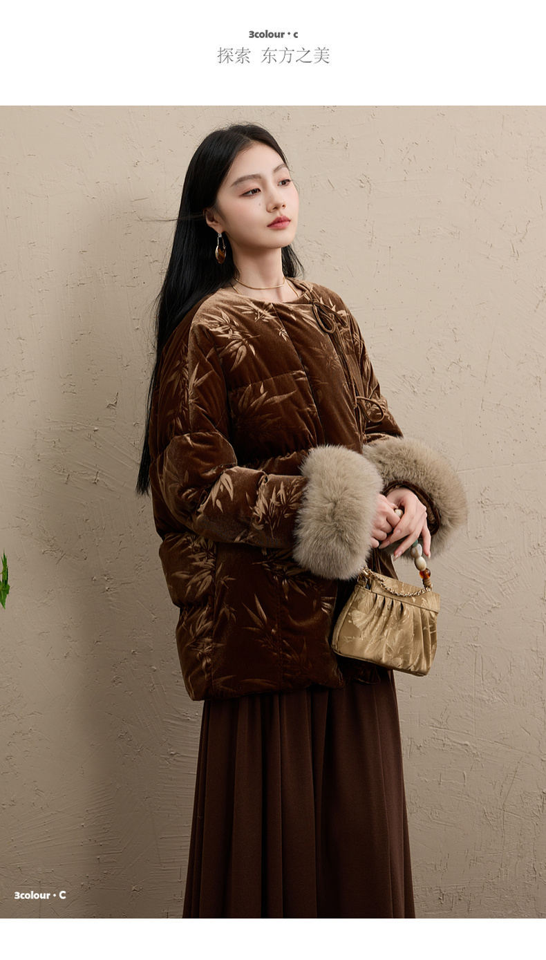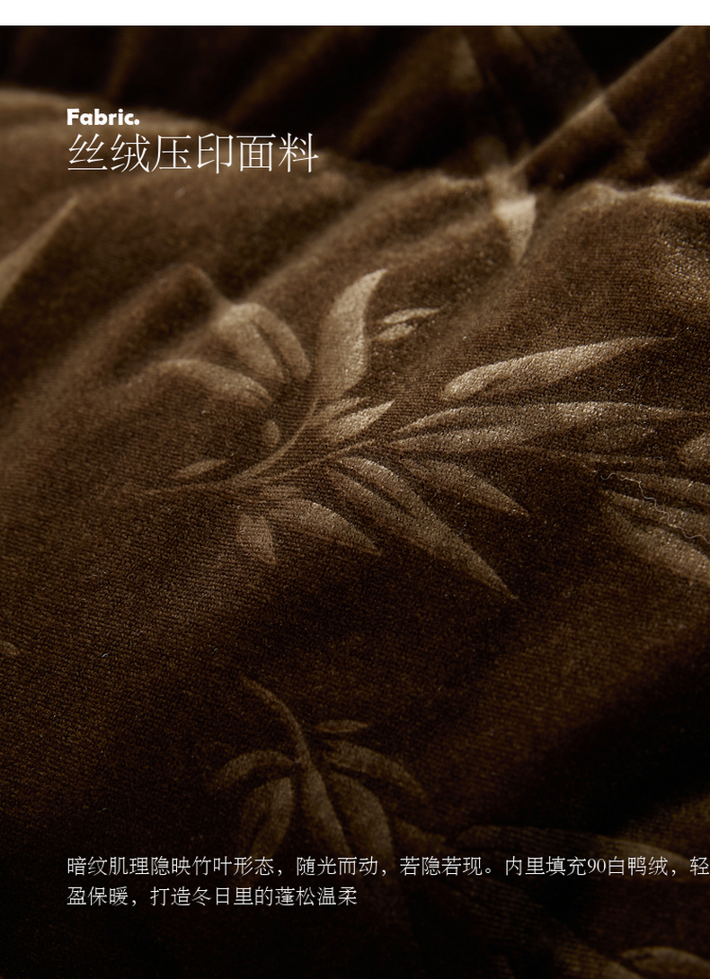 三彩【竹影深深】2025冬季新款90白鸭绒丝绒羽绒服宽松中长C