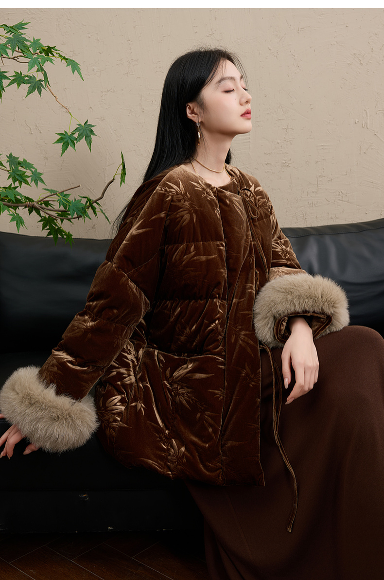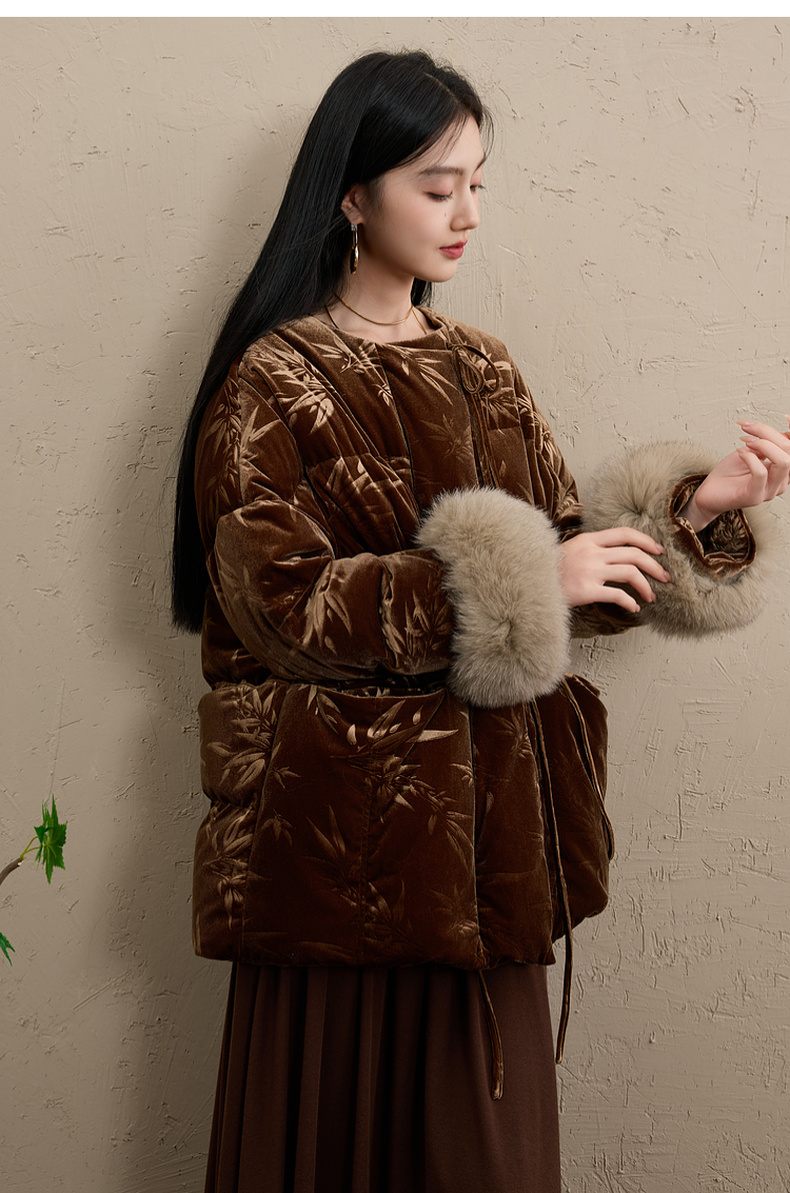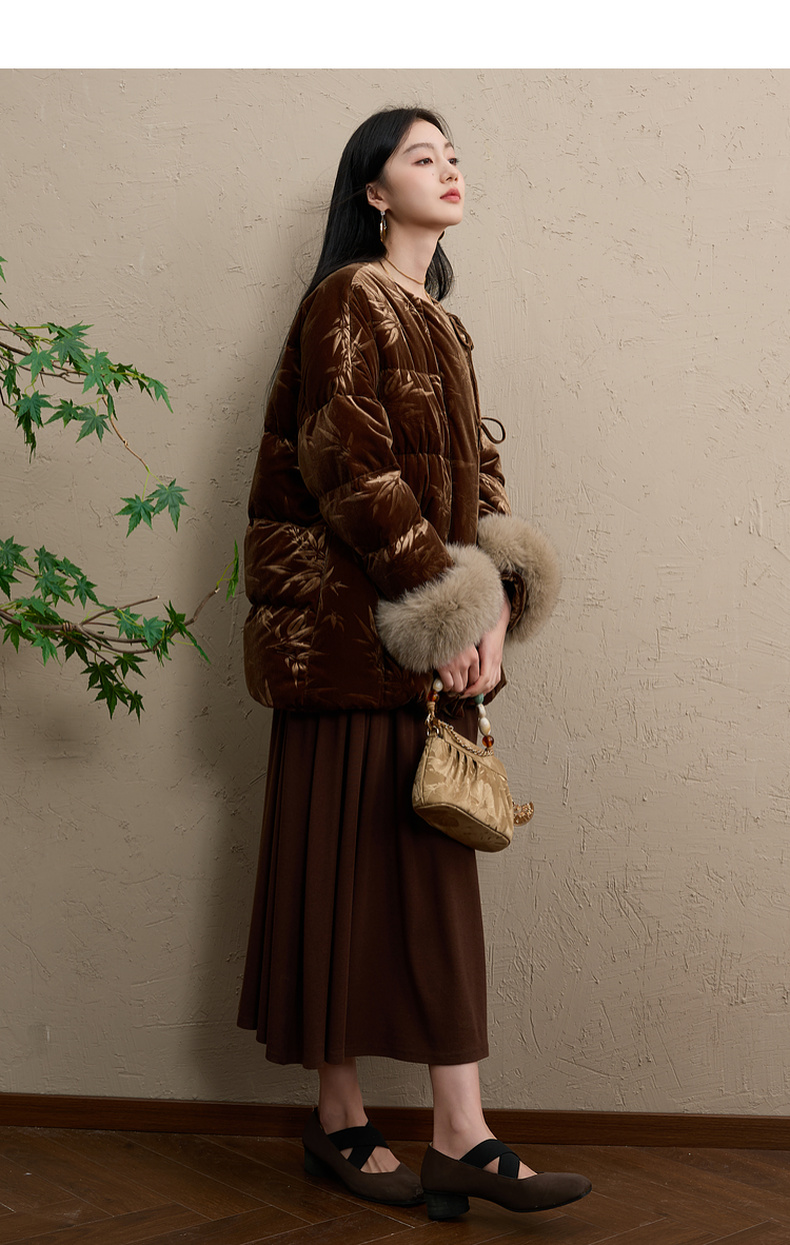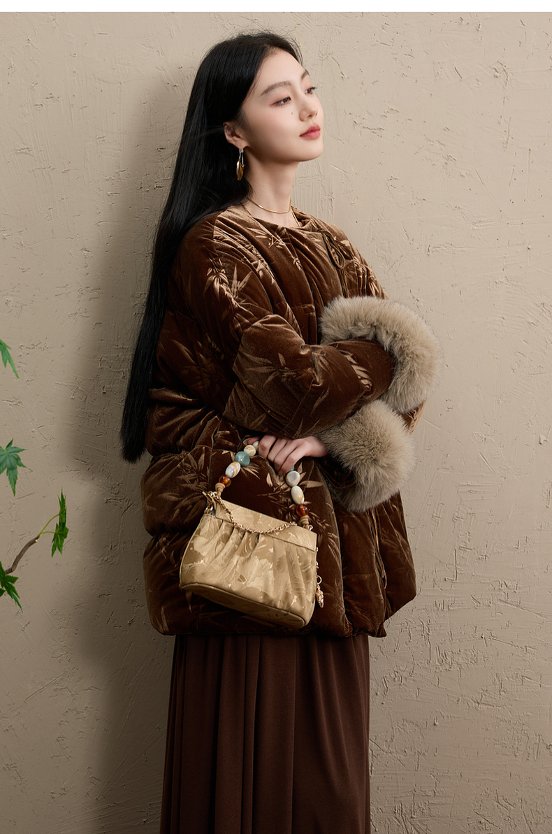 三彩【竹影深深】2025冬季新款90白鸭绒丝绒羽绒服宽松中长C