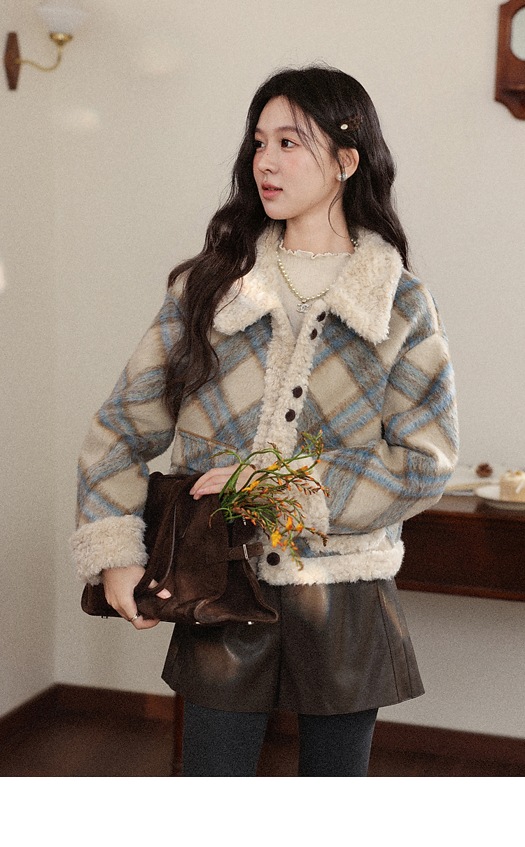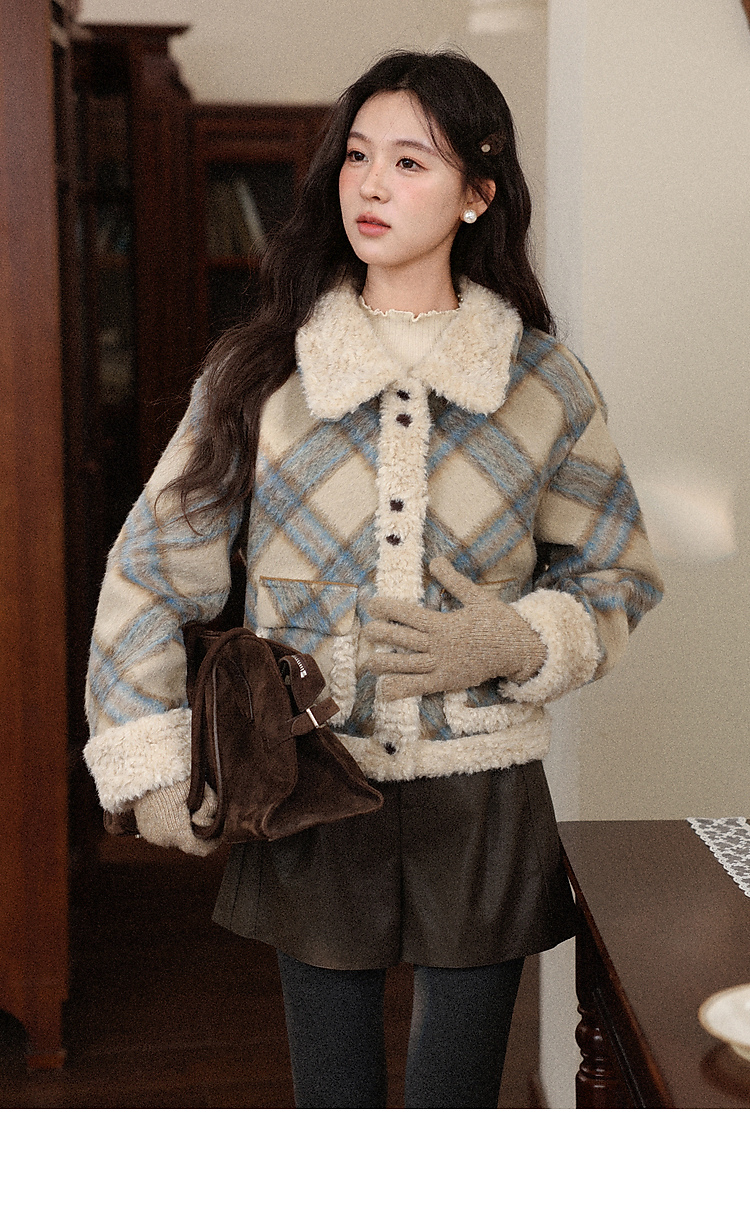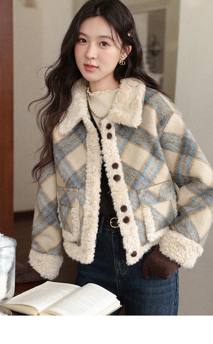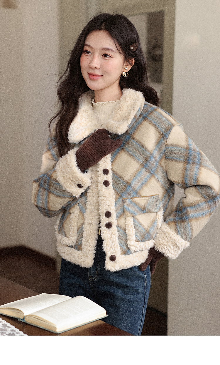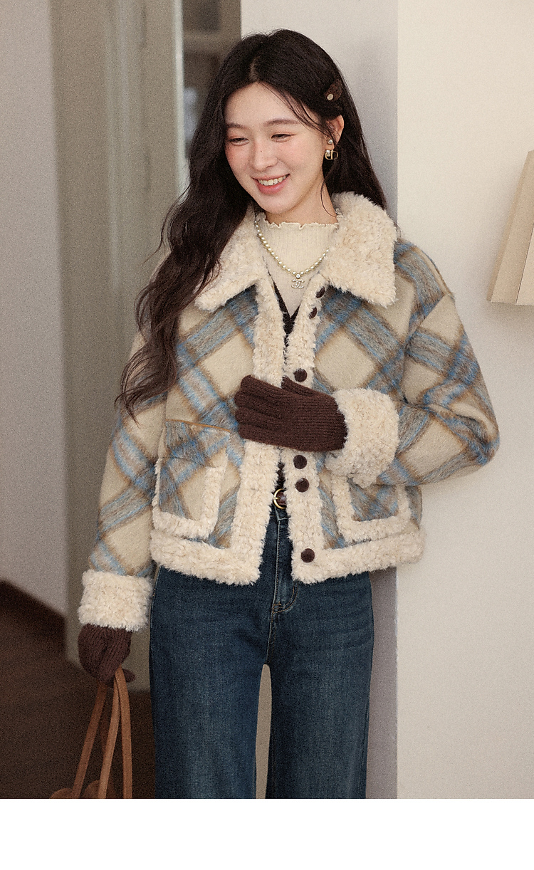 鹿向南「方格物语」卡其色格纹短款外套女冬季宽松保暖羊羔绒上衣