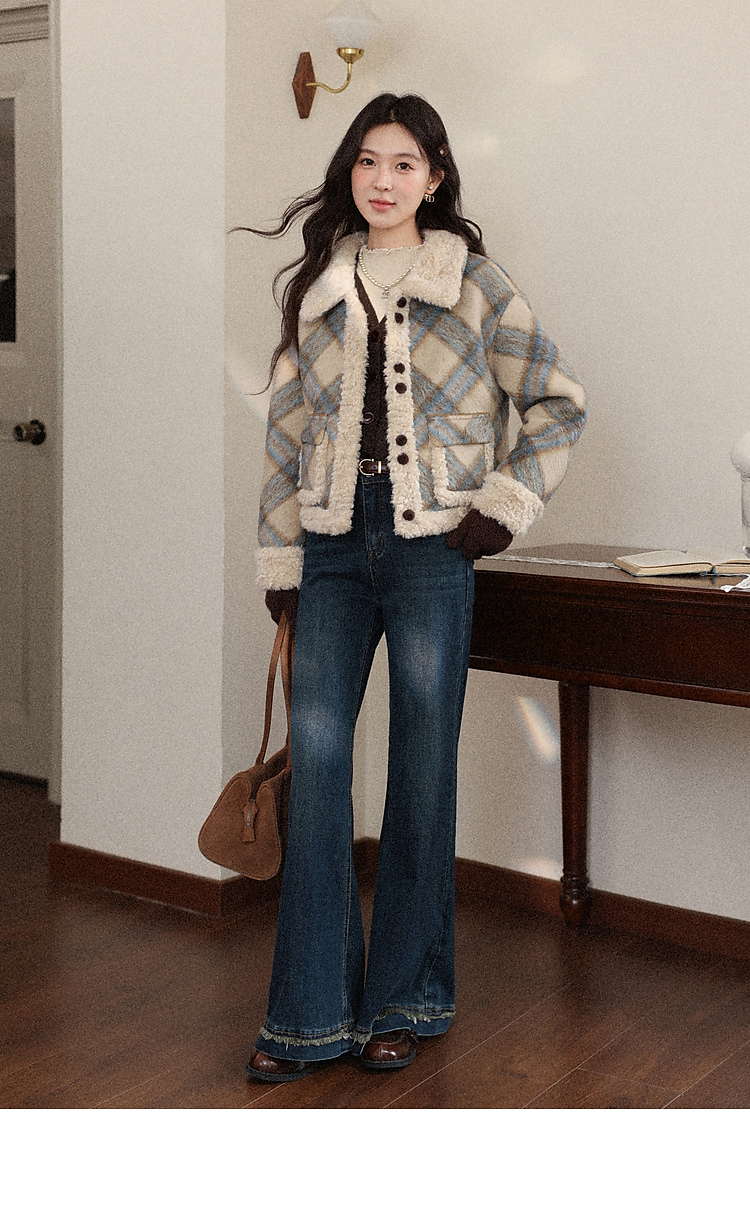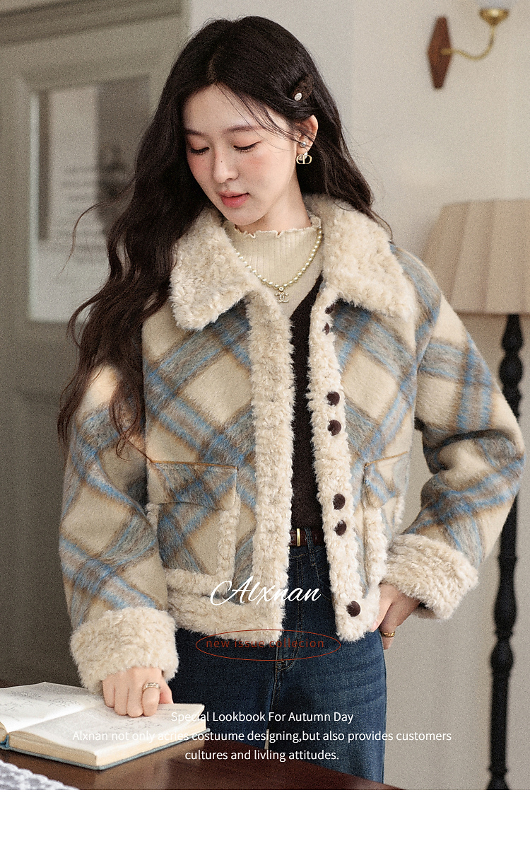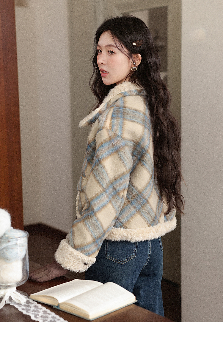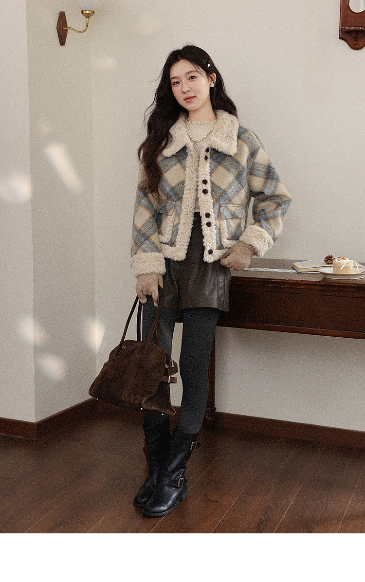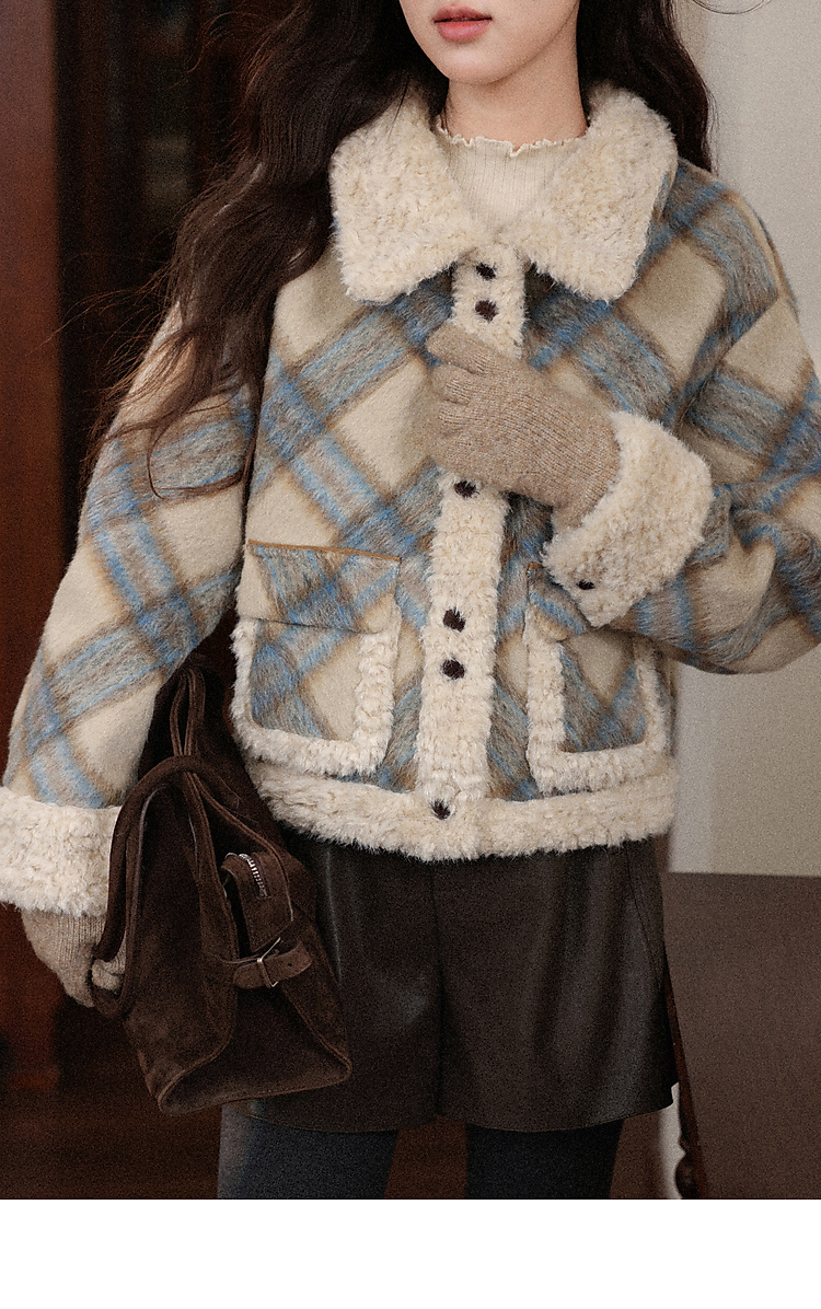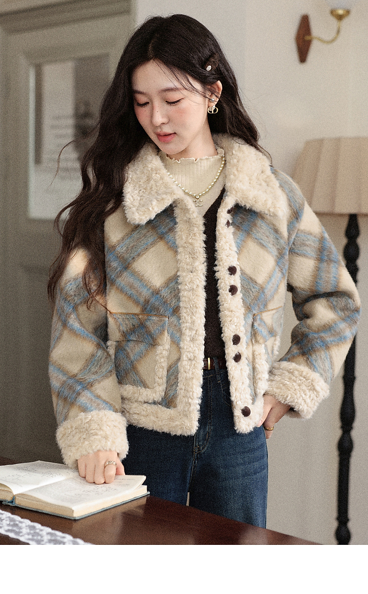 鹿向南「方格物语」卡其色格纹短款外套女冬季宽松保暖羊羔绒上衣