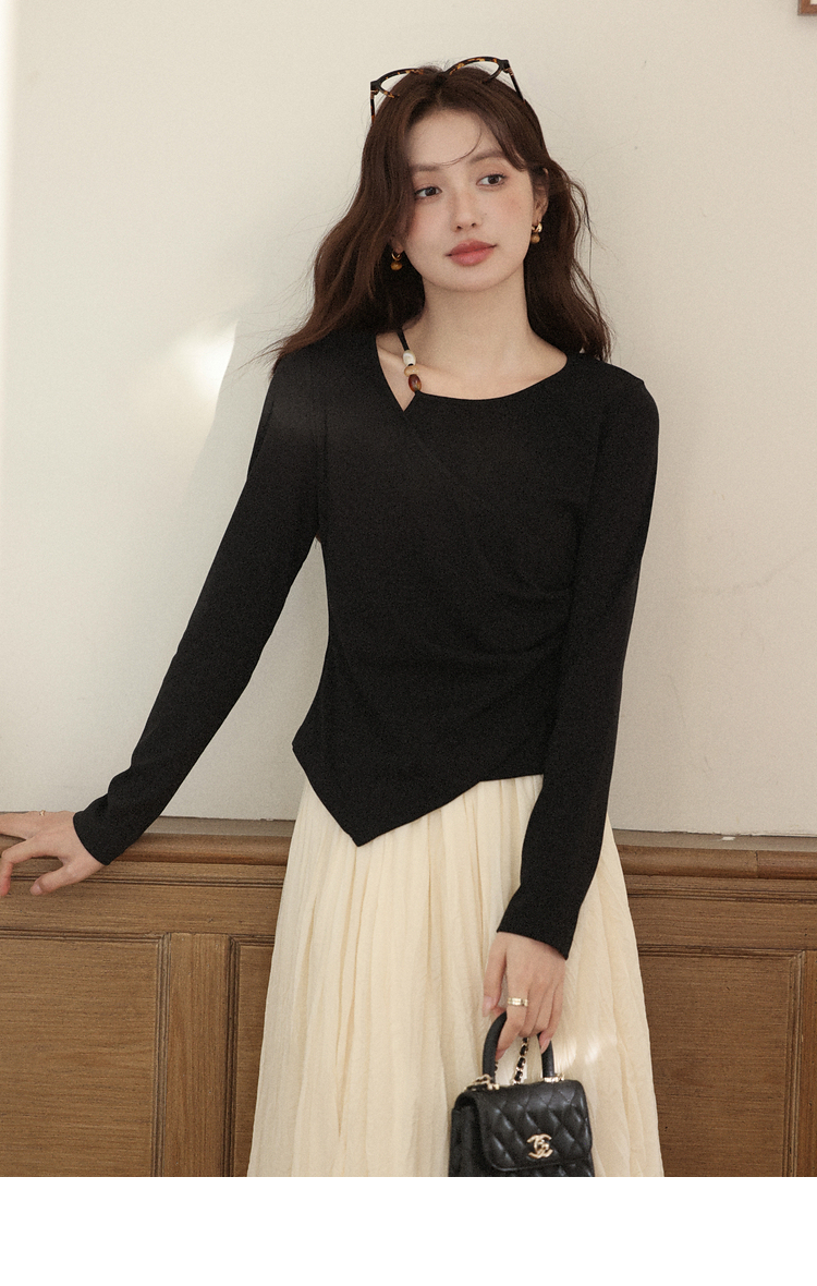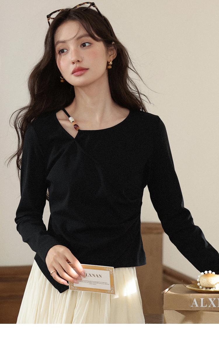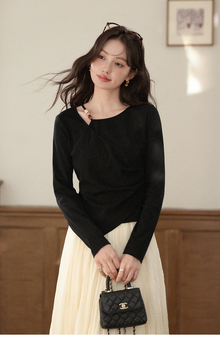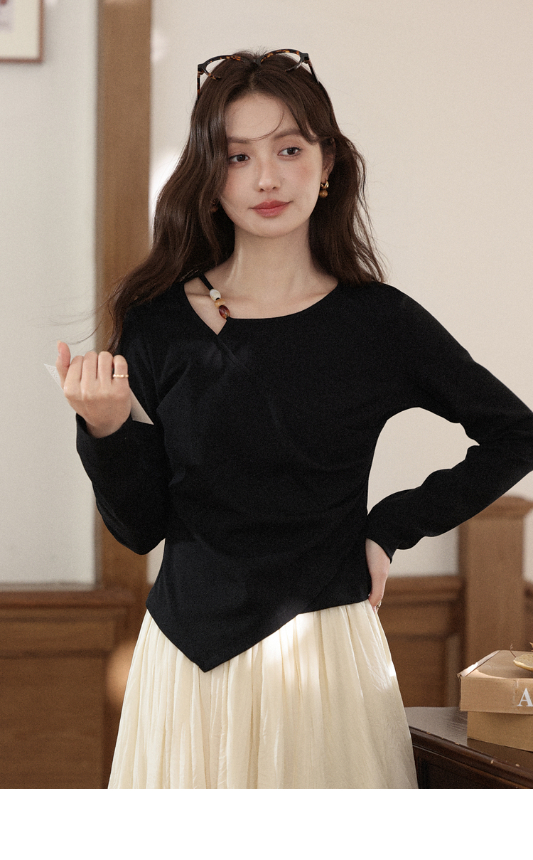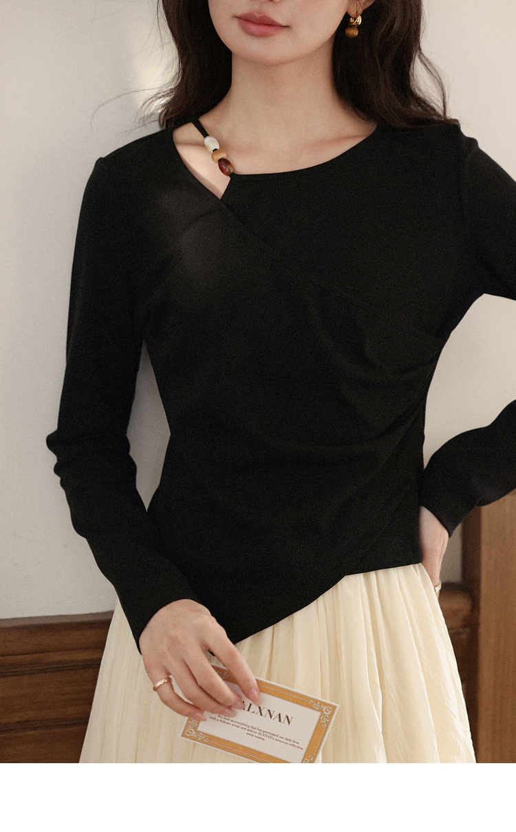 鹿向南「尼斯漫记」设计感黑色长袖T恤秋季新款新中式修身上衣女