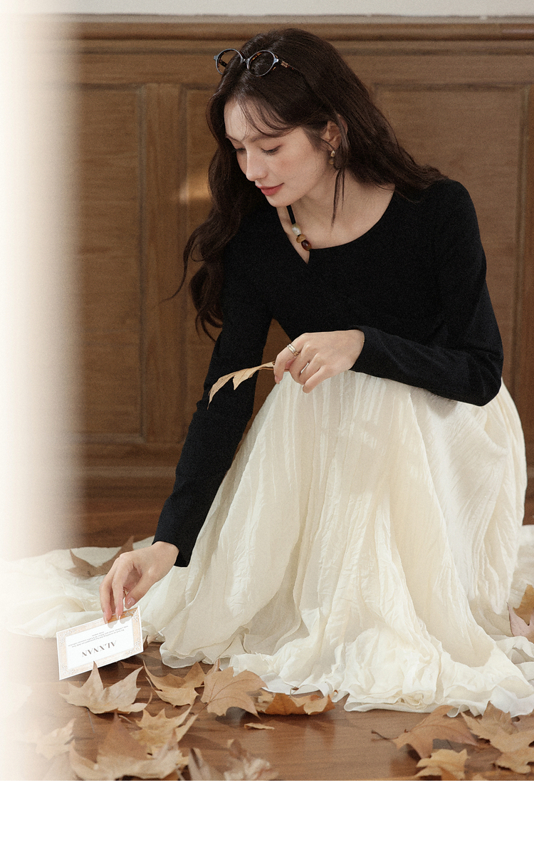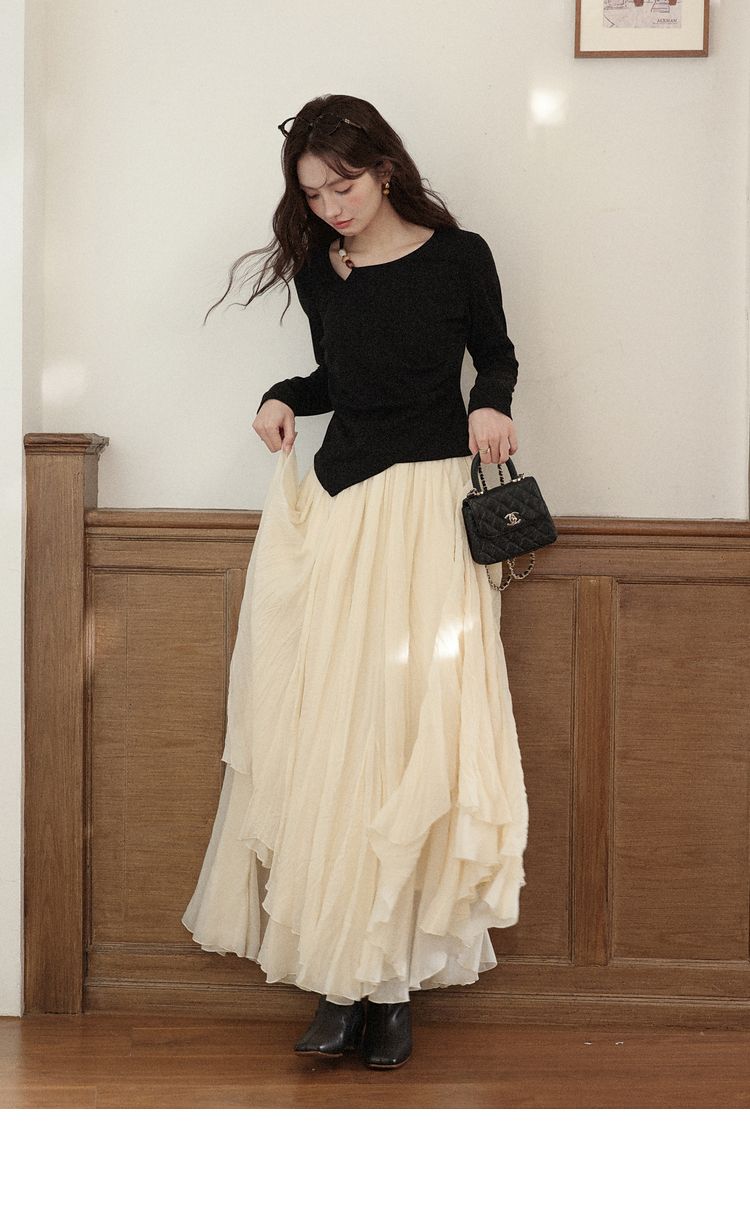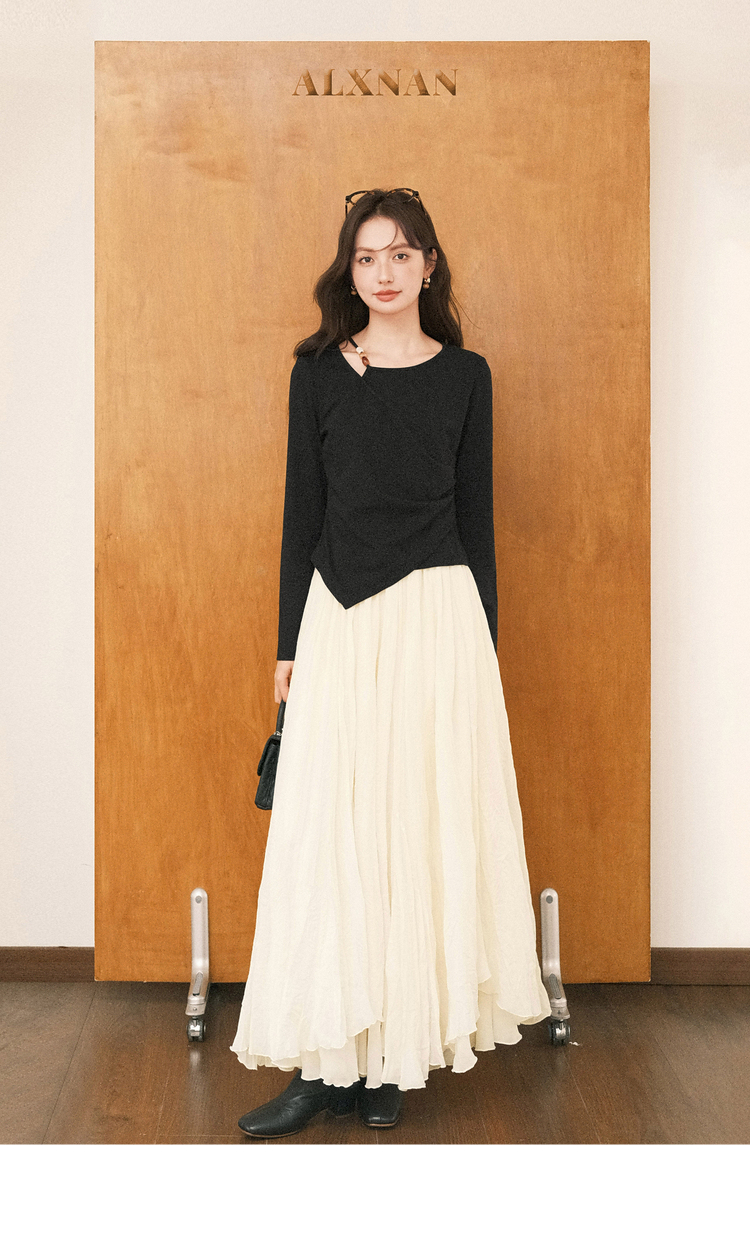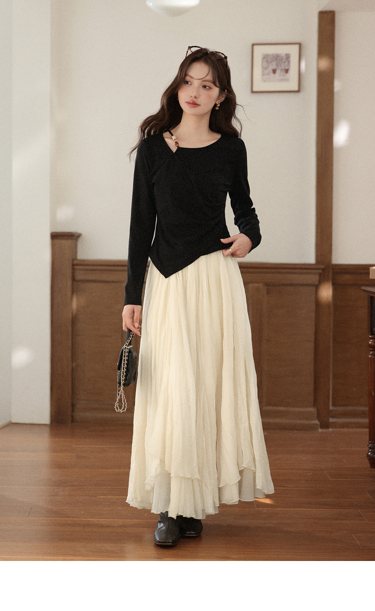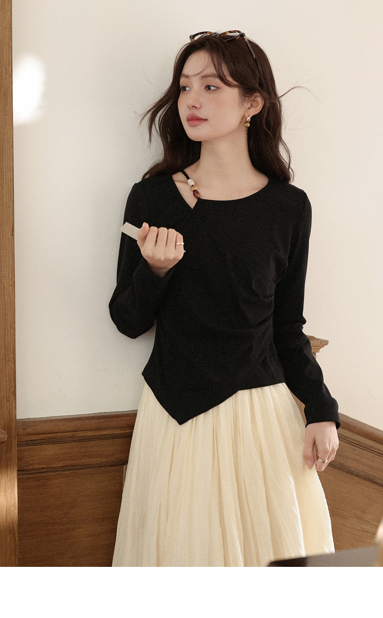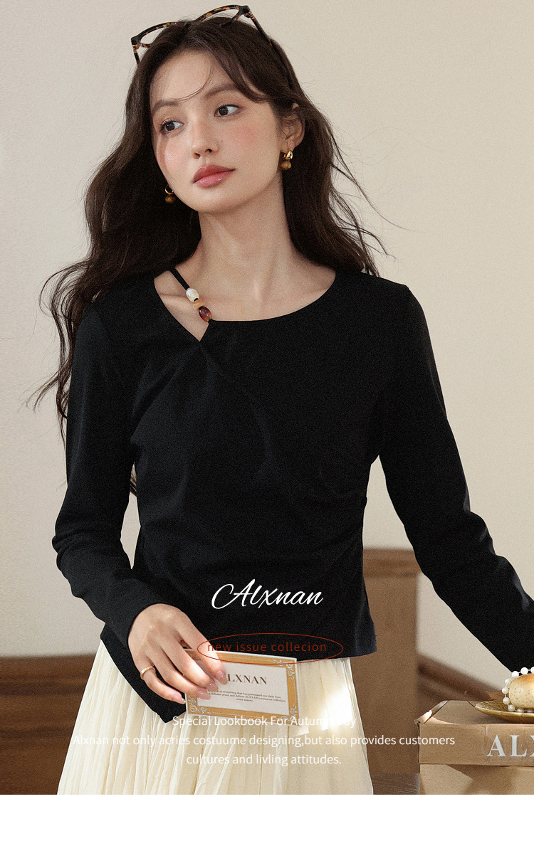 鹿向南「尼斯漫记」设计感黑色长袖T恤秋季新款新中式修身上衣女