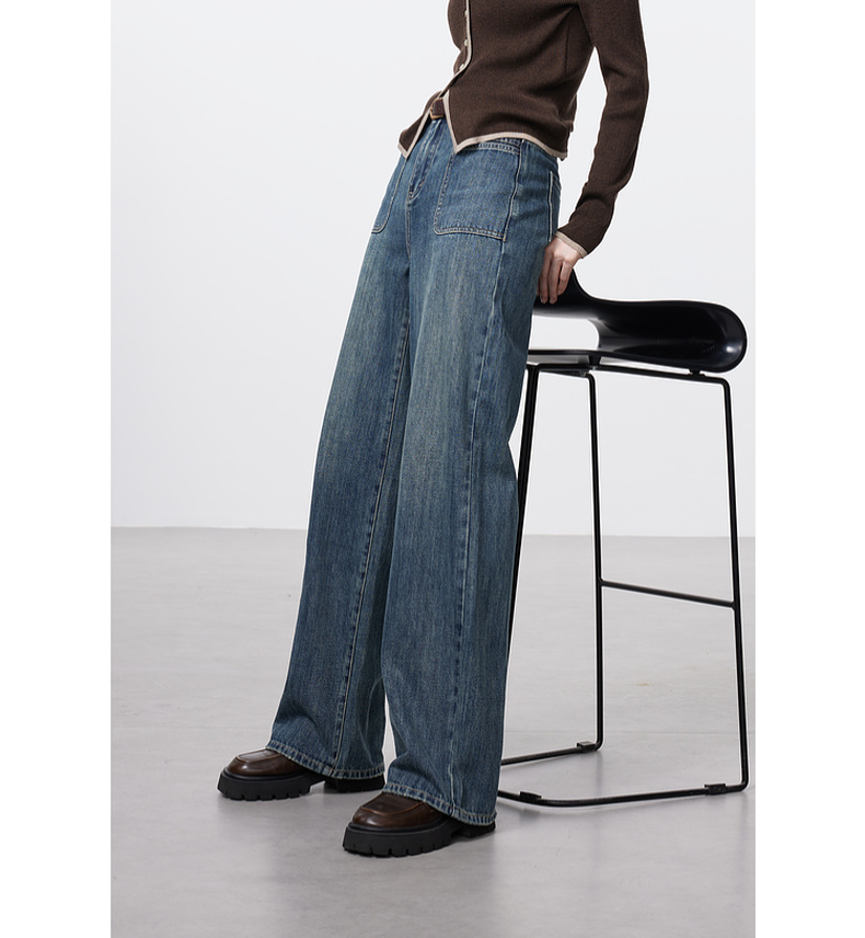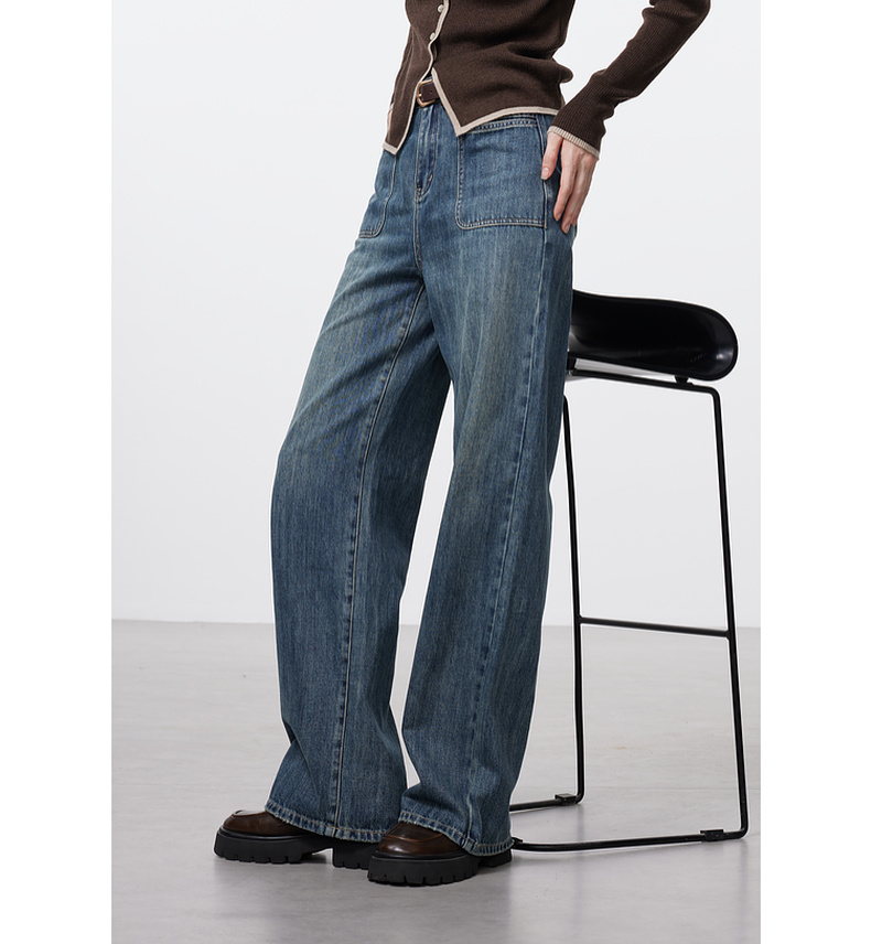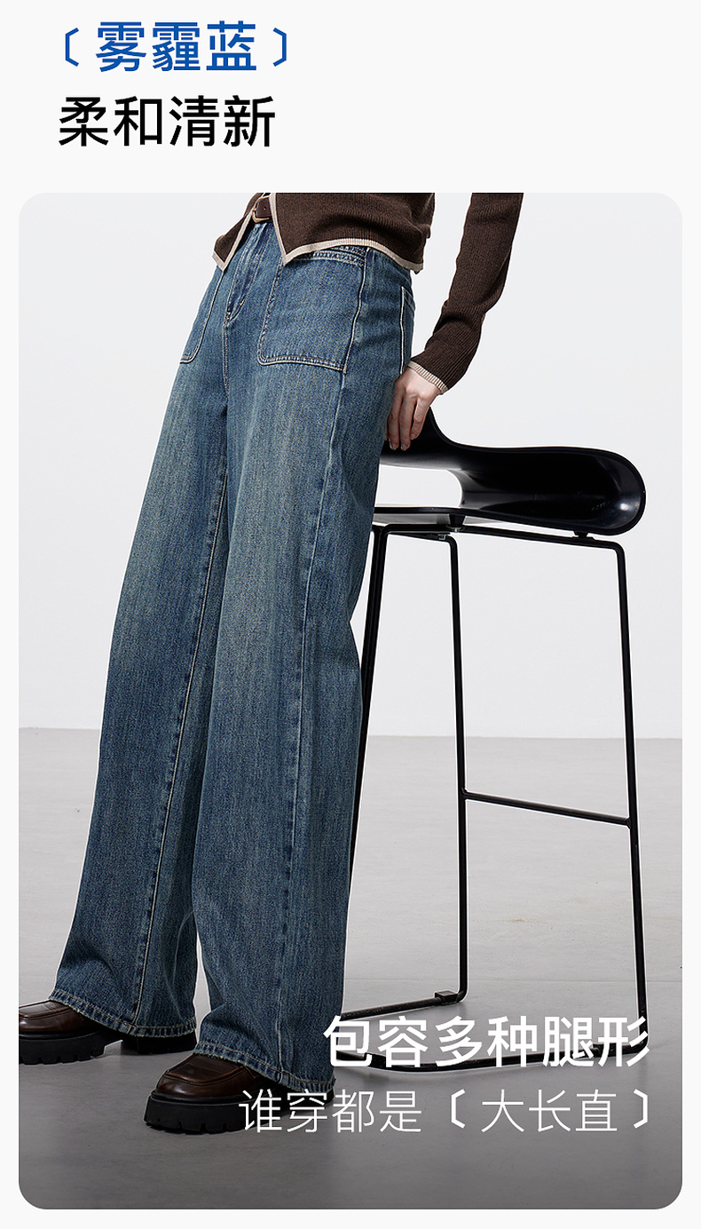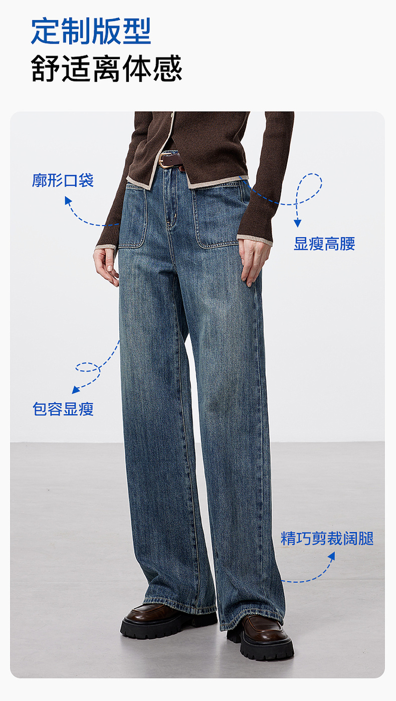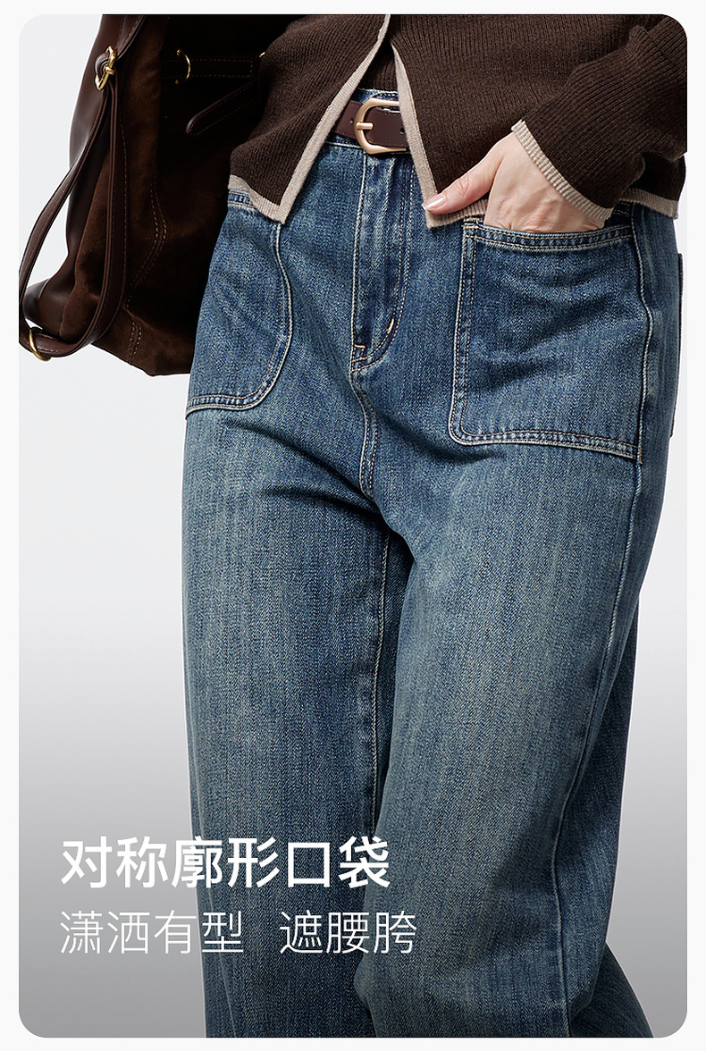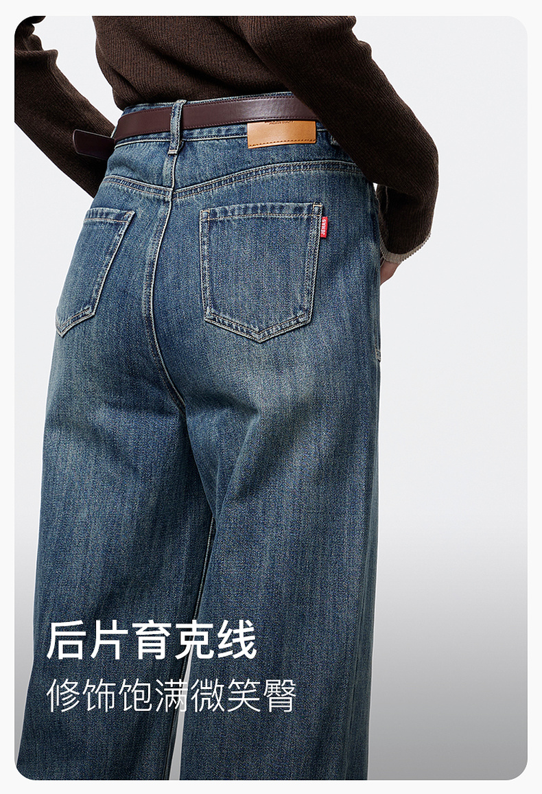 三彩2026春季新款复古水洗牛仔裤高腰宽松阔腿裤长裤大口袋M