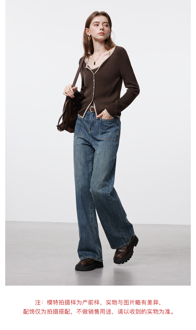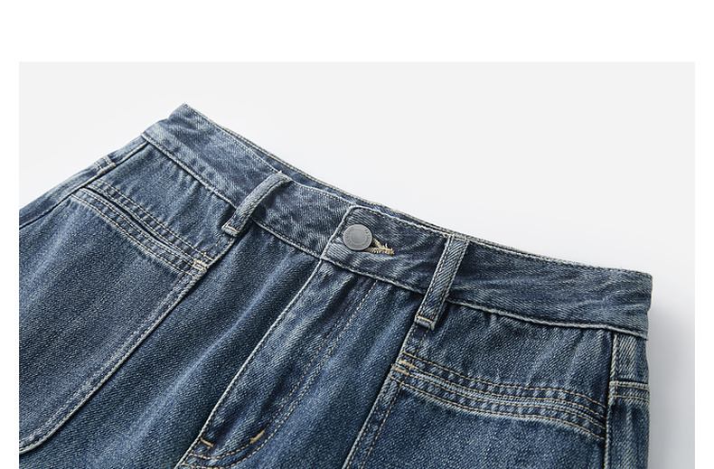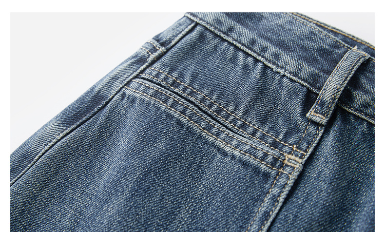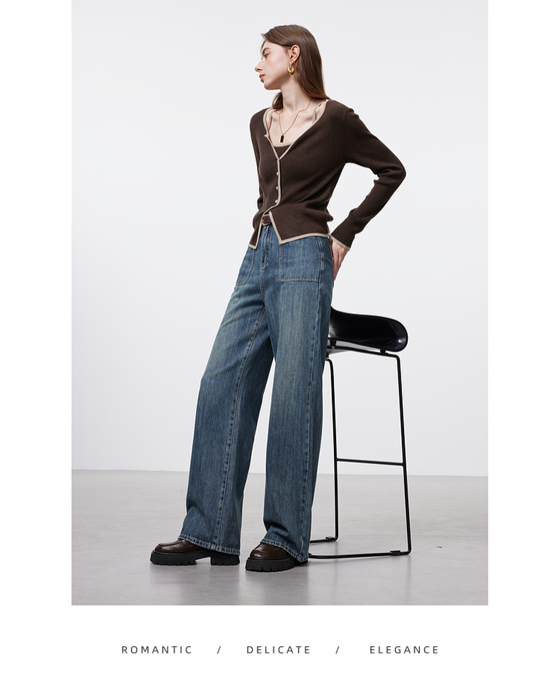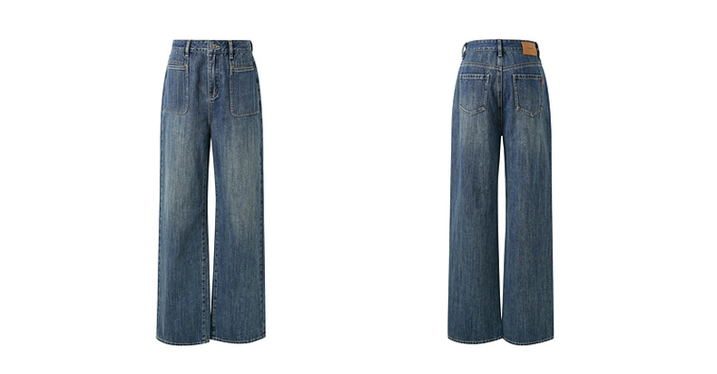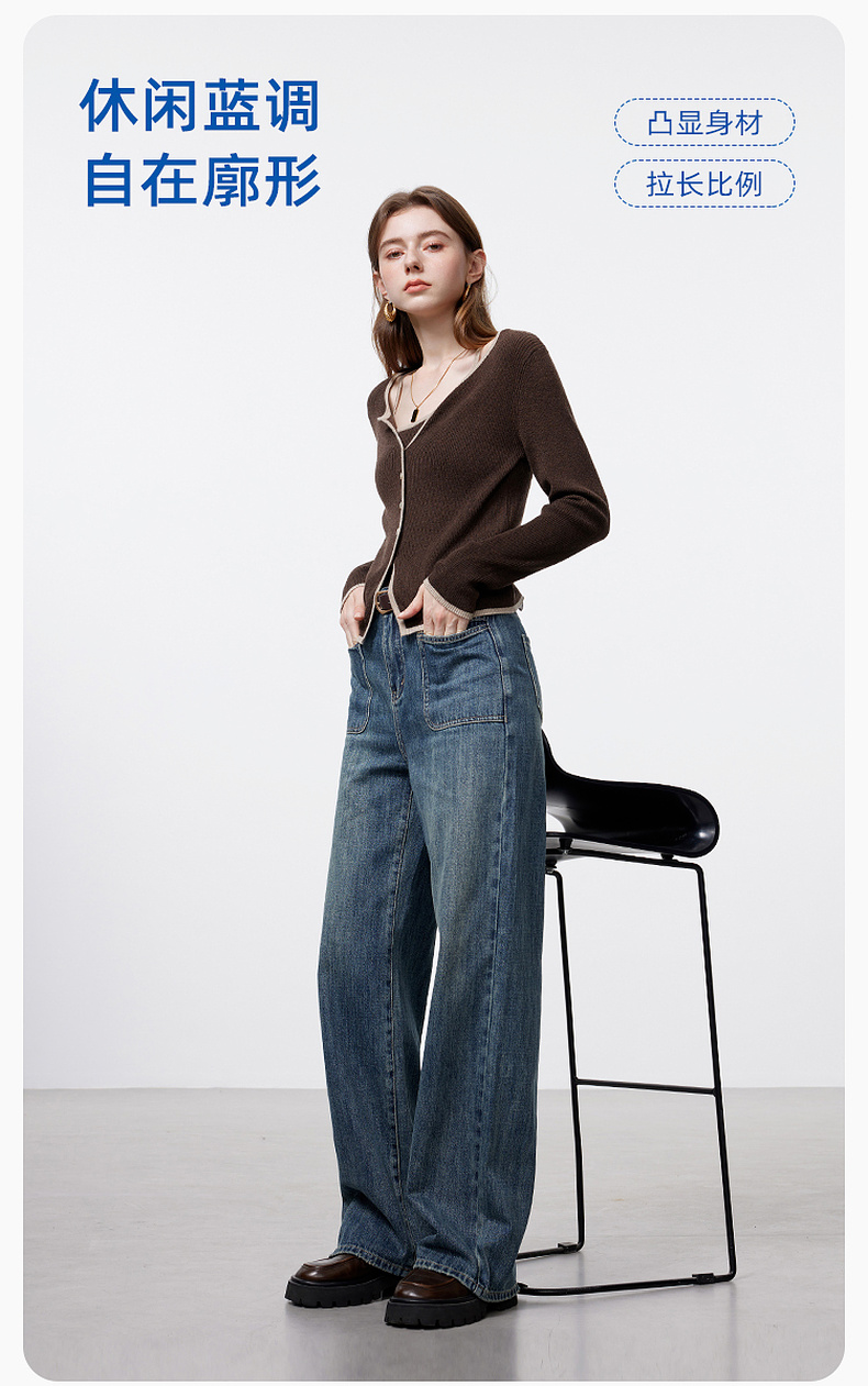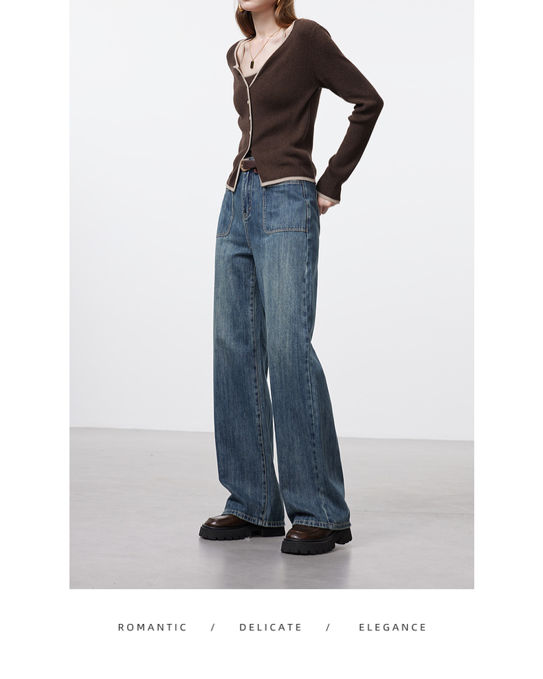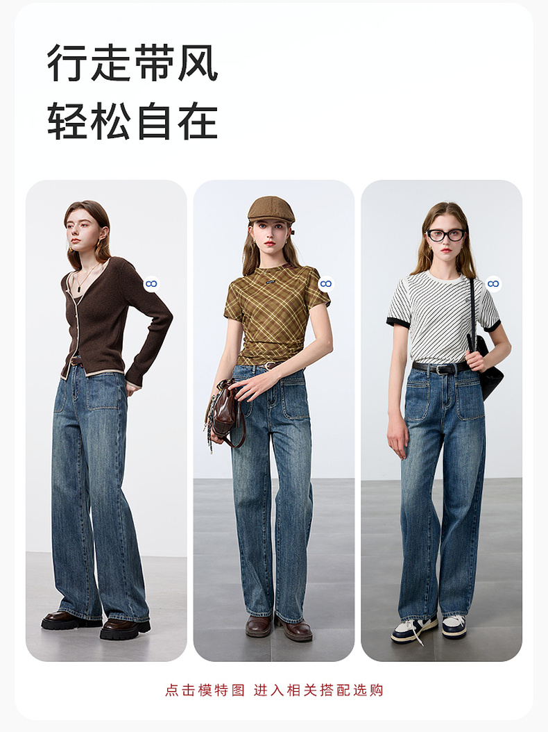 三彩2026春季新款复古水洗牛仔裤高腰宽松阔腿裤长裤大口袋M