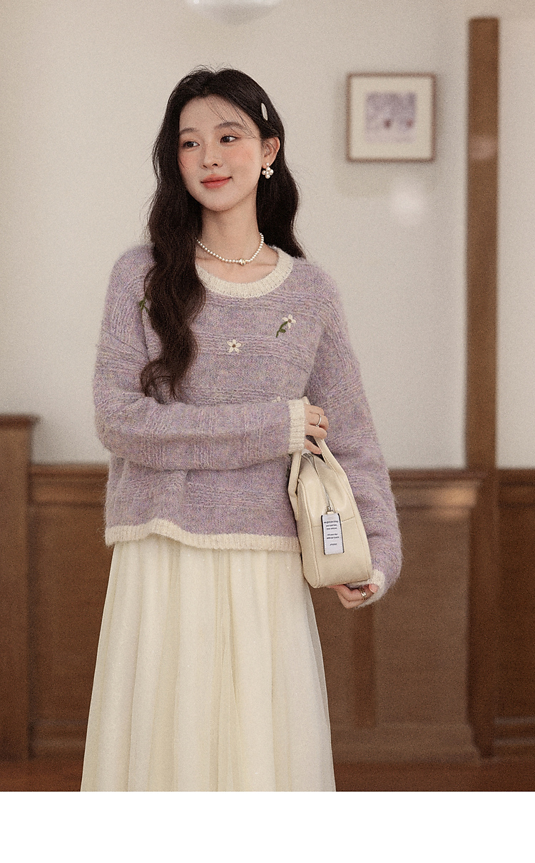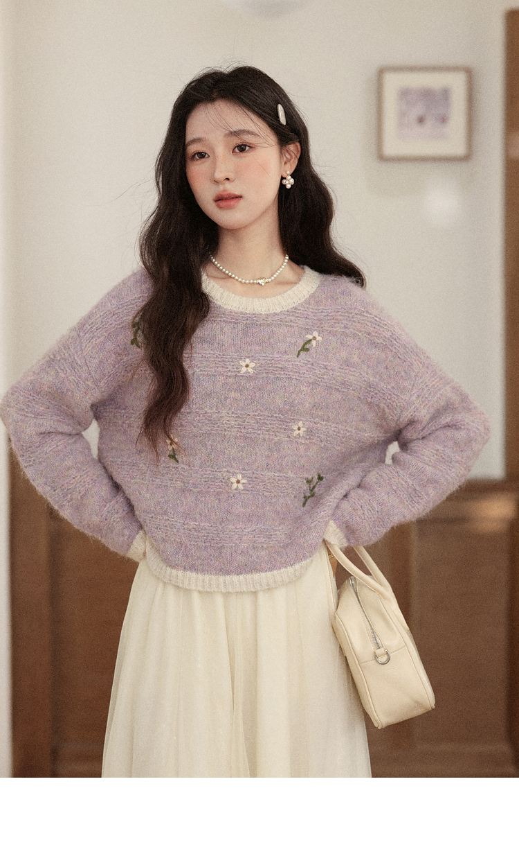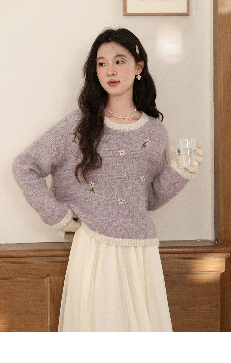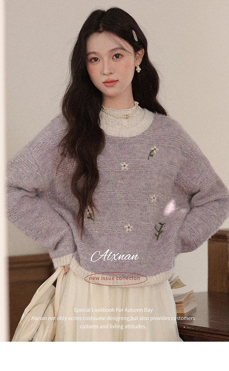 鹿向南「胭紫花语」慵懒风紫色提花圆领气质毛衣女秋宽松显瘦上衣