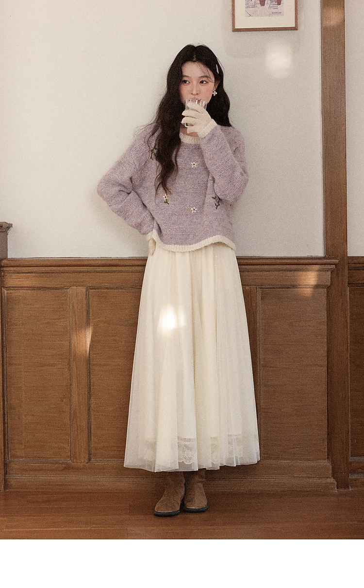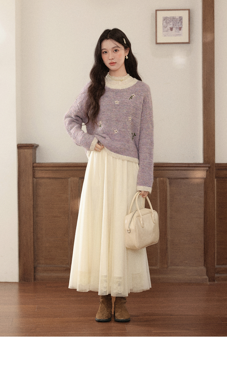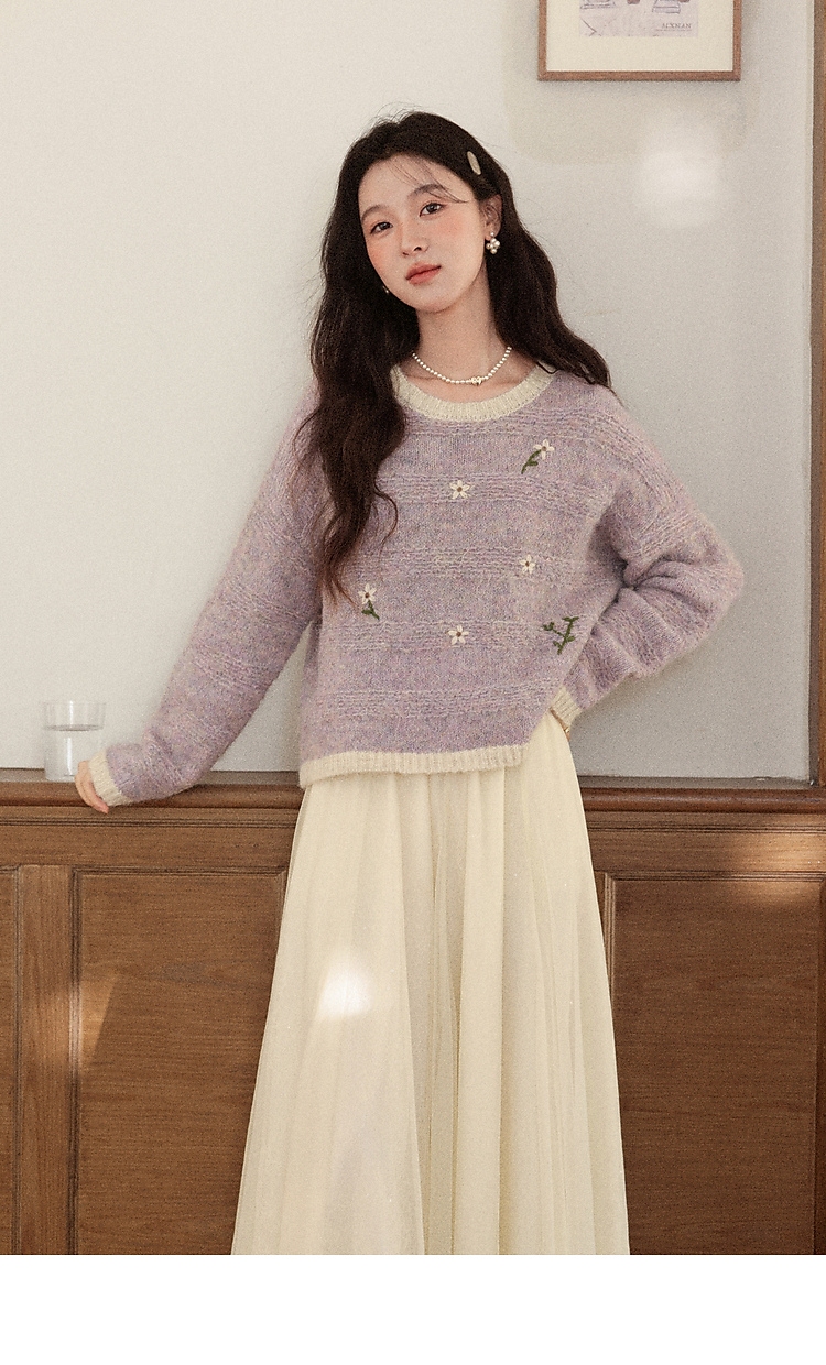 鹿向南「胭紫花语」慵懒风紫色提花圆领气质毛衣女秋宽松显瘦上衣