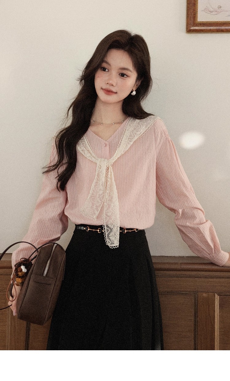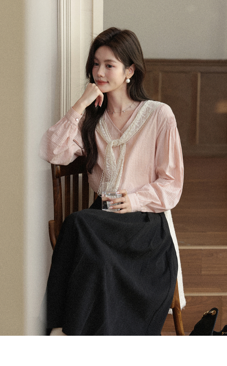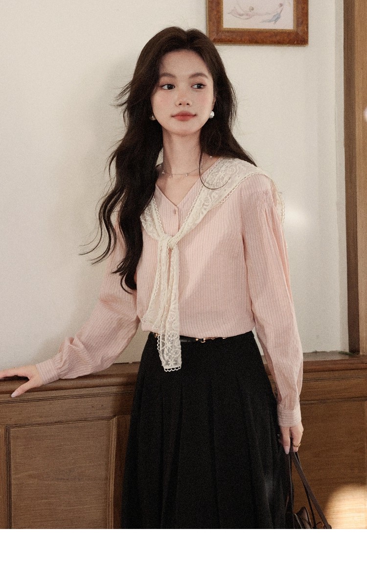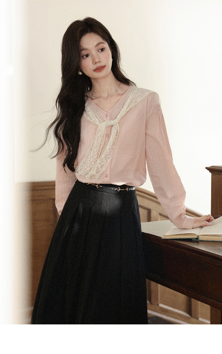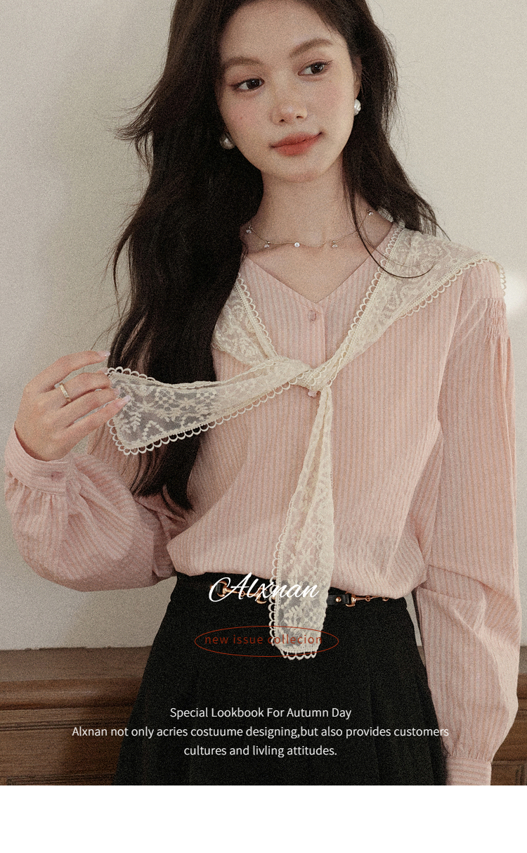 鹿向南「悄然心动」粉色条纹长袖衬衫女2025秋季新款法式甜美上衣L569102