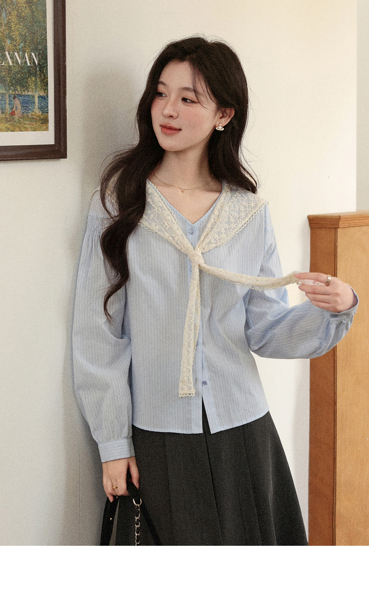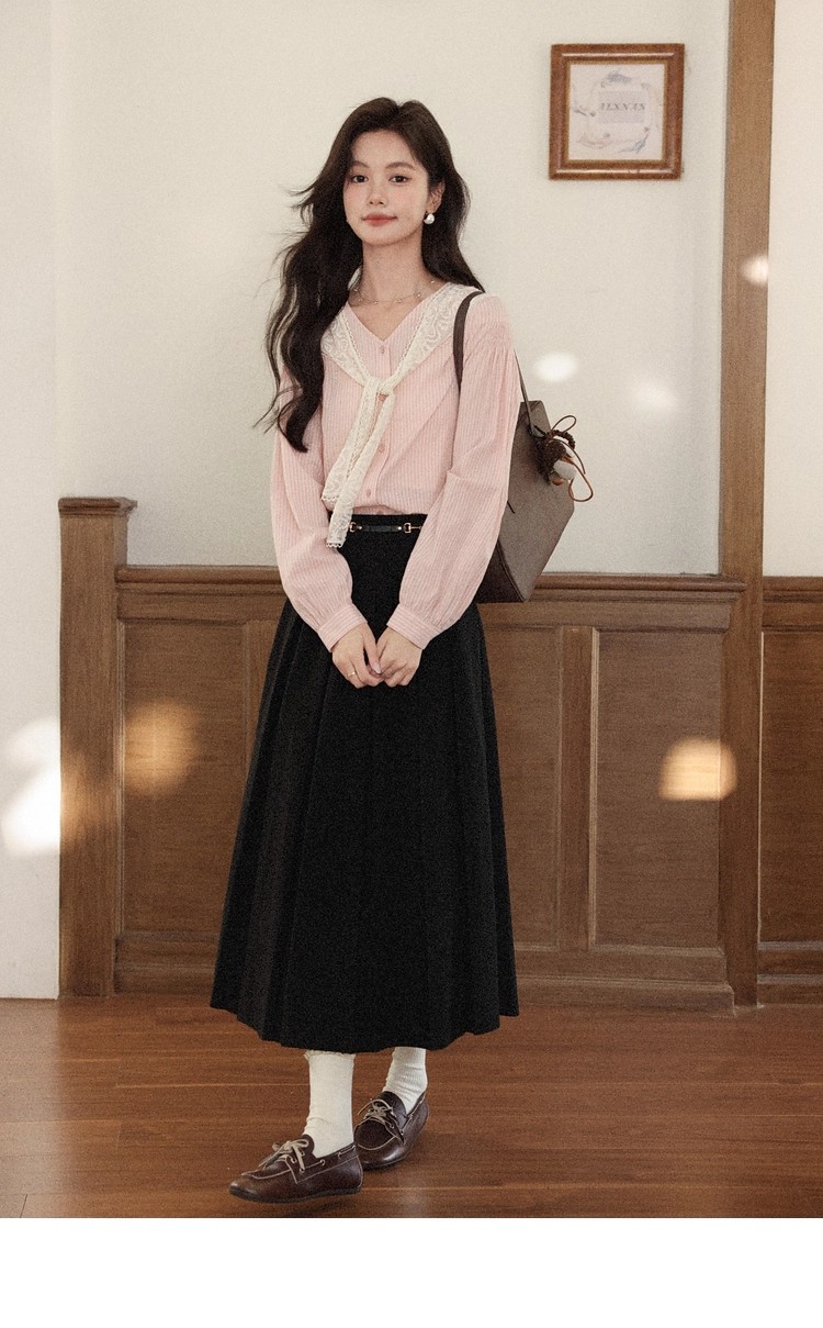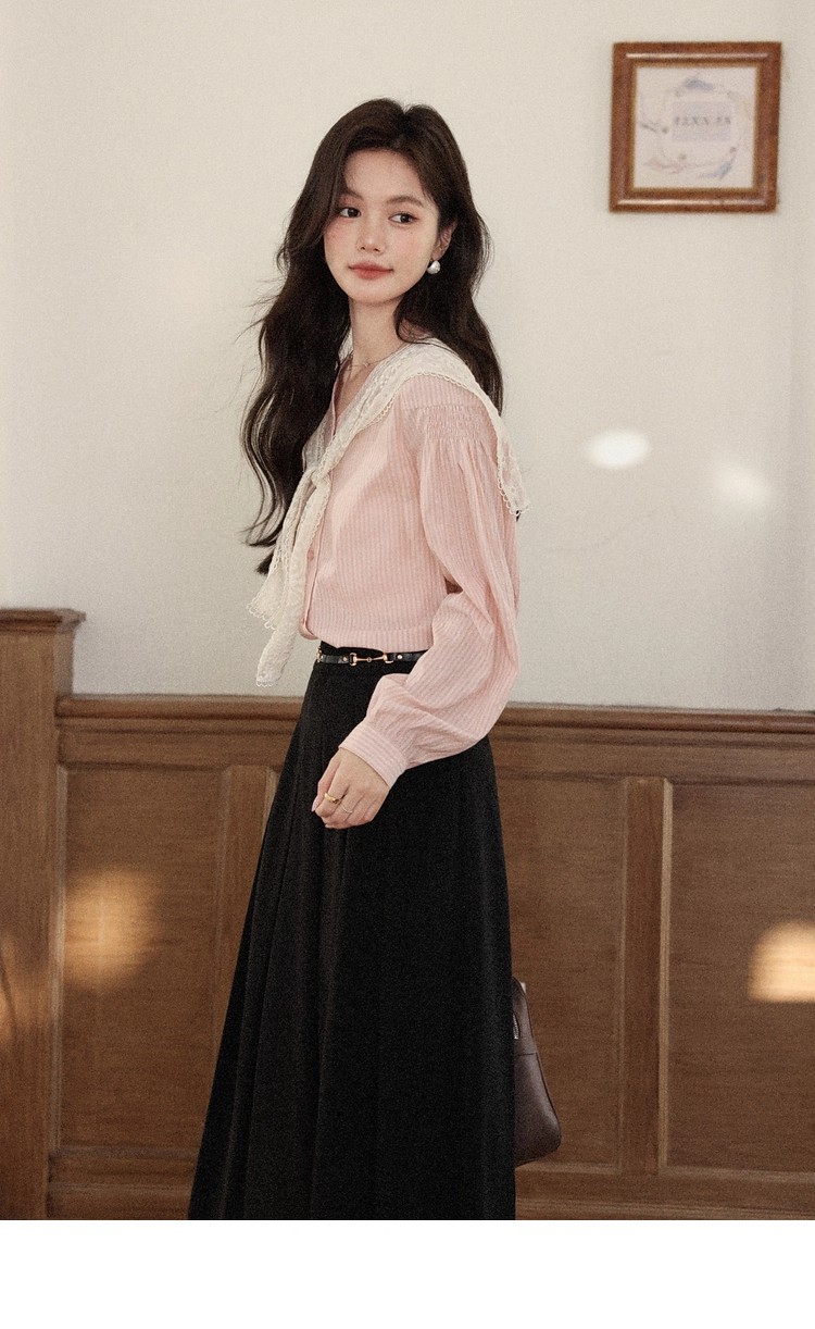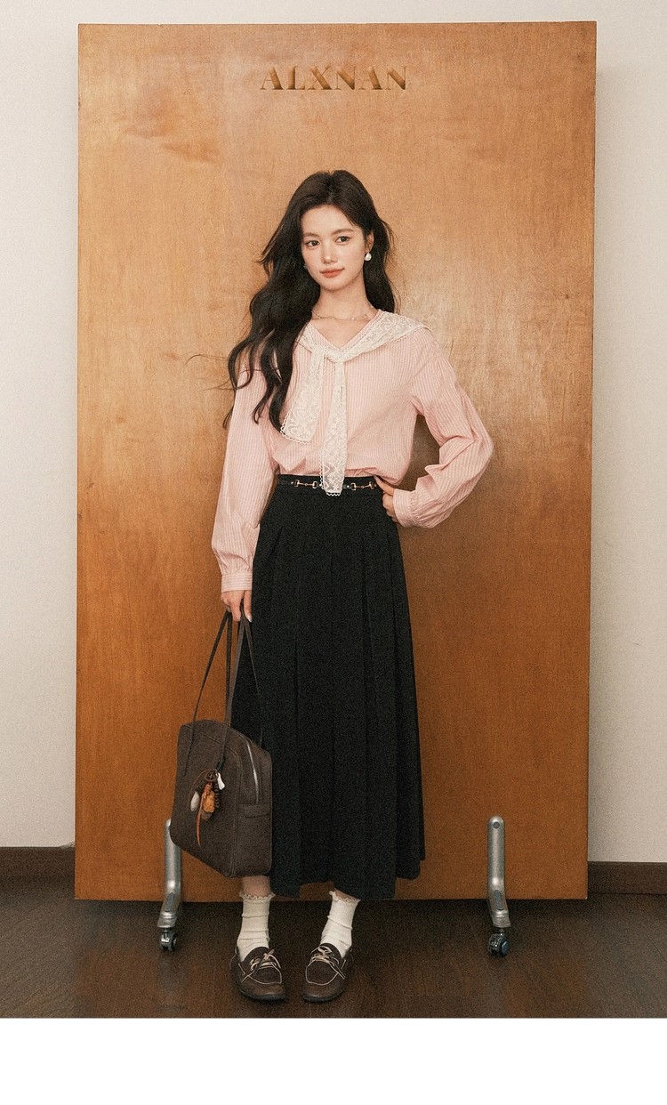 鹿向南「悄然心动」粉色条纹长袖衬衫女2025秋季新款法式甜美上衣L569102