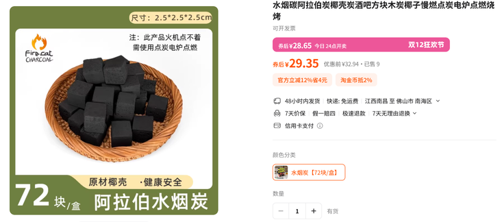 这个说自己是水烟碳的价格29.35元(72块),写明了火机点不着,需要电炉来点,但它这个并不是高密度,不耐烧。