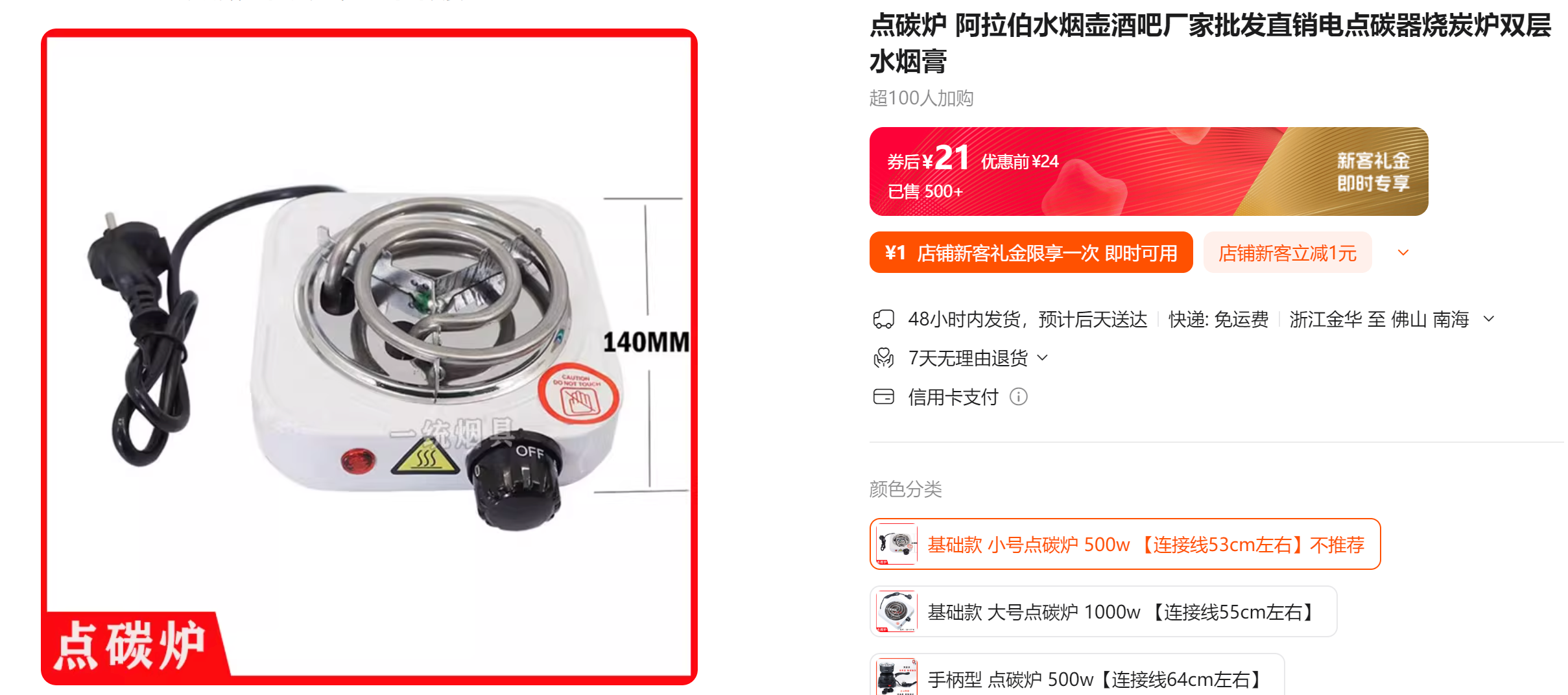 好的水烟炭密度高且无杂质,所以成本很高,而且也不易点燃,专业的都用电子点碳炉,约20元左右,有需要的也可以淘宝买一个: