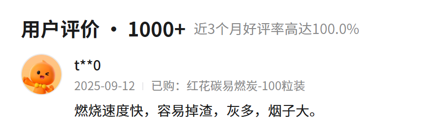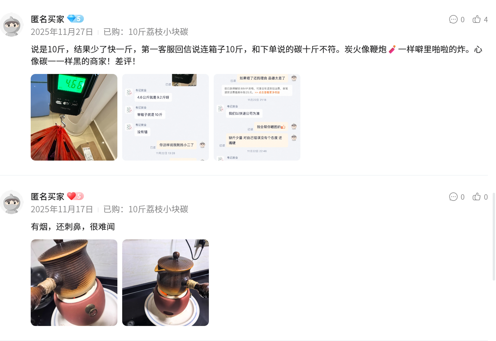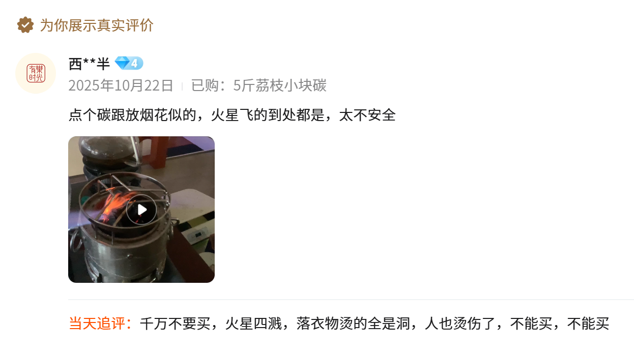 评论:炭火像鞭炮🧨一样噼里啪啦的炸、有烟,还刺鼻,很难闻