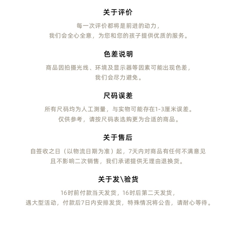 1.七天无理由退换货,商品须包装齐全,有异味、污渍、破损、剪标,下水等影响二次销售情况不接受退换货