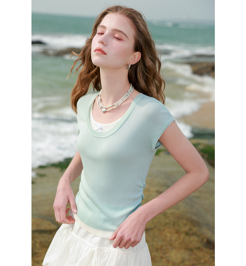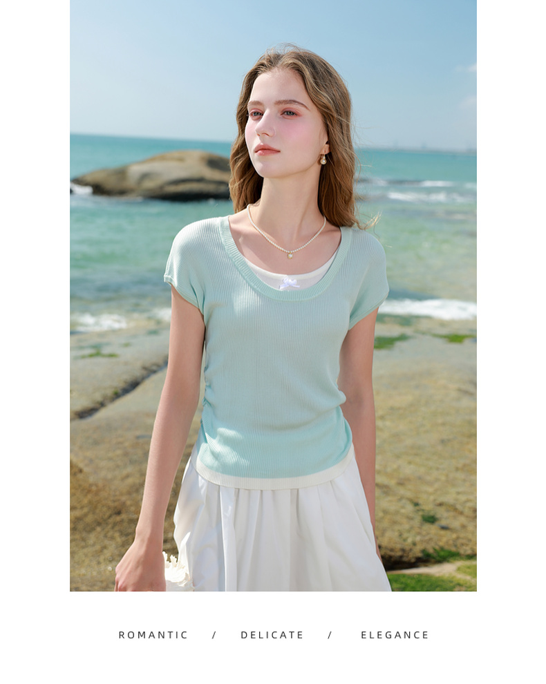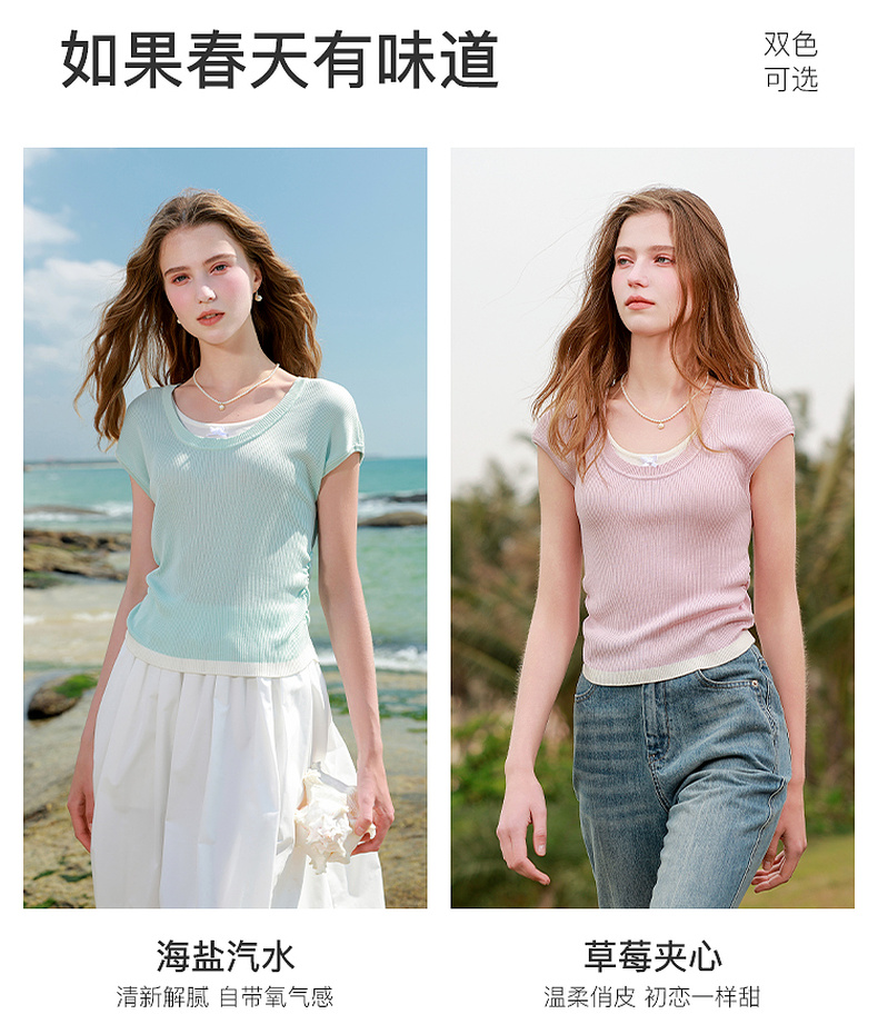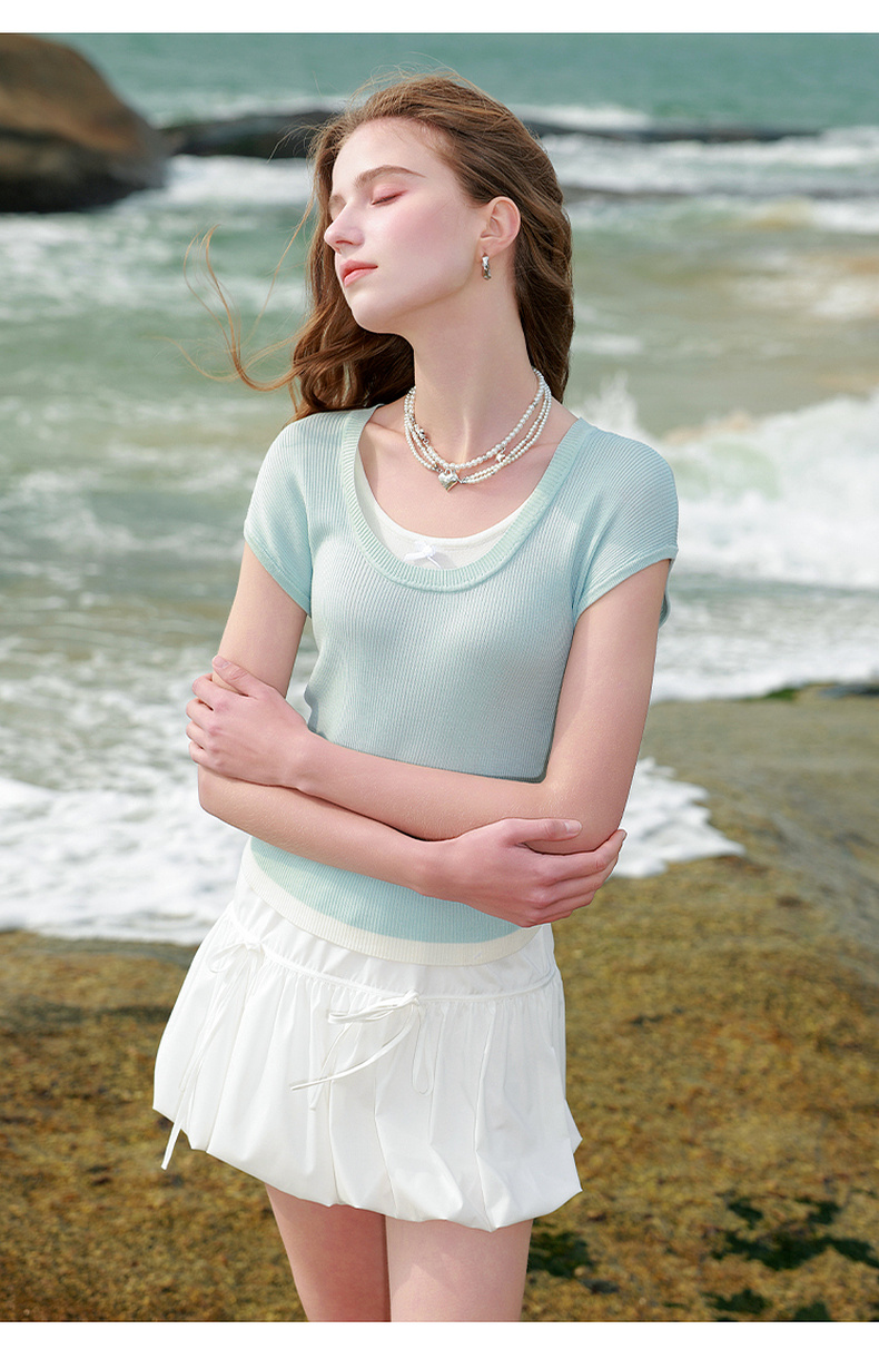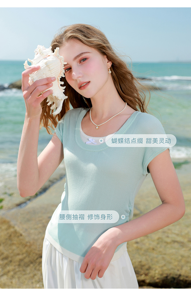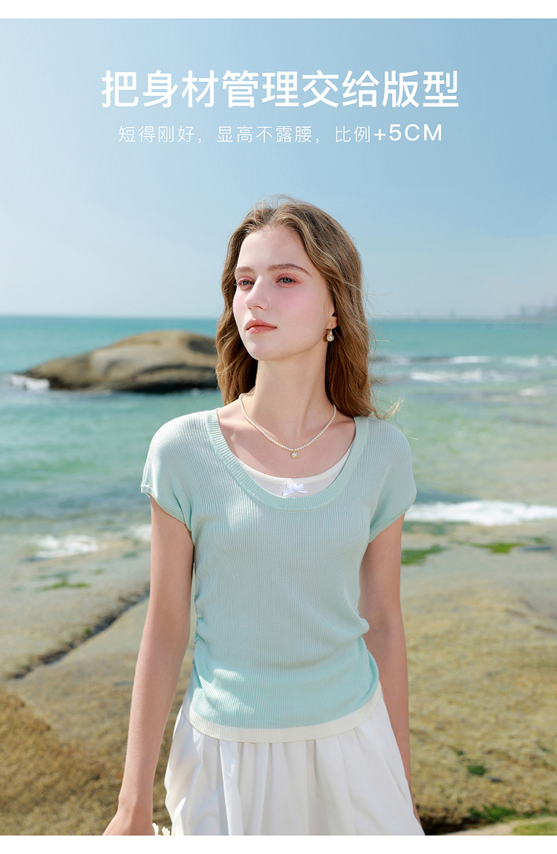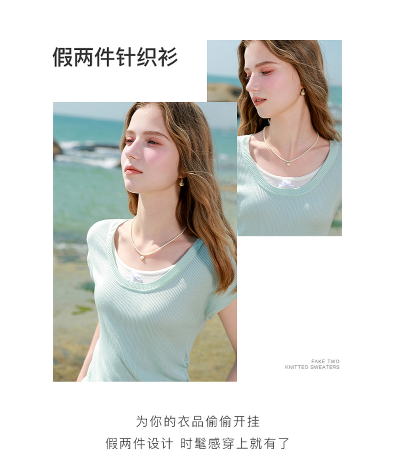 三彩独醒2025春季新款修身短款假两件针织衫蝴蝶结圆领毛衣F