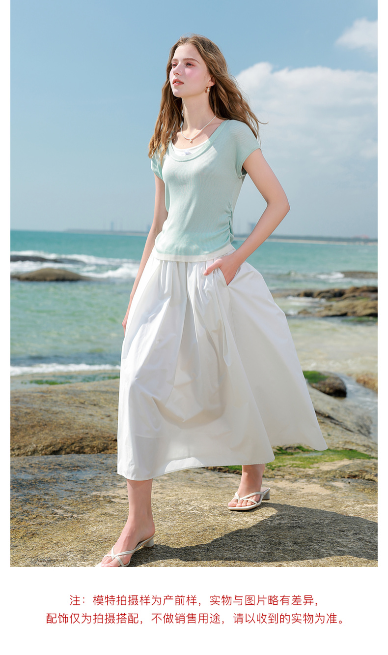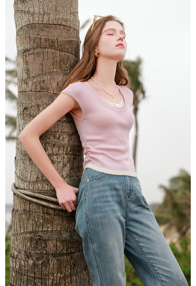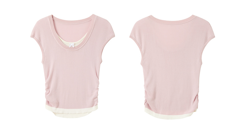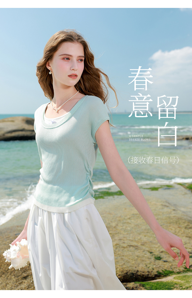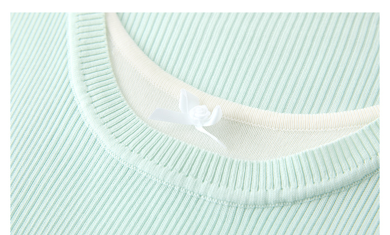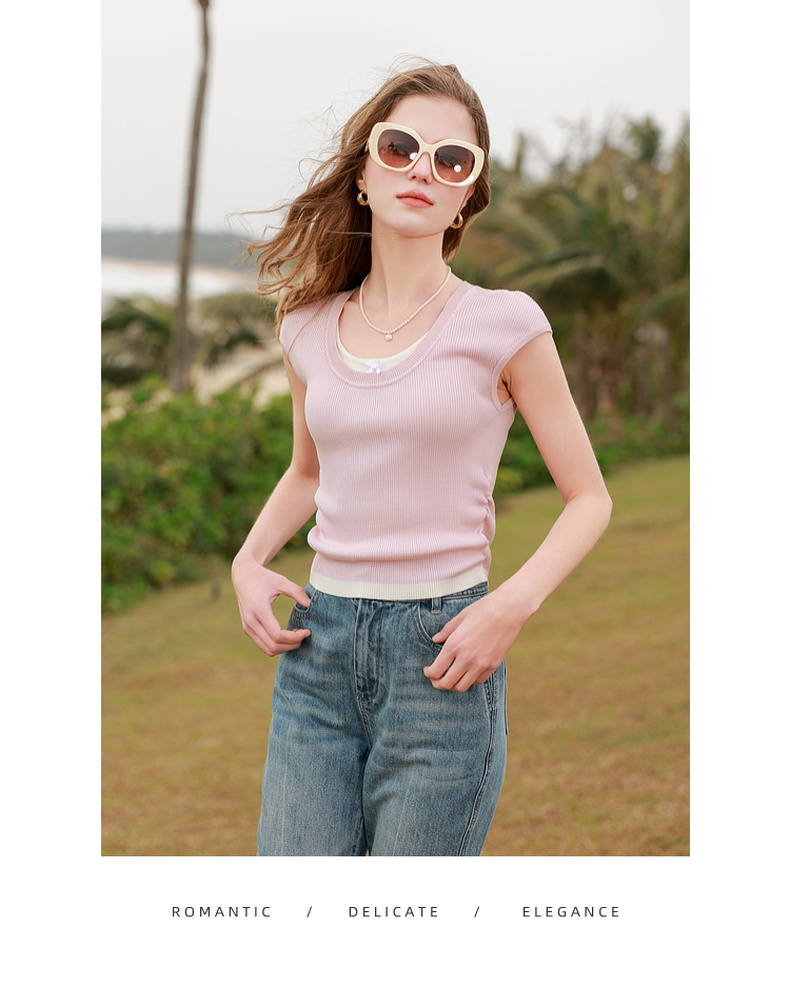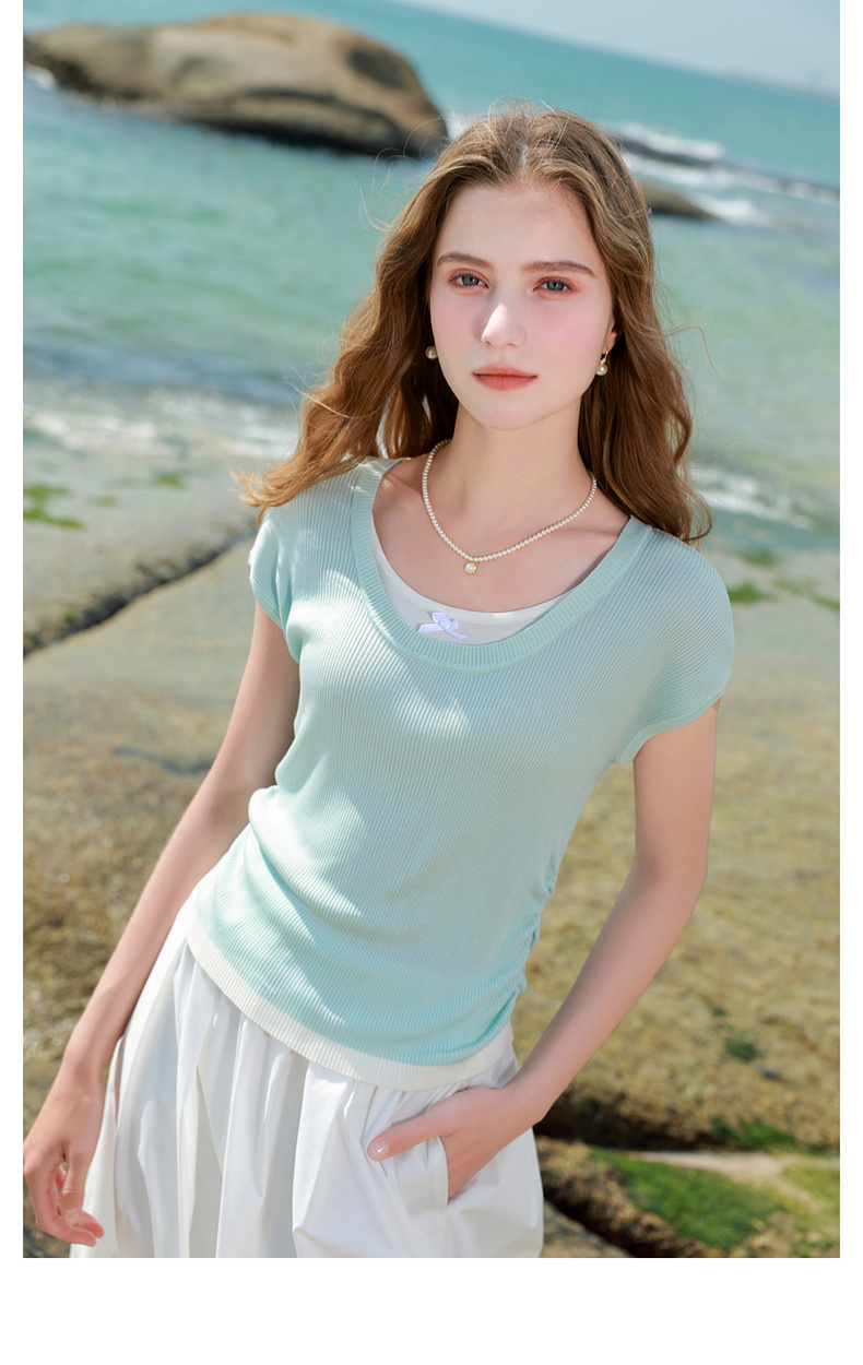 三彩独醒2025春季新款修身短款假两件针织衫蝴蝶结圆领毛衣F