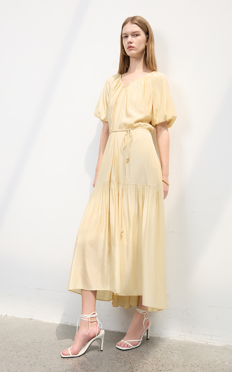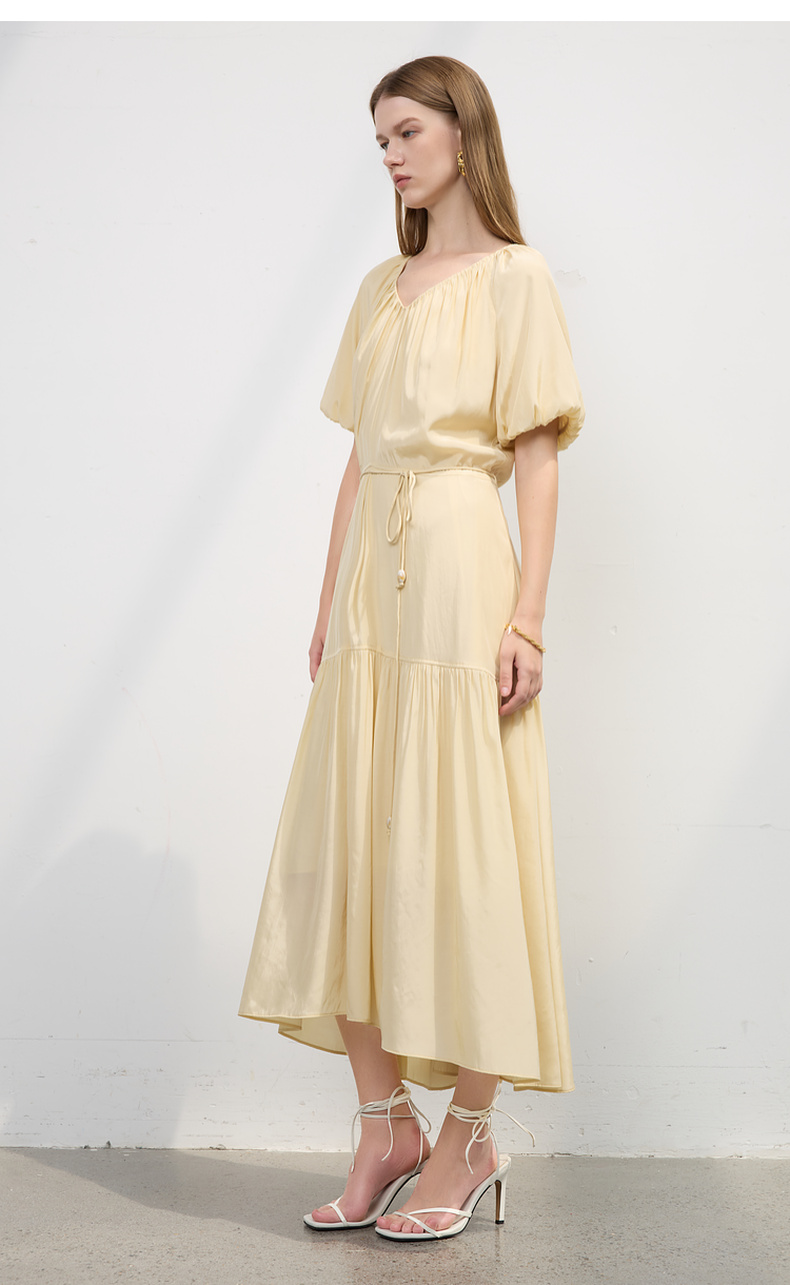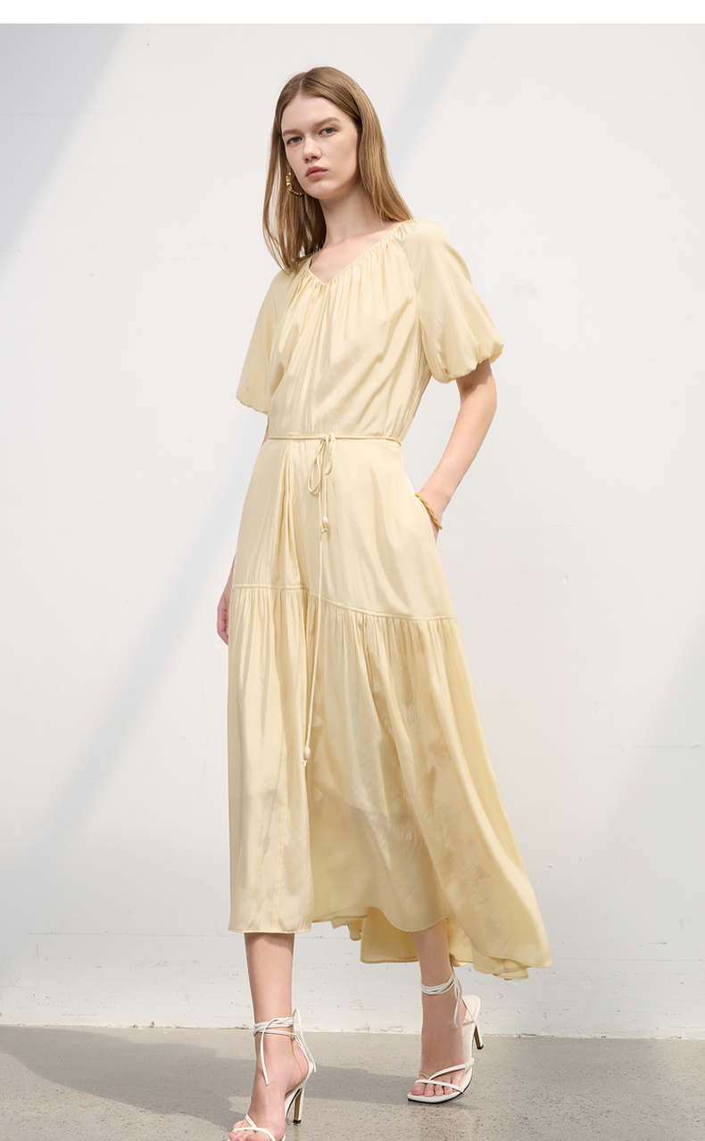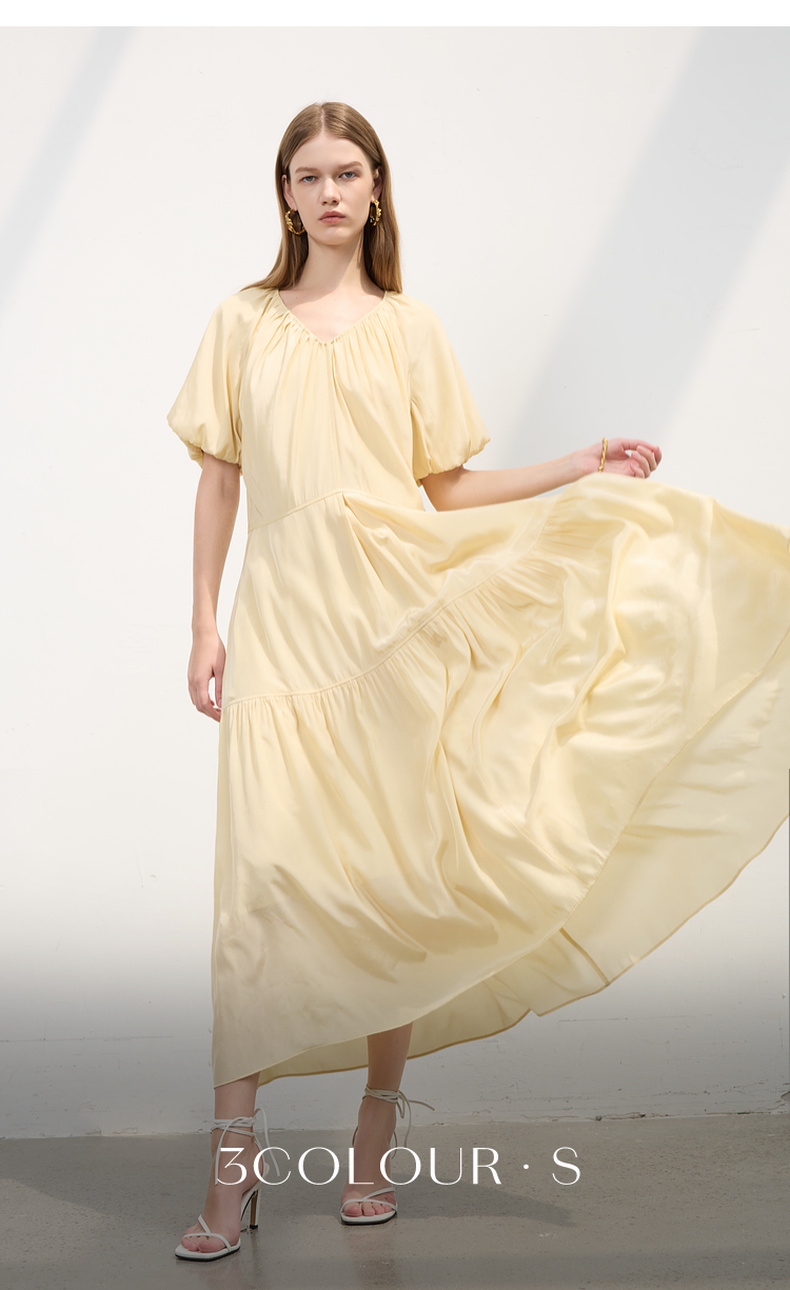 三彩2025夏季新款纯色连衣裙V领宽松A字裙腰绳短袖长裙度假S