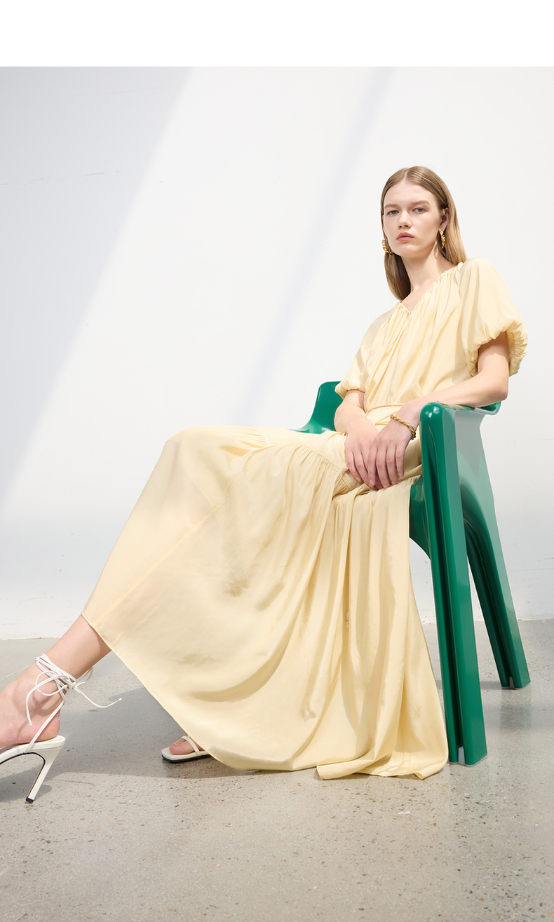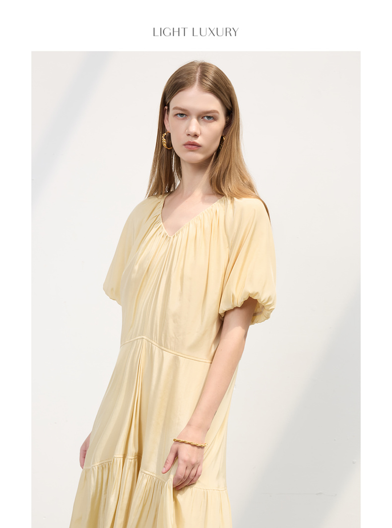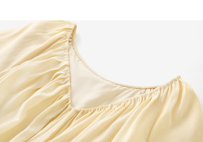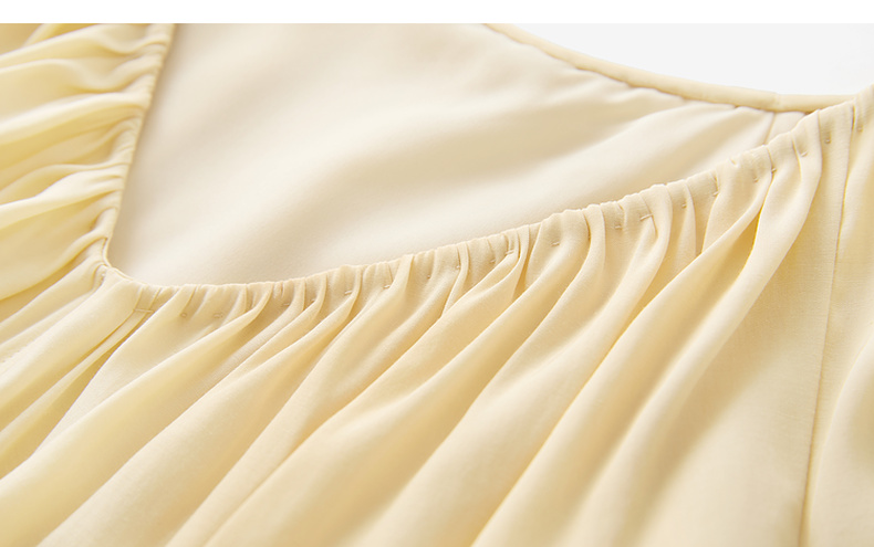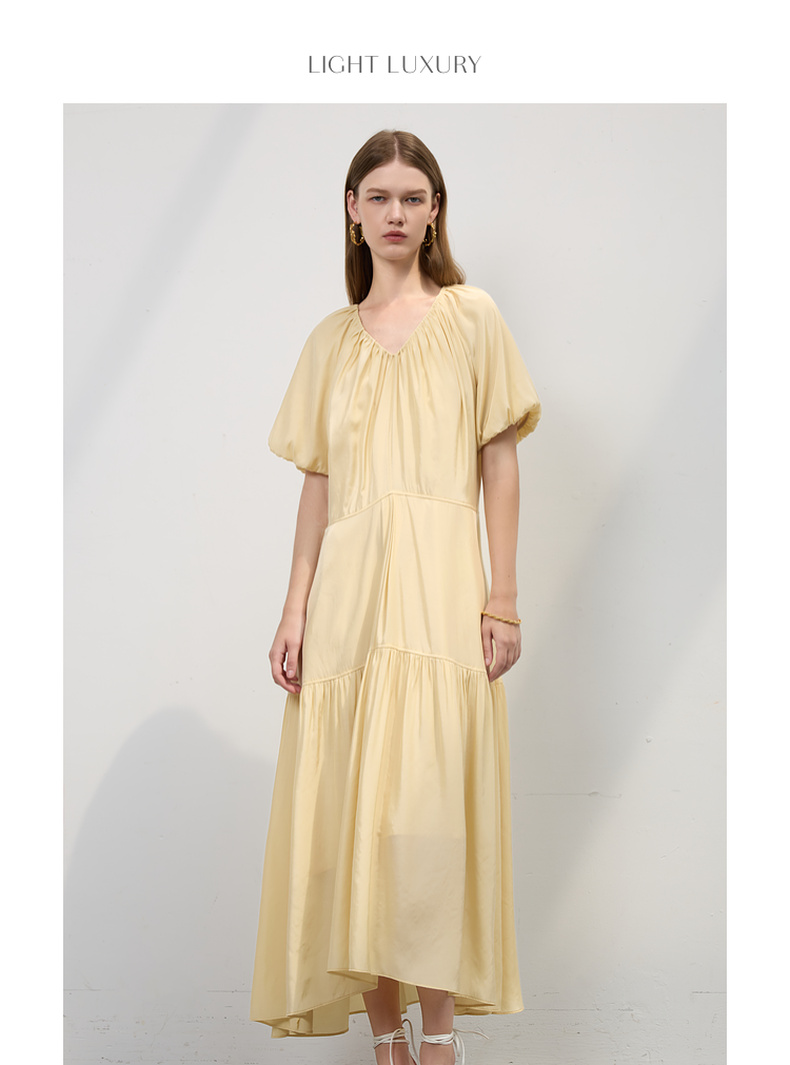 三彩2025夏季新款纯色连衣裙V领宽松A字裙腰绳短袖长裙度假S