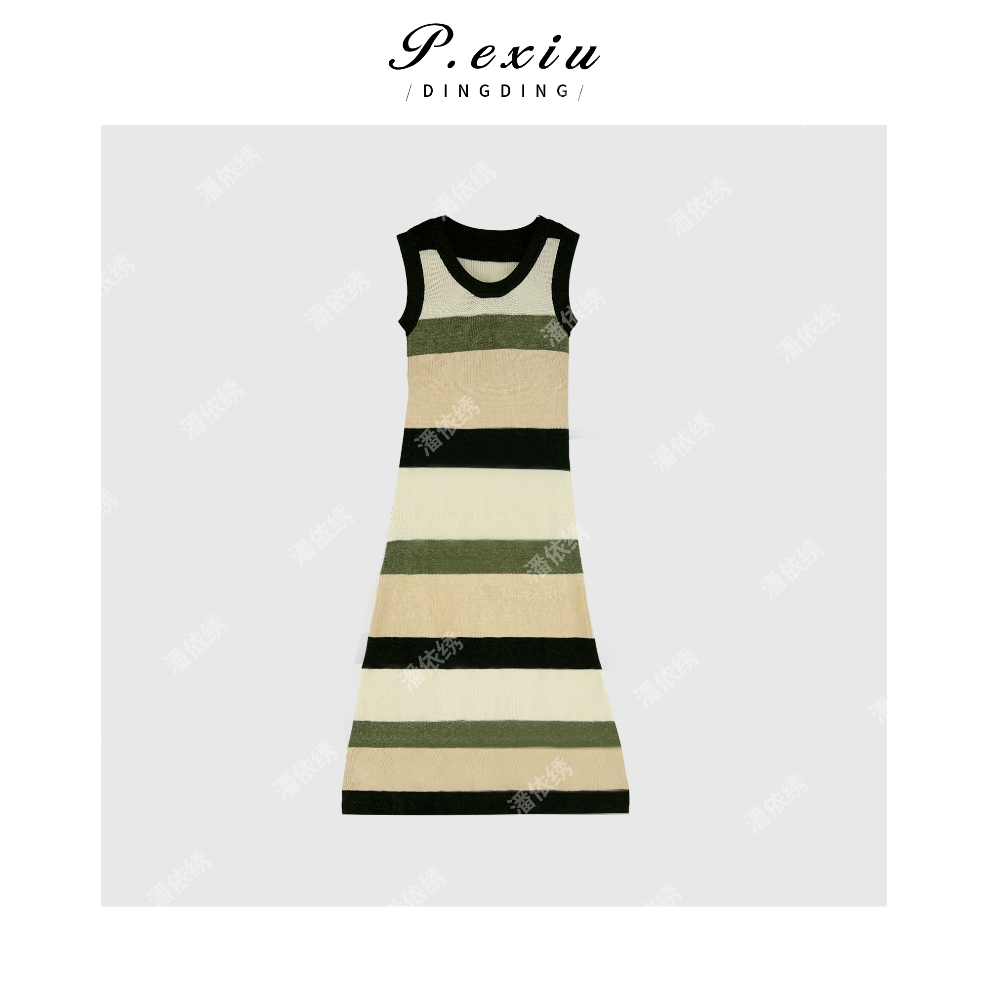 04-3潘依绣丁丁宠粉潘依绣 撞色条纹度假风U领气质针织背心连衣裙 Q5641