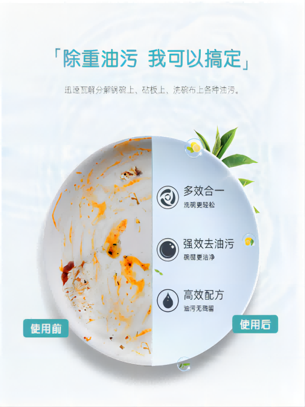 活性去油因子,清洁省量又高效,就连炉灶上锅周围的沉积污垢,也可以清洗的锃光发亮。