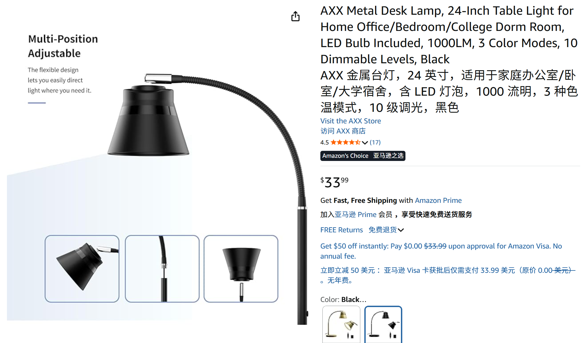 美国 AXX 金属台灯 24 英寸 含 LED 灯泡 高亮度1000 流明10 级调光 3 种色温模式