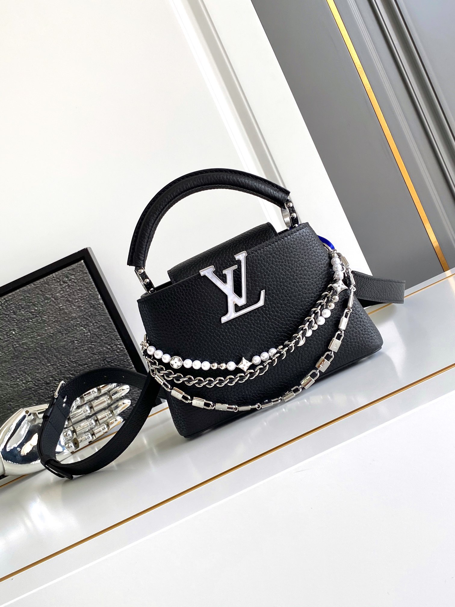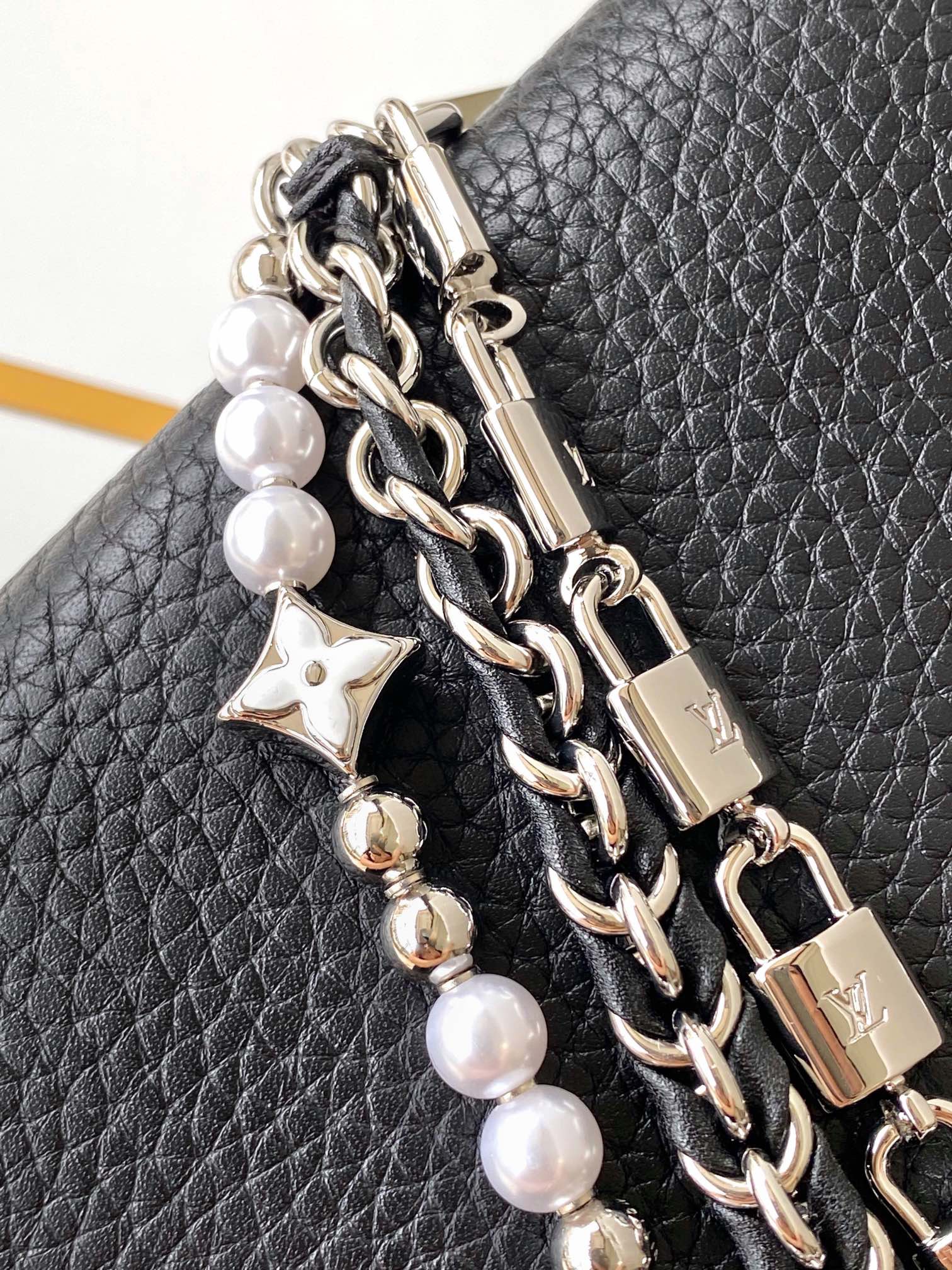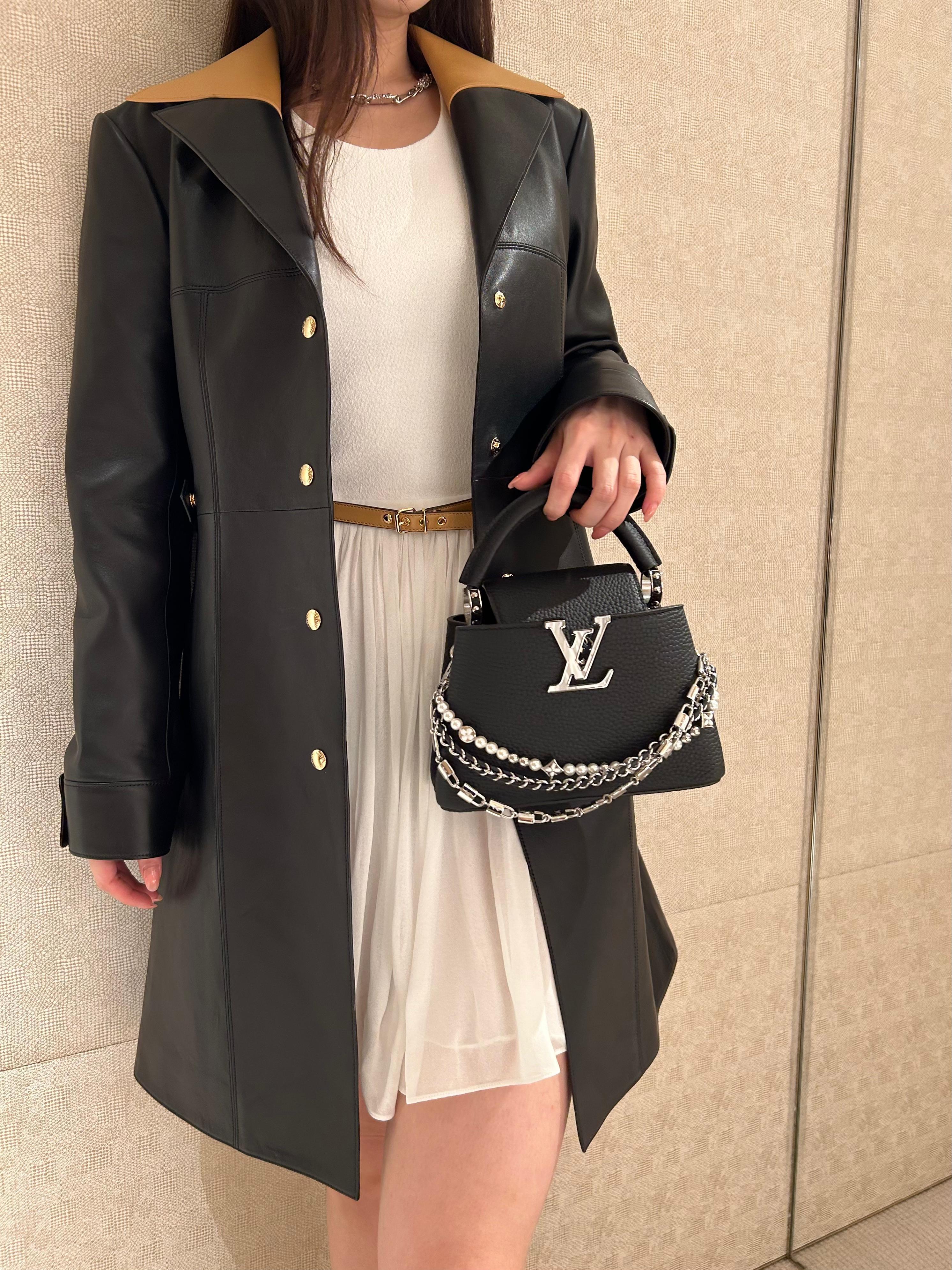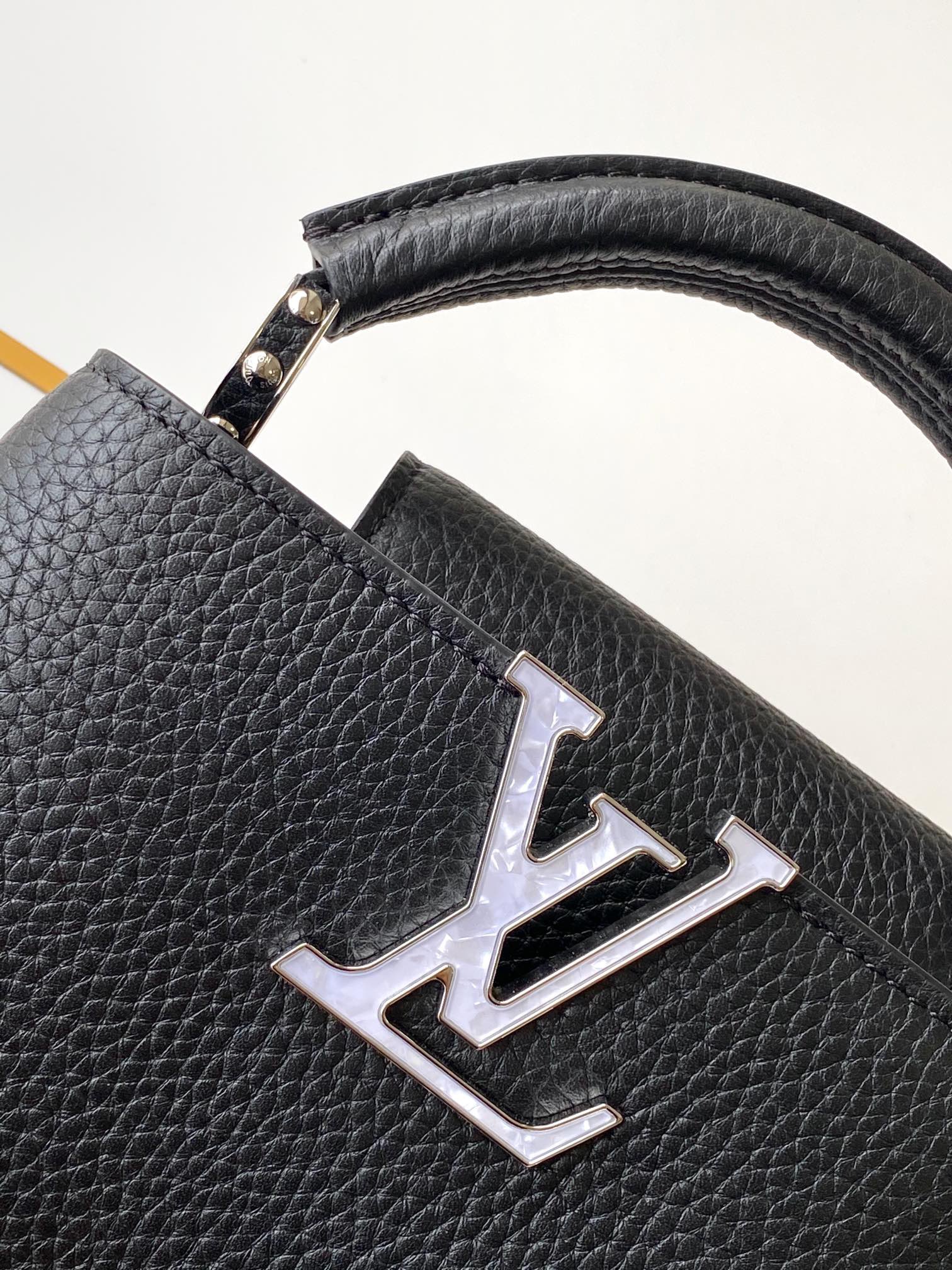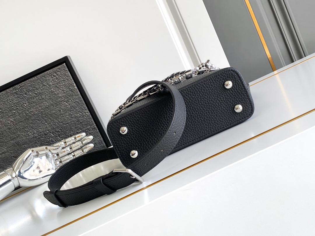 本款 Capucines手袋携经典Taurillon牛皮革加入 Trilogy 系列 令雅致链条呈现贝壳质感 可为晚装造型点亮瞩目一隅 内隔层囊括卡片贴袋