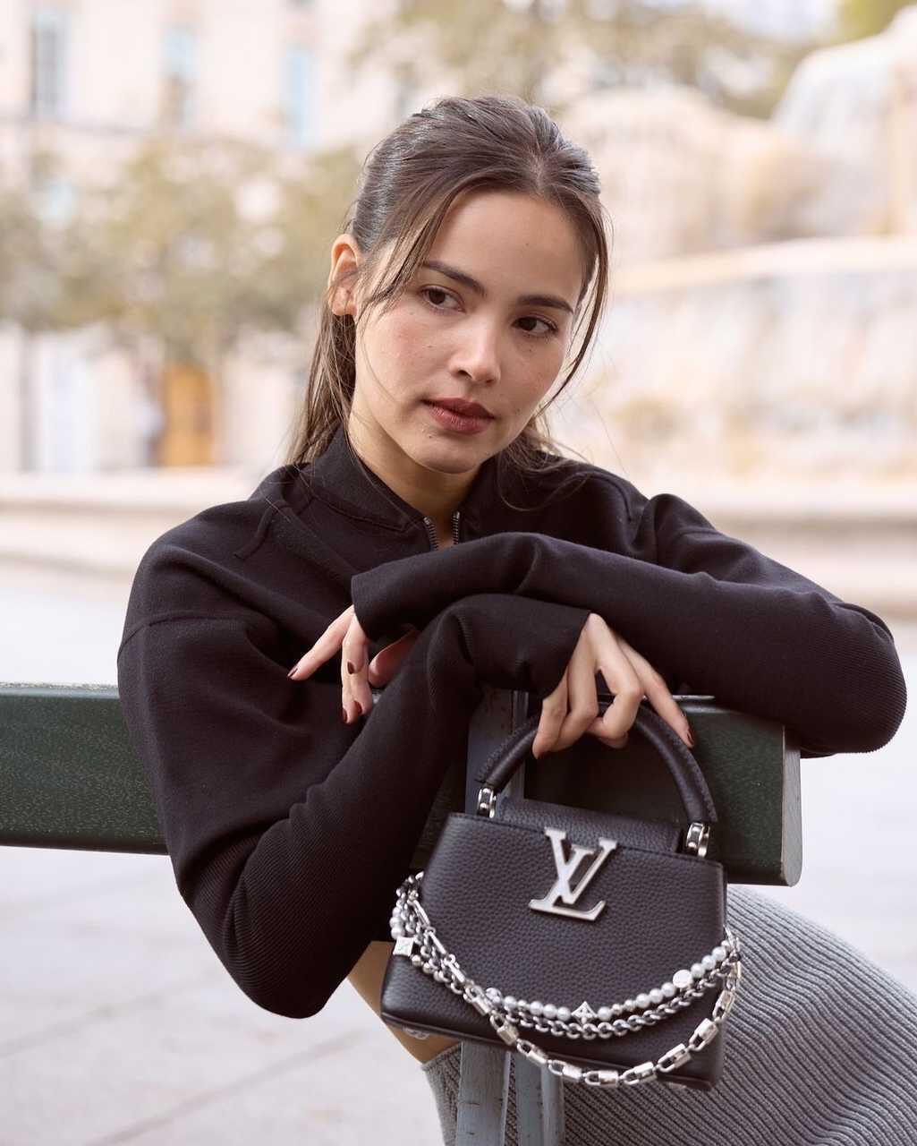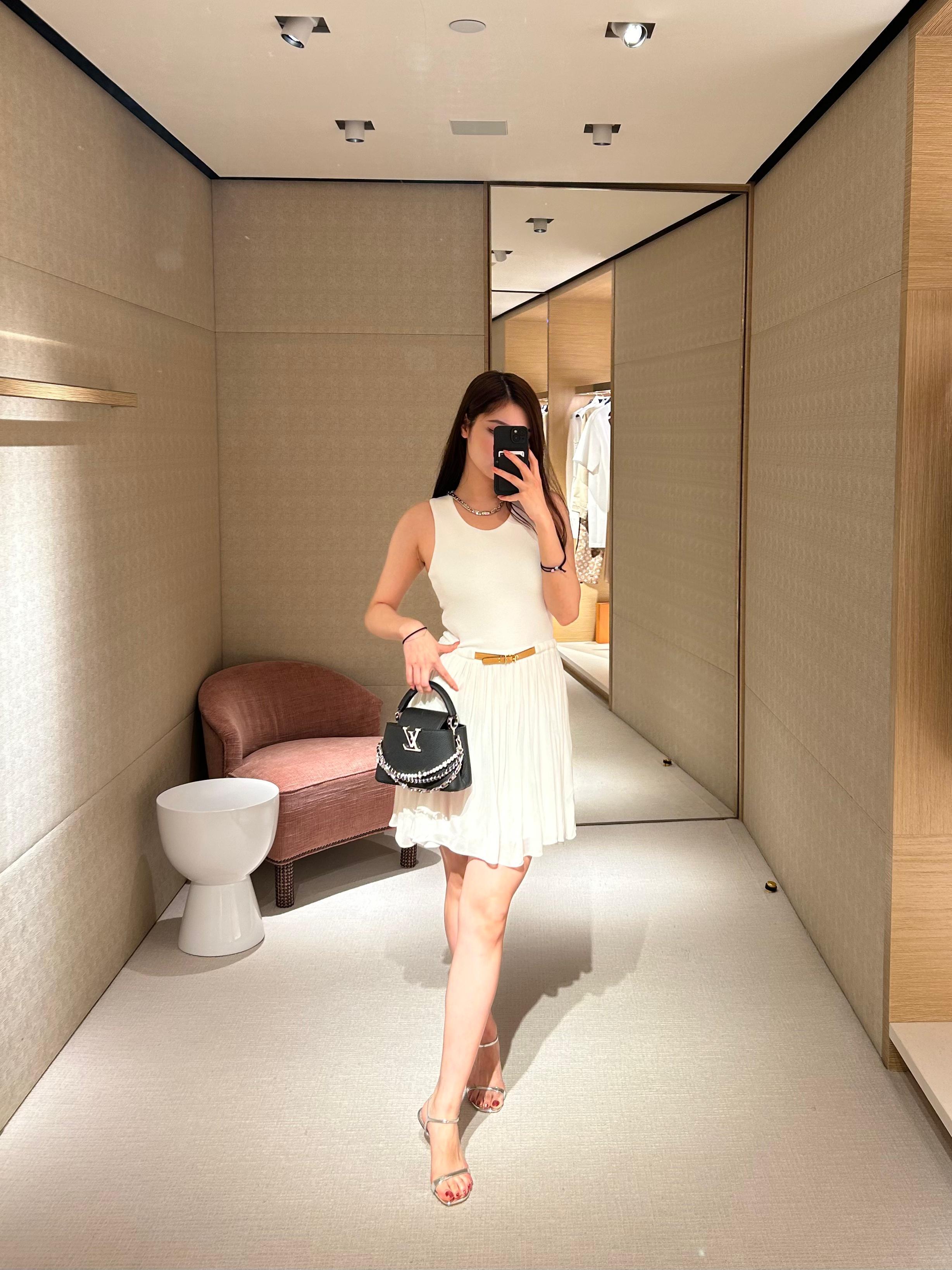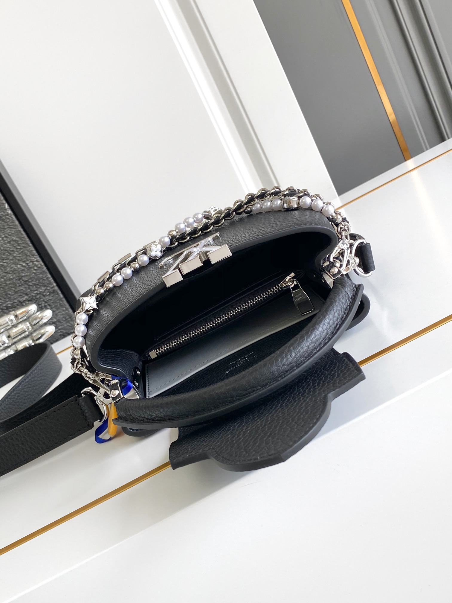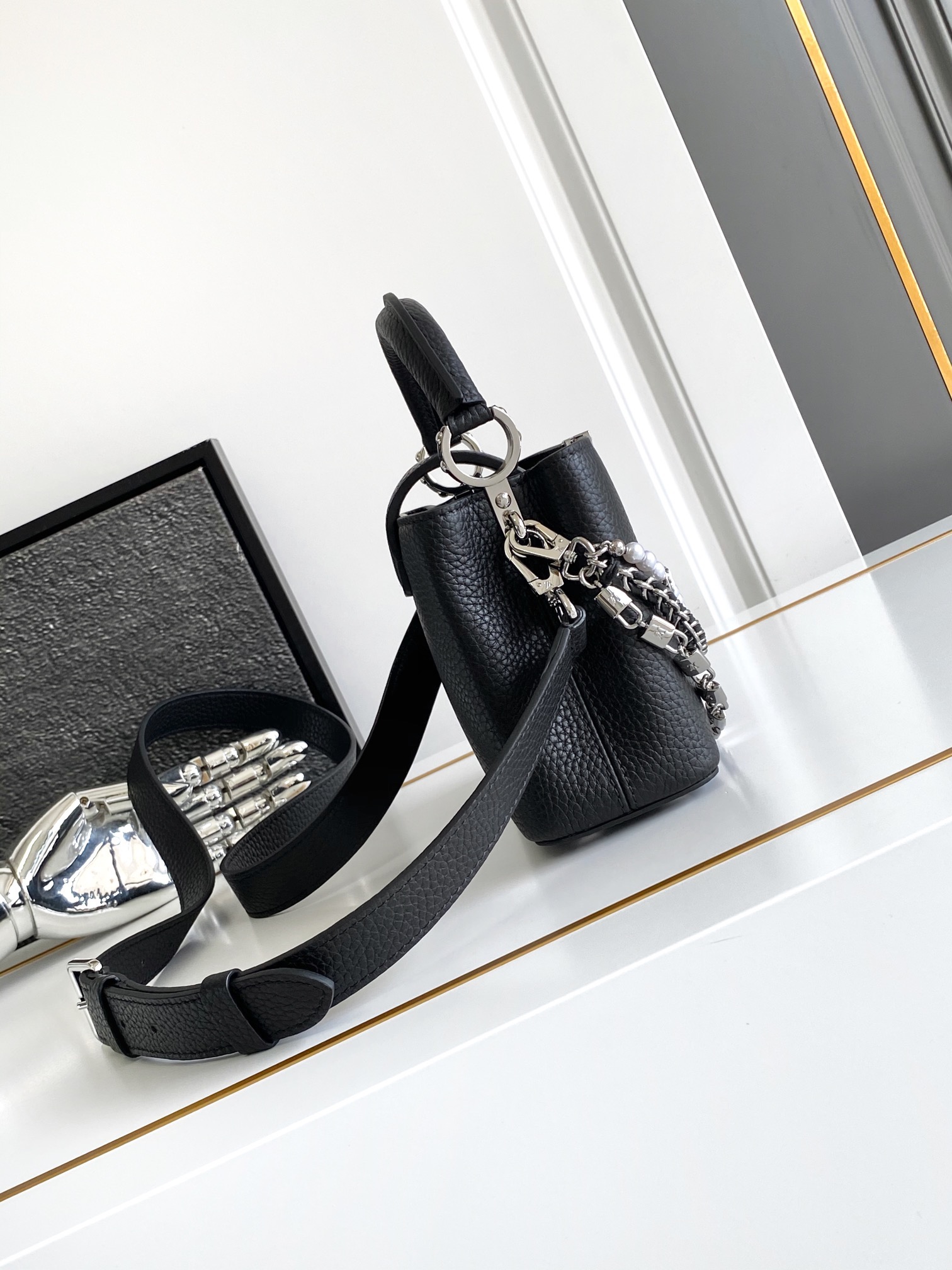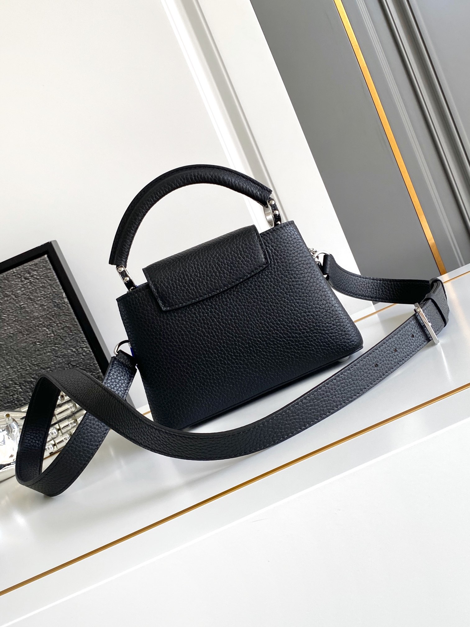 本款 Capucines手袋携经典Taurillon牛皮革加入 Trilogy 系列 令雅致链条呈现贝壳质感 可为晚装造型点亮瞩目一隅 内隔层囊括卡片贴袋
