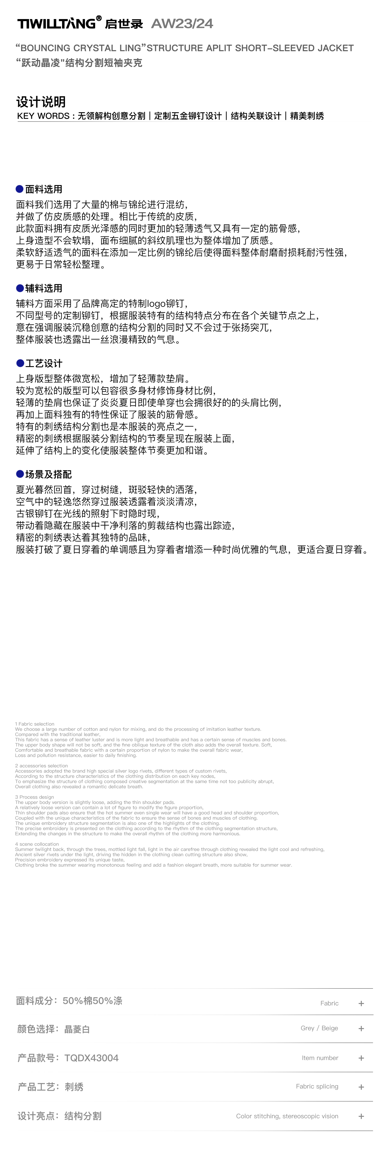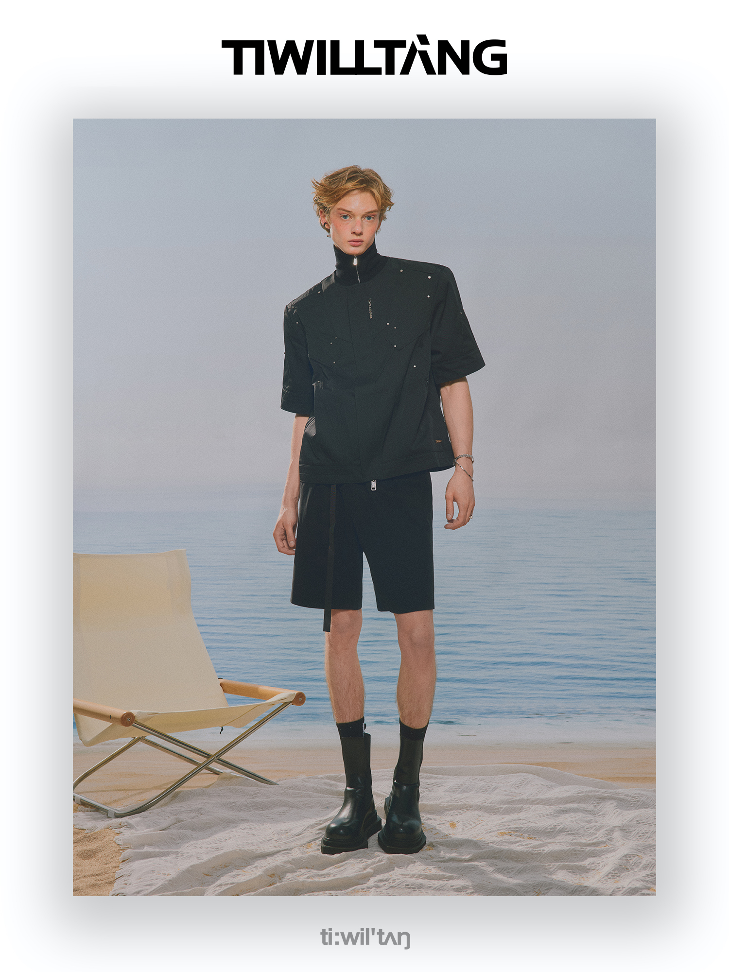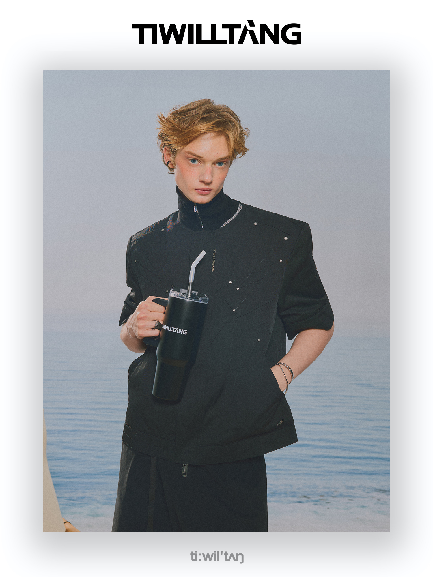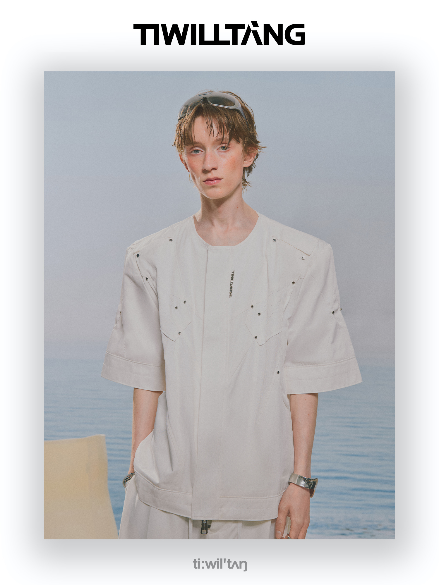 启世录TIWILLTANG“跃动晶凌"无领结构分割短袖夹克夏季刺绣上衣